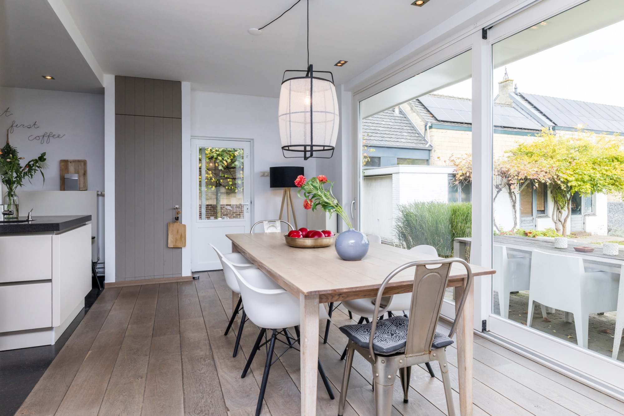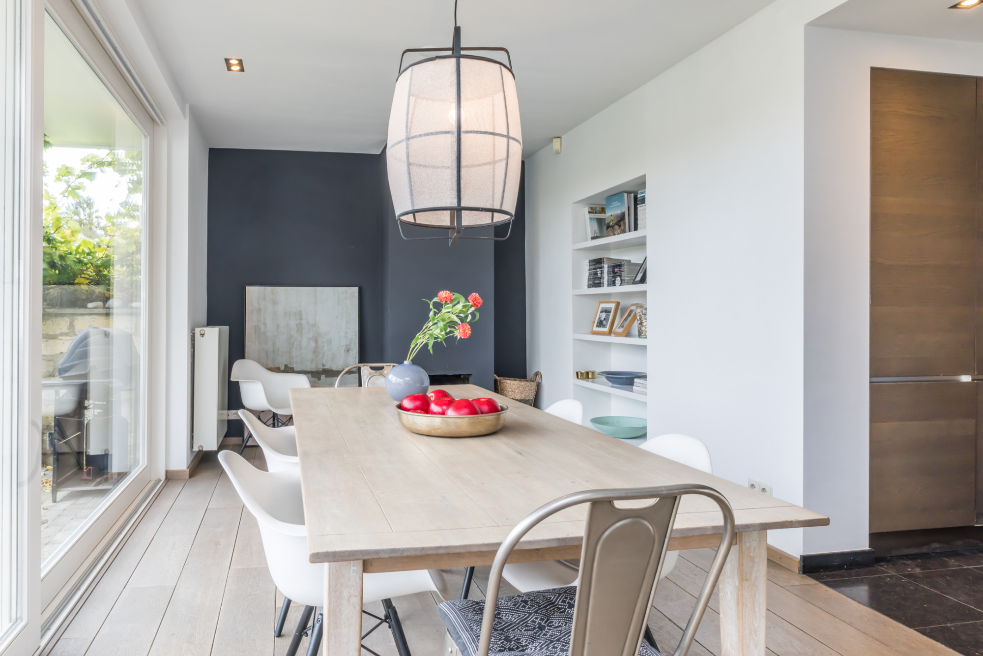 - eetgedeelte voorzien van parketvloer, gashaard en schuifpui naar de tuin