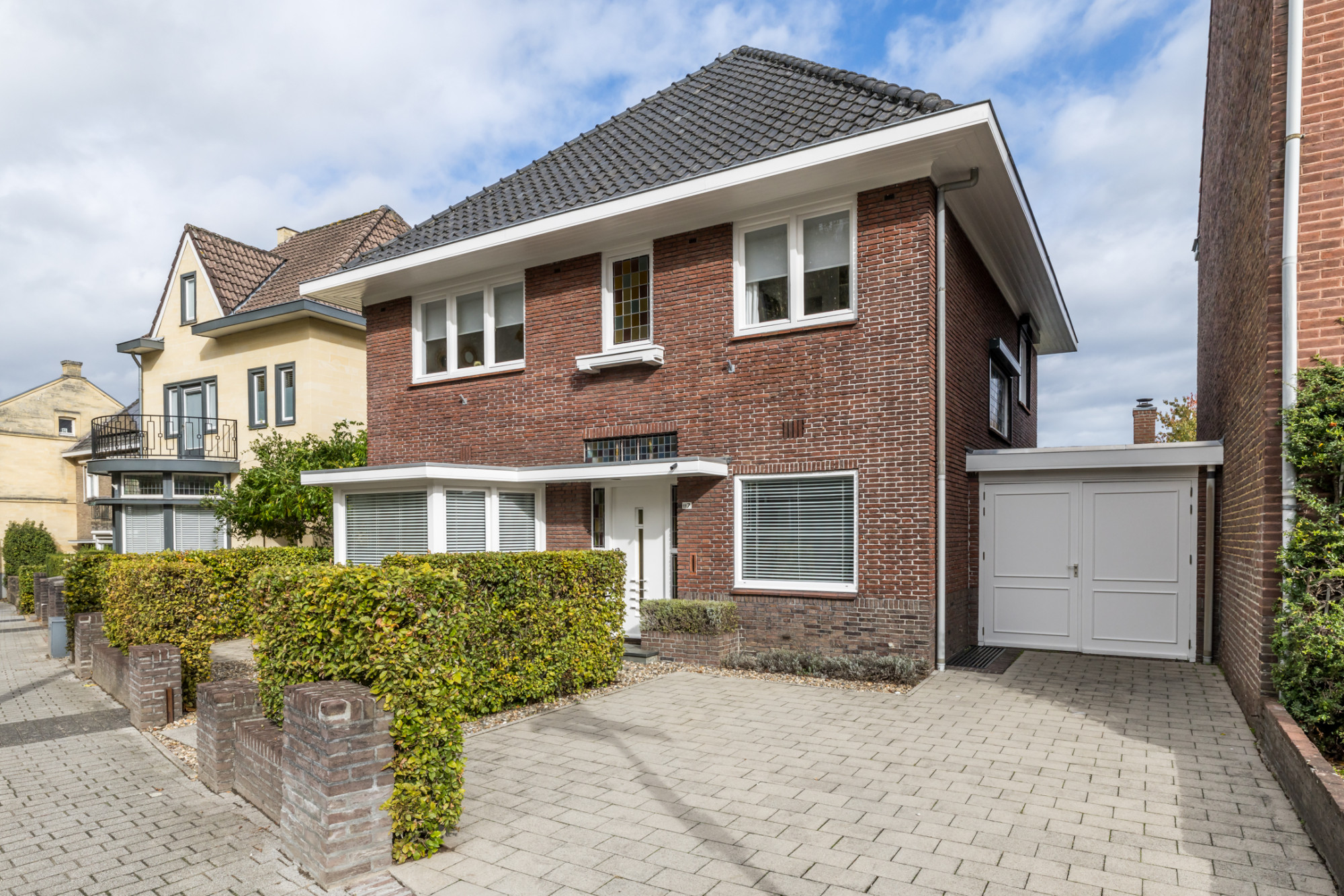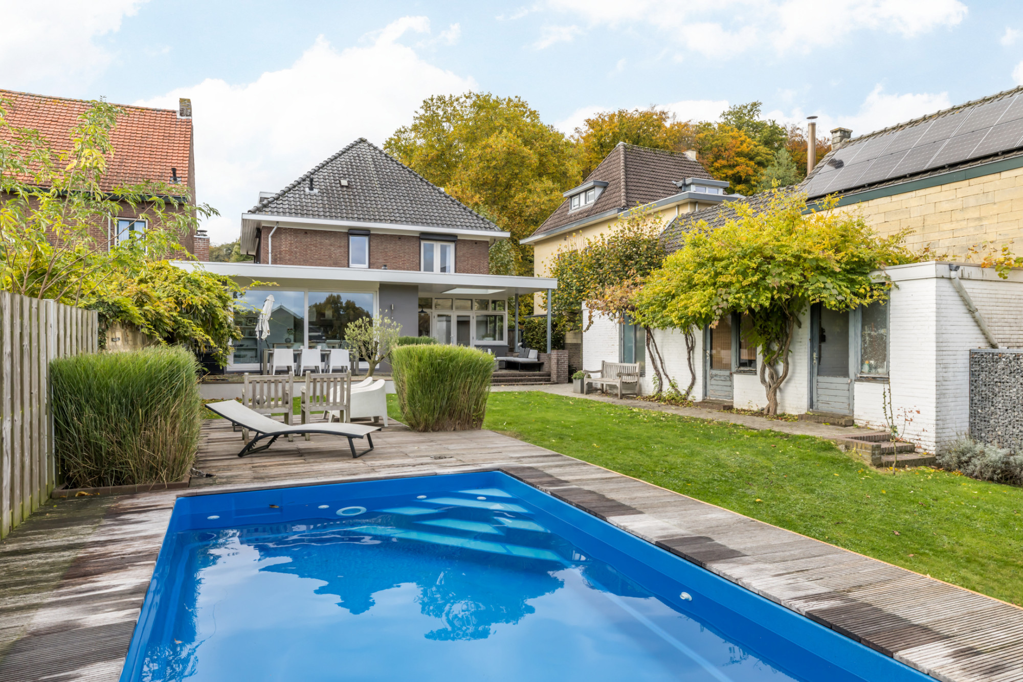 Uniek ruim vrijstaand jaren-30 herenhuis met aanbouw, vrijstaande garage met ruime oprit, riante tuin van bijna 800m² met buitenzwembad en buitenberging met sauna.