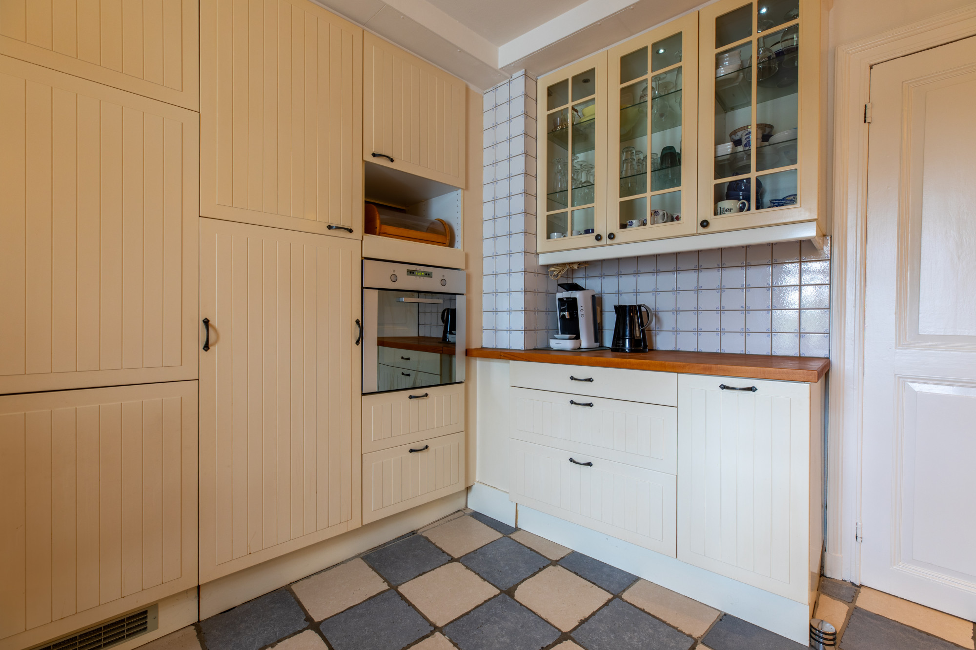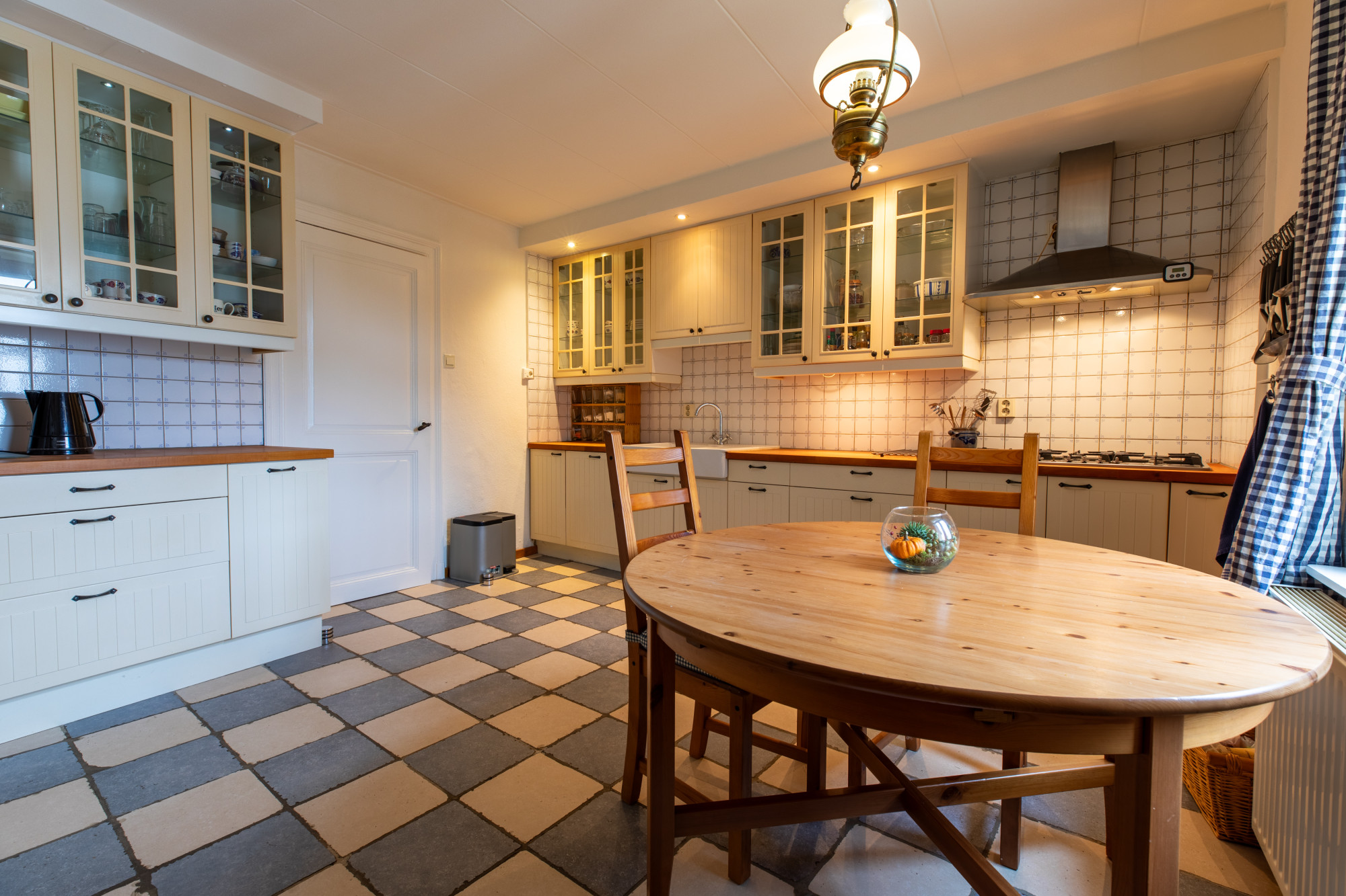 Half open keuken ((4.39 x 3.88 m) voorzien van plavuizenvloer en met nette keukeninrichting (2008) en apparatuur te weten: 6 pits gaskookplaat, afzuigkap, oven, koelkast, vriezer en vaatwasser.