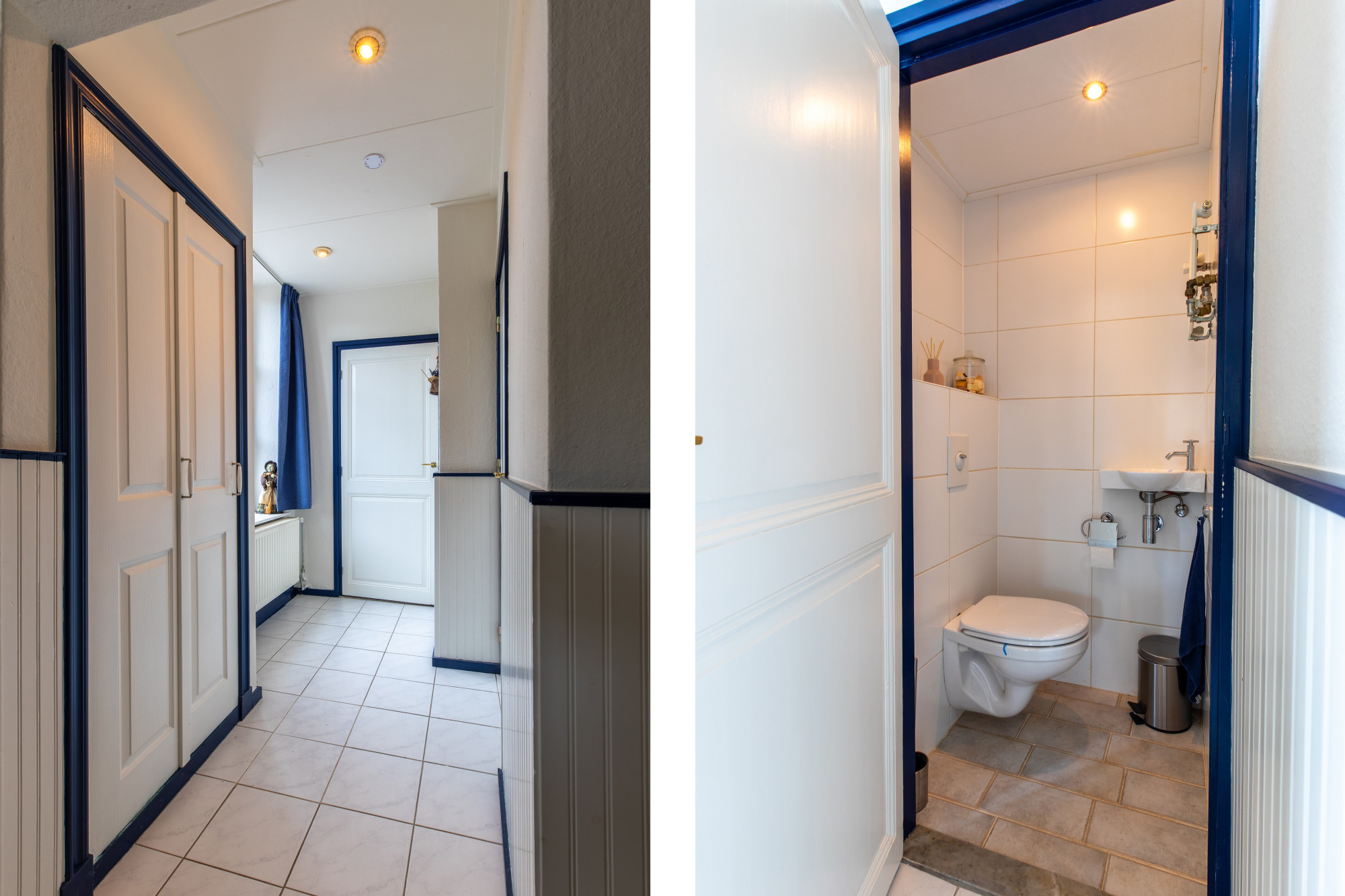 Geheel betegeld moderne toiletruimte met wandcloset en fonteintje.