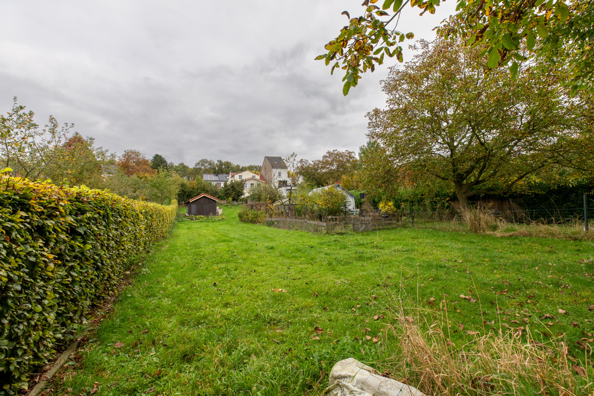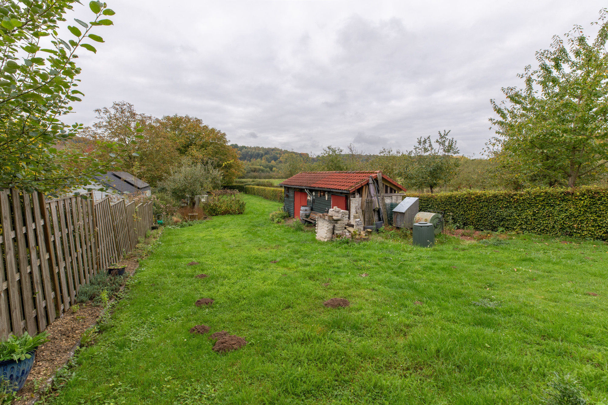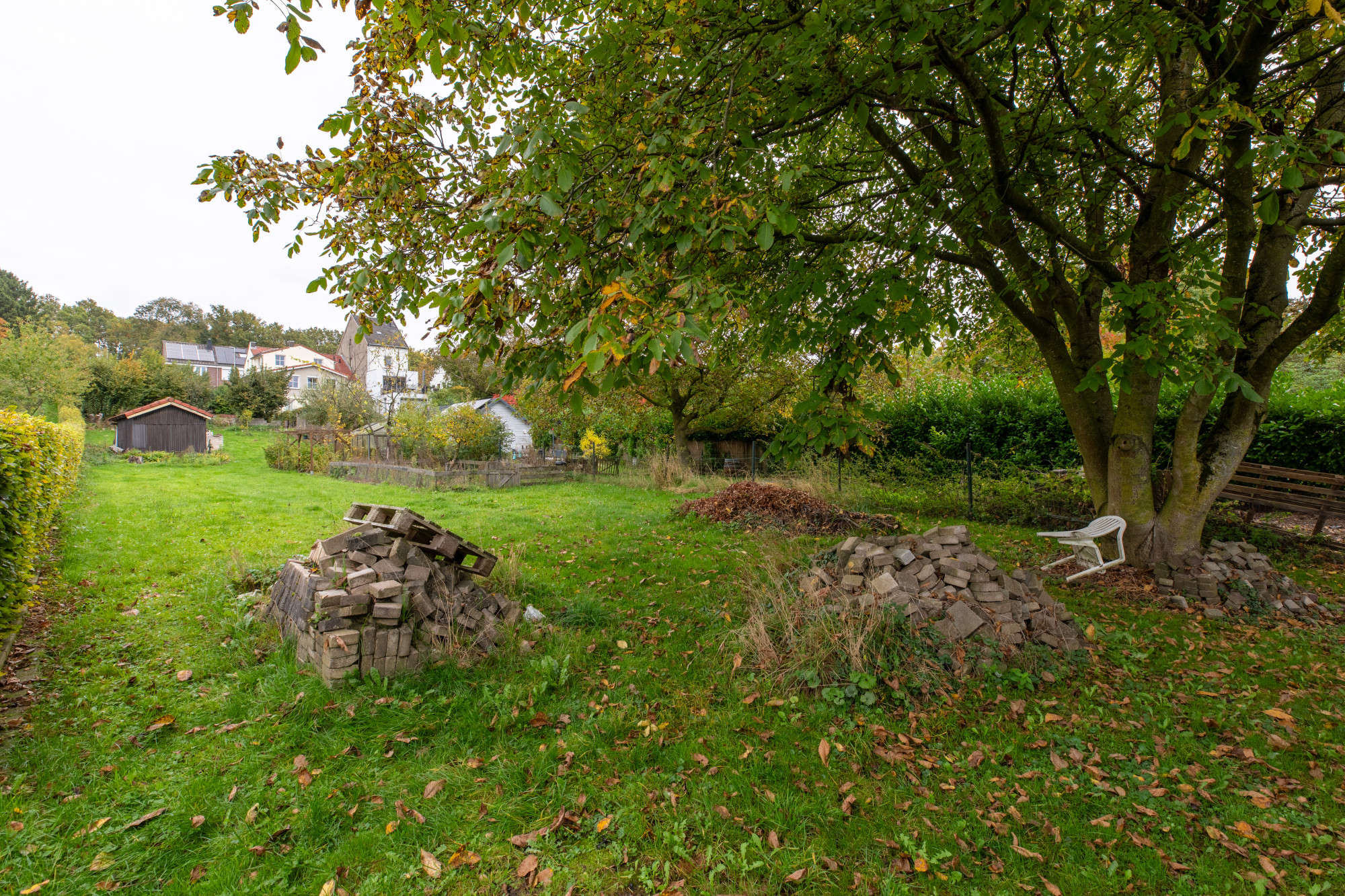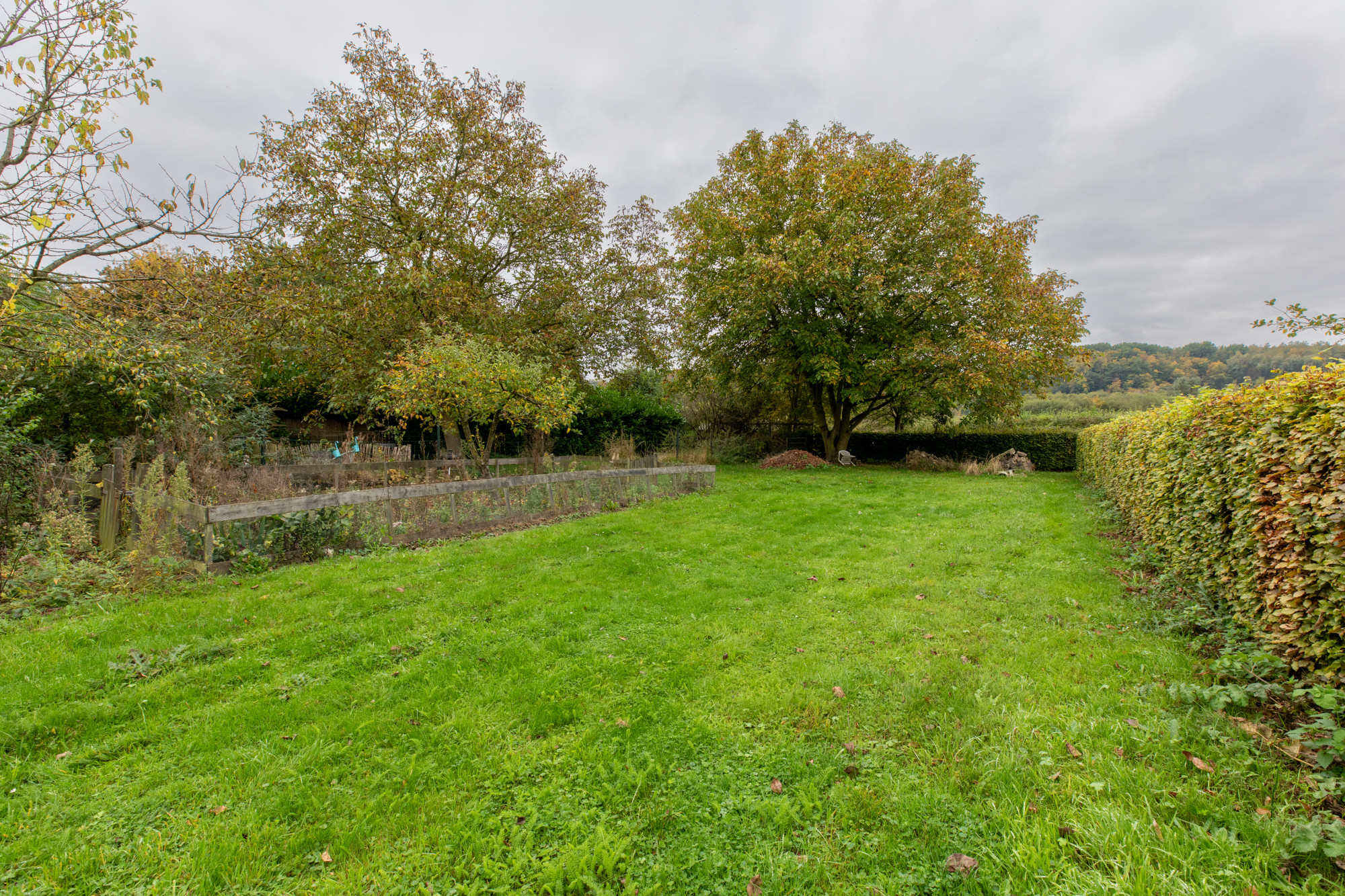 Verder loopt de tuin glooiend naar beneden en is er een ruim gazon, berging en achteringang aanwezig. Een tuin voor kopers die van een buitengebied houden en hun eigen creatieve ideeën willen uitvoeren.