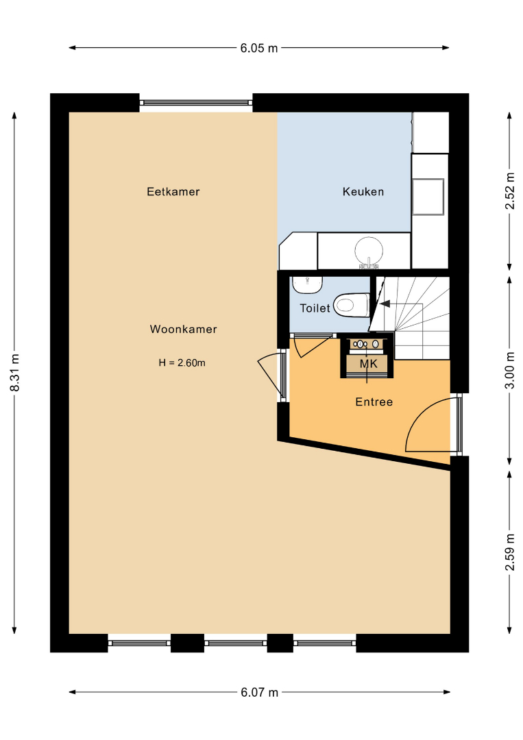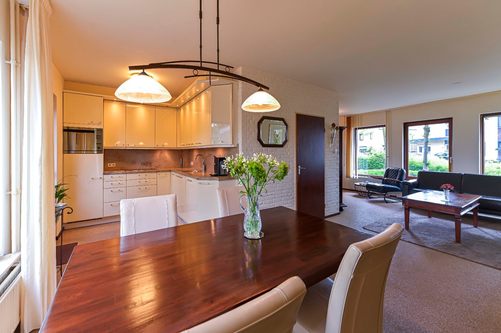 Begane grond: entree met grindvloer, garderobe en meterkast. Toilet met fonteintje. L-vormige woonkamer, tevens voorzien van grindvloer. Open keuken (2000) met granieten keukenblad en inbouwapparatuur zoals: koelkast, 4-pits inductiekookplaat, afzuigkap, combimagnetron en vaatwasser. Middels enkele deur vanuit de woonkamer toegang tot de ruime tuin welke op het noorden is gelegen en beschikt over veel privacy. Vrijstaande garage met kantelpoort, verwarming en spoelbak.