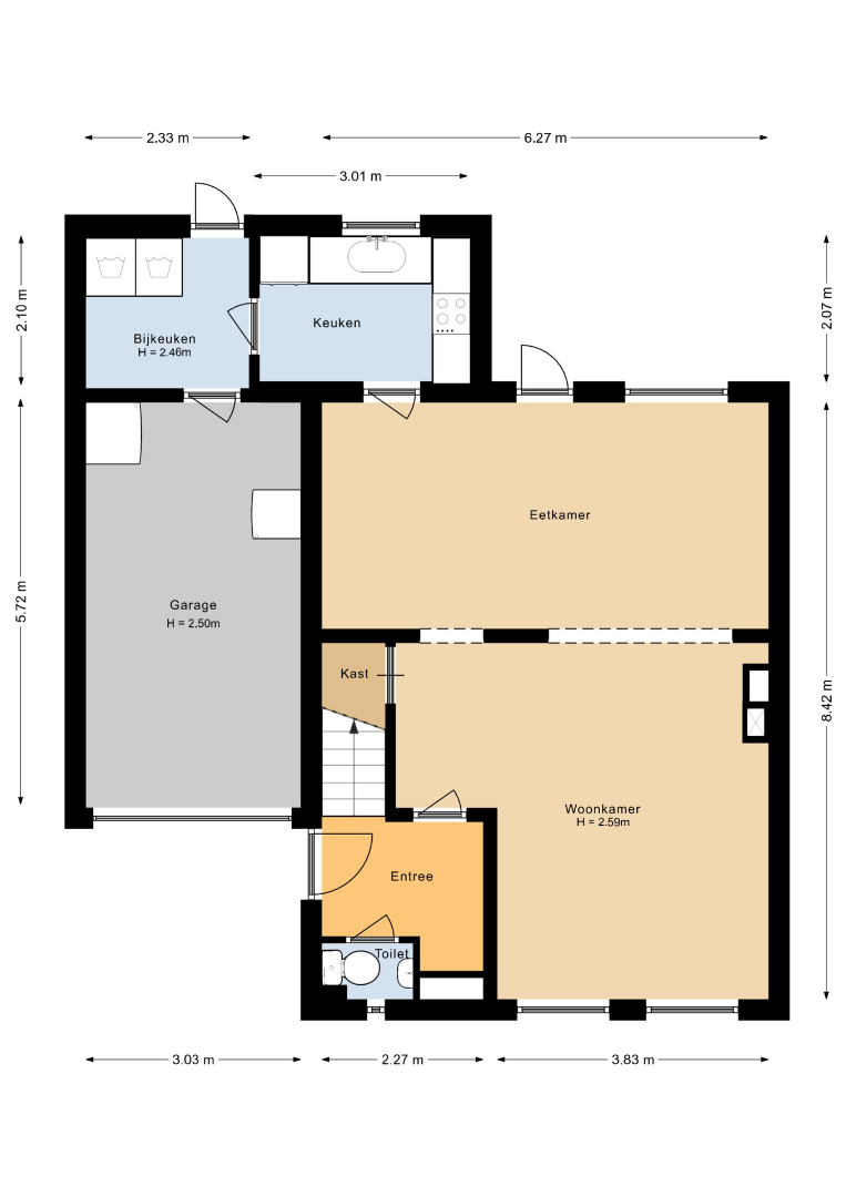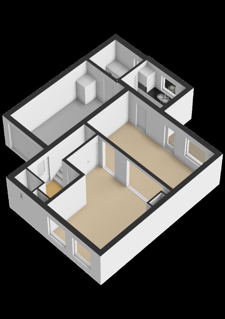 Indeling: entree met garderobe en PVC vloer. Toilet met fonteintje (staand toilet is in 2014 vervangen). L- vormige woonkamer met PVC vloer (2022), stucwerk wanden, trapkast en gashaard. Gesloten keuken in 2004 voorzien van composiet aanrechtblad met spoelbak (1,5) en inbouwapparatuur zoals: koelkast, 4-pits inductie kookplaat (2020), afzuigkap (2023), combi magnetron (2020), vaatwasser en keukenboiler (2022). Bijkeuken met witgoedaansluiting. Inpandige garage (17 m2) voorzien van elektrisch te bedienen sectionaalpoort (2000).