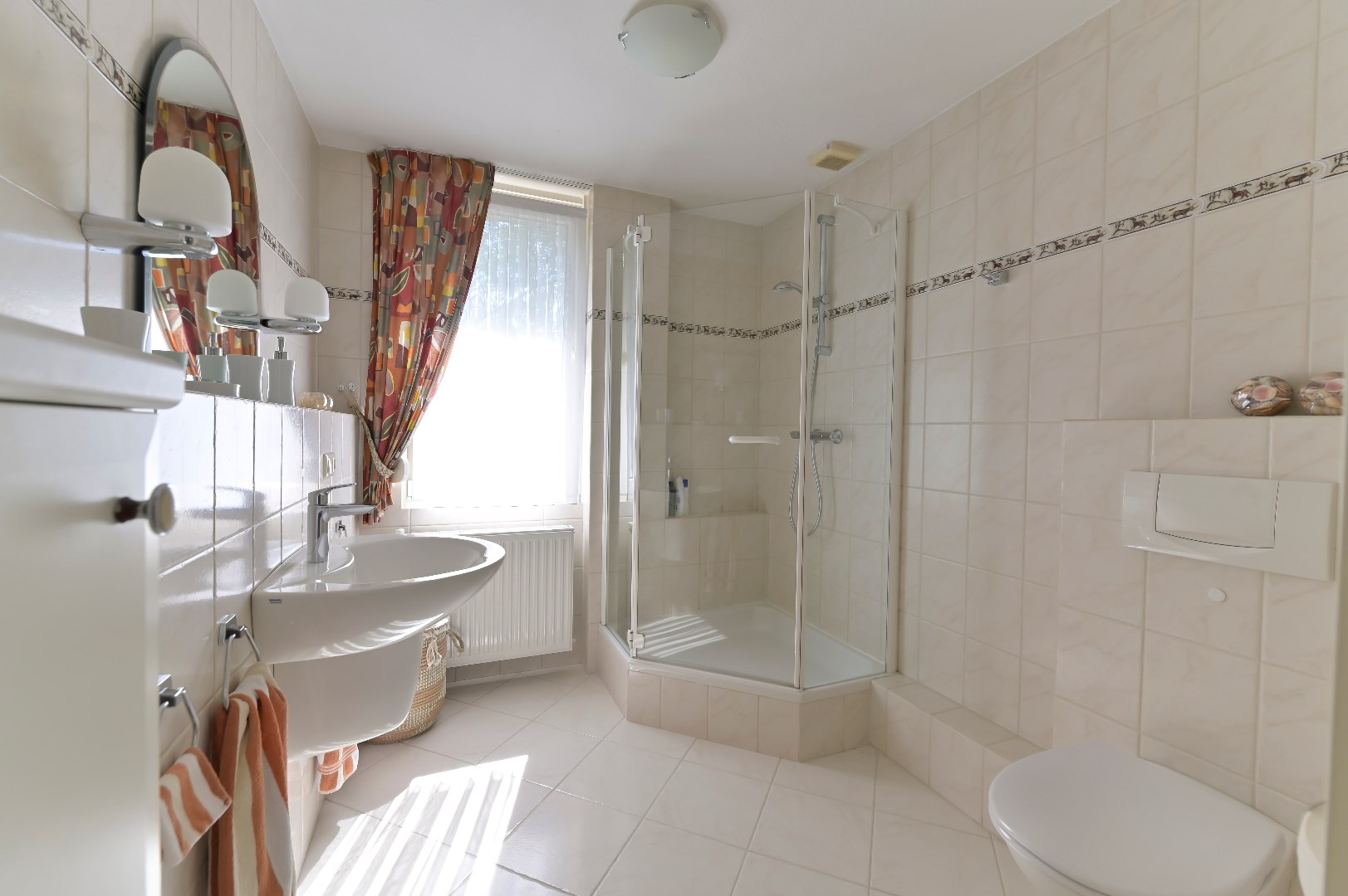 1ste verdieping: overloop met laminaatvloer. 2 slaapkamers van 16 m2 en 1 slaapkamer van 7 m2 allen voorzien van laminaatvloer. Badkamer (1997) met douche, wastafel met meubel, 2de toilet (zwevend), radiator en elektrische vloerverwarming.