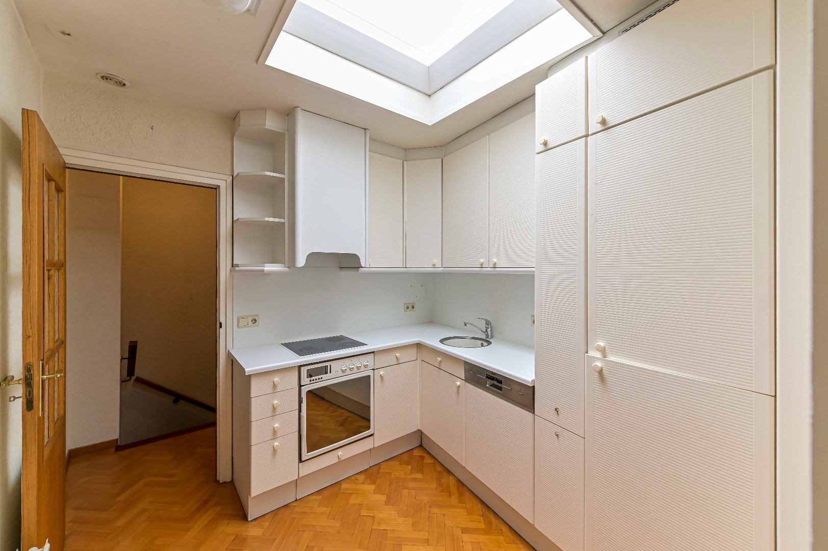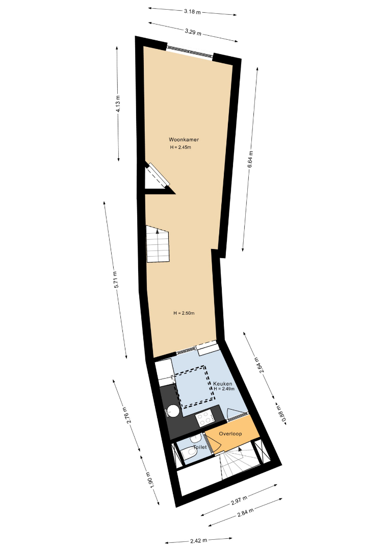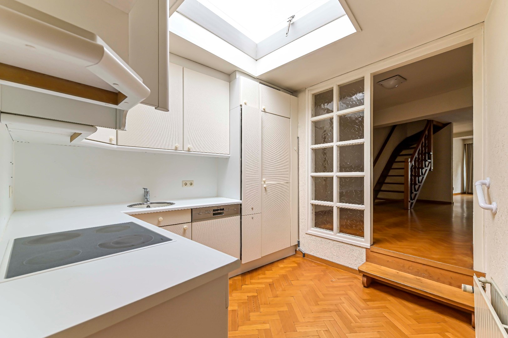 Vanuit de keuken begane grond is de bovenwoning via een vaste trap bereikbaar. Overloop met massieve parketvloer en granol wanden. Toilet voorzien van parketvloer, zwevend toilet en fonteintje. Halfopen keuken met parketvloer met lichtinval via lichtkoepel. Keukenblok is voorzien van inbouwapparatuur zoals 4-pits kookplaat (Atag), oven, koel/vriescombinatie en vaatwasser (Siemens). Via een optrede (split level) is de woonkamer bereikbaar. De woonkamer beschikt over een massieve parketvloer, granol wanden, openhaard en trapopgang naar de 2de verdieping.