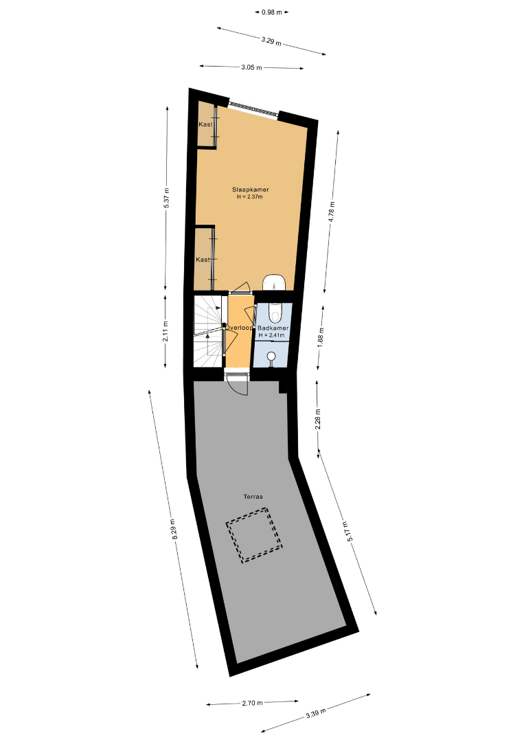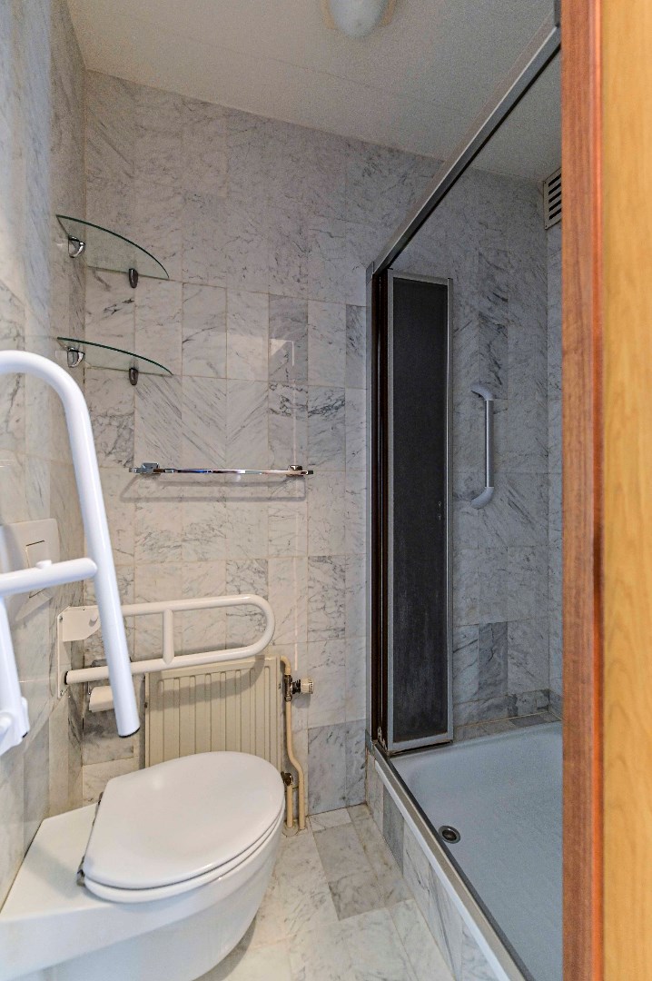 Overloop voorzien van massieve parketvloer biedt toegang tot een slaapkamer, badkamer, dakterras en trapopgang naar de 3de verdieping. Het dakterras is voorzien van tegels. Slaapkamer met inbouwkastenwand en wastafel. Badkamer met douchecabine en zwevend toilet.