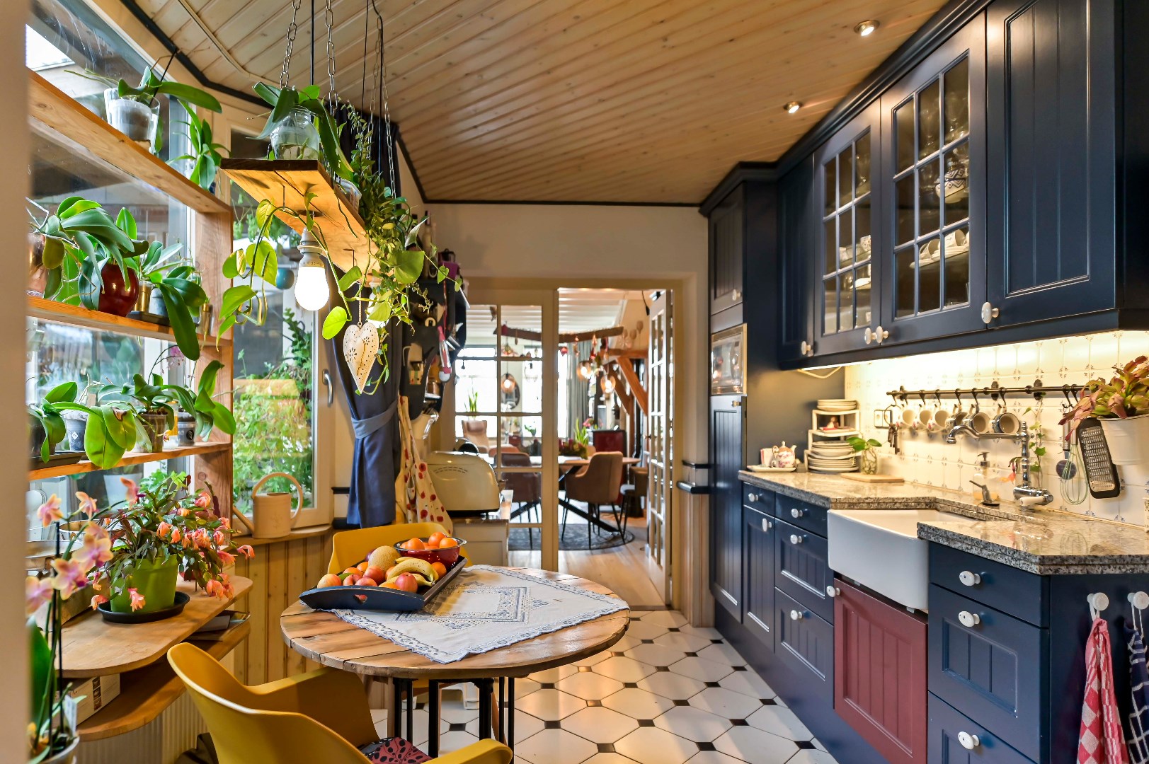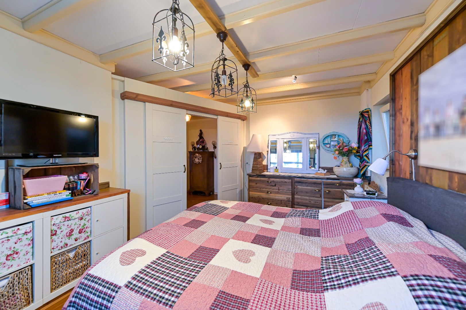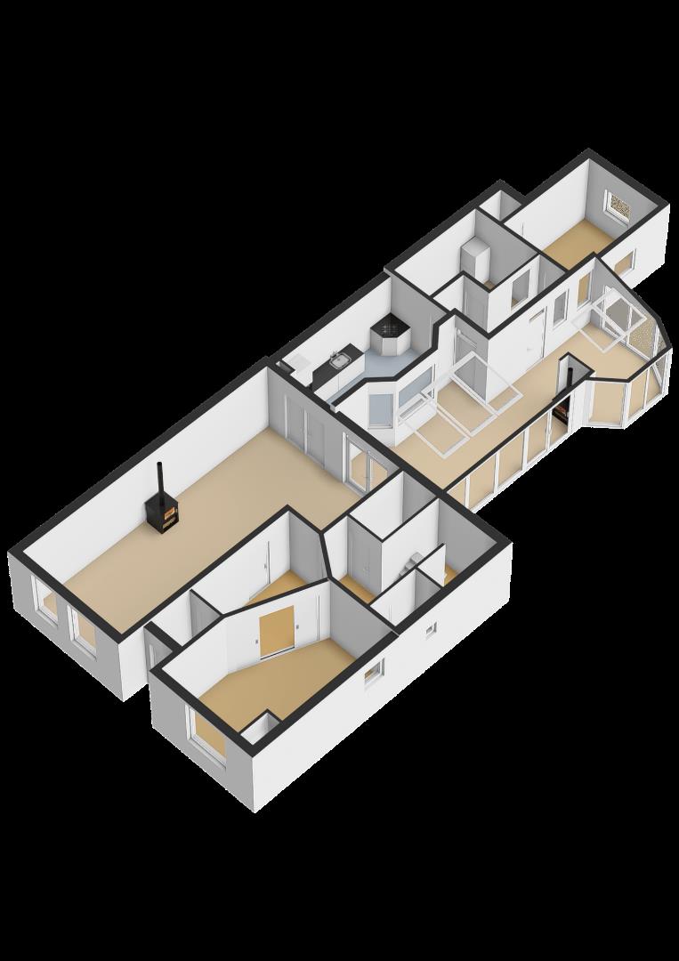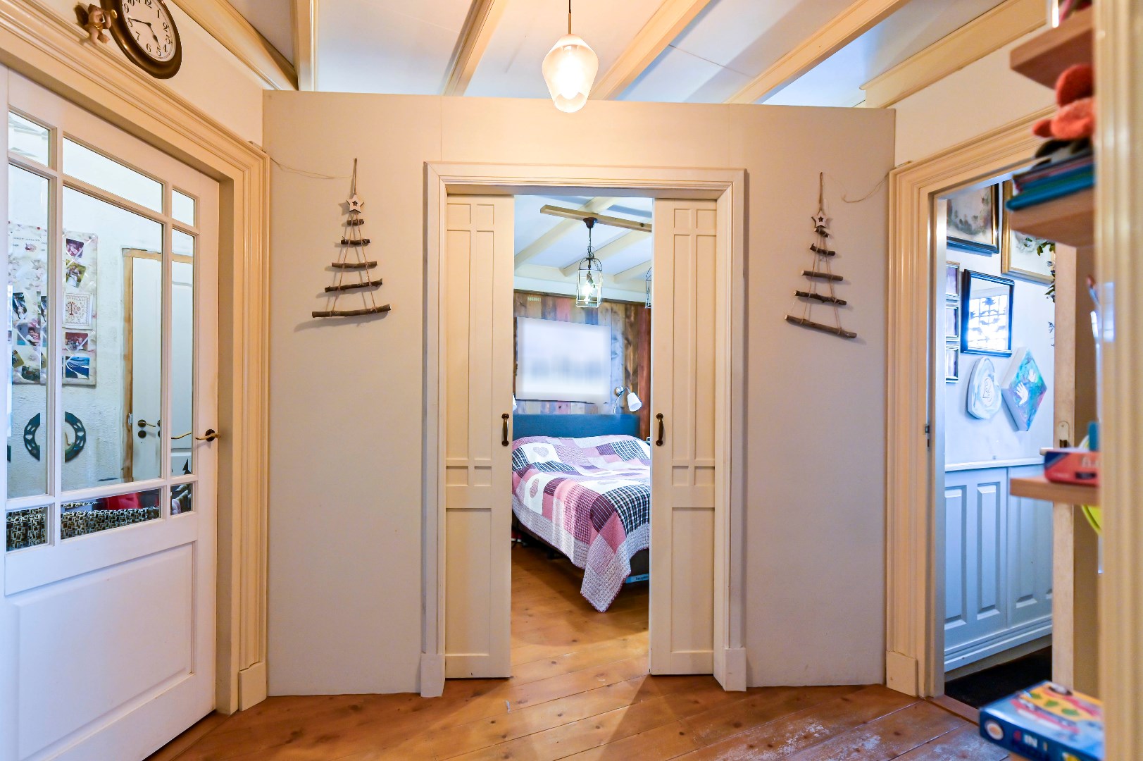 Hal met houtenvloer. Toilet met fonteintje. Woonkamer met houten vloer en palletkachel (welke ter overname wordt aangeboden) en openslaande deuren welke toegang geven tot de serre. Leefkeuken (1998) met granieten aanrechtblad en inbouwapparatuur zoals; koelkast (2023), afzuigkap, 5 pits gaskookplaat (2021) en oven. Bijkeuken met witgoedaansluiting en CV-opstelling (Nefit uit omstreeks 2000). Hobbykamer/speelkamer met tegelvloer en muurkast . Slaapkamer voorzien van massieve houtenvloer.