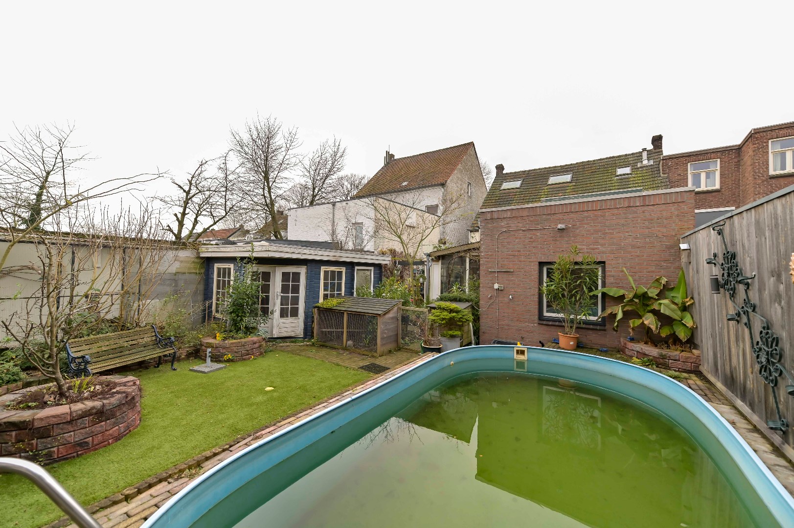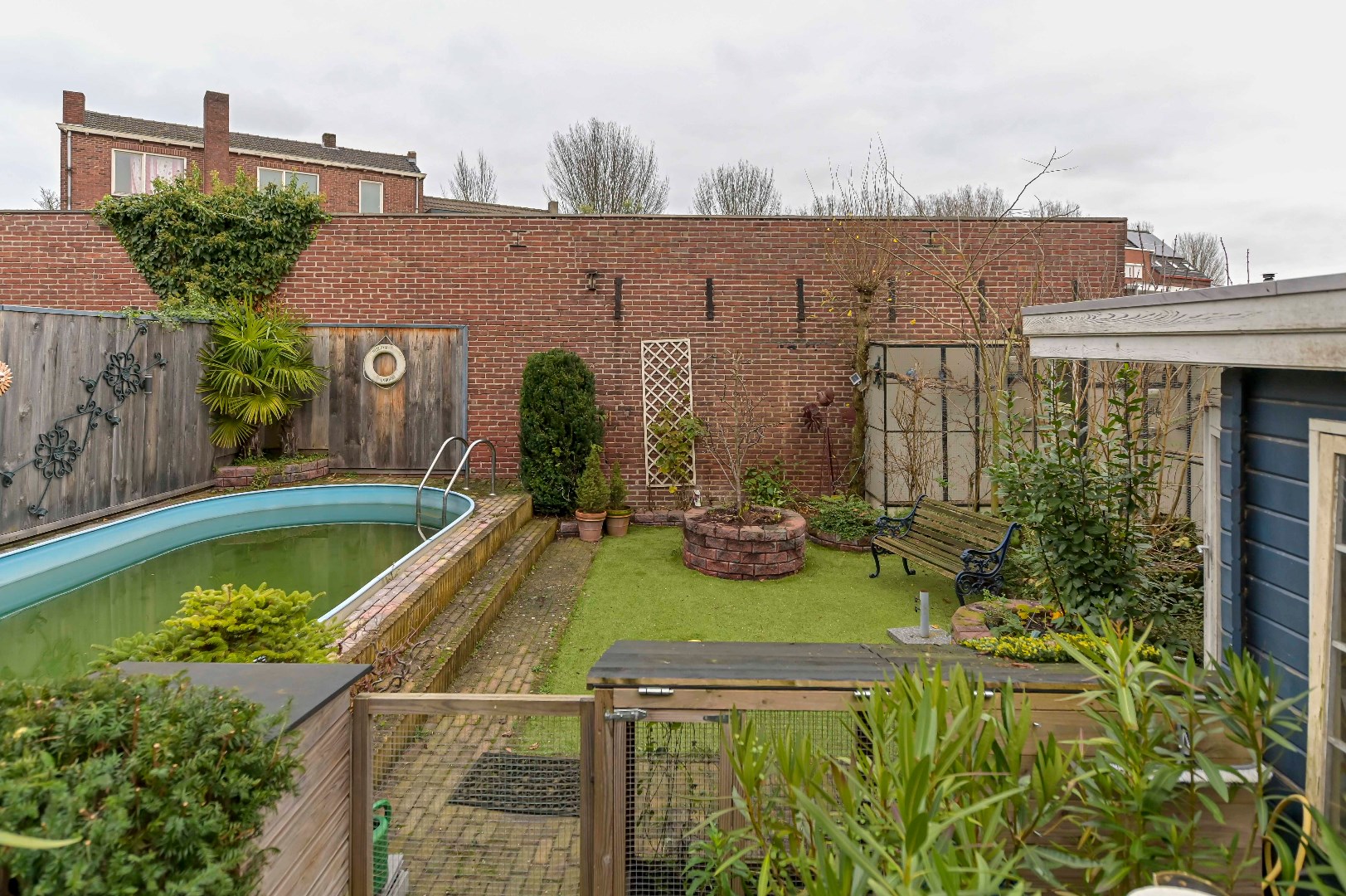 Nabij het centrum en station gelegen ruim geschakeld woonhuis met tuinkamer, ruime tuin op het noorden met zwembad en vrije achterom.