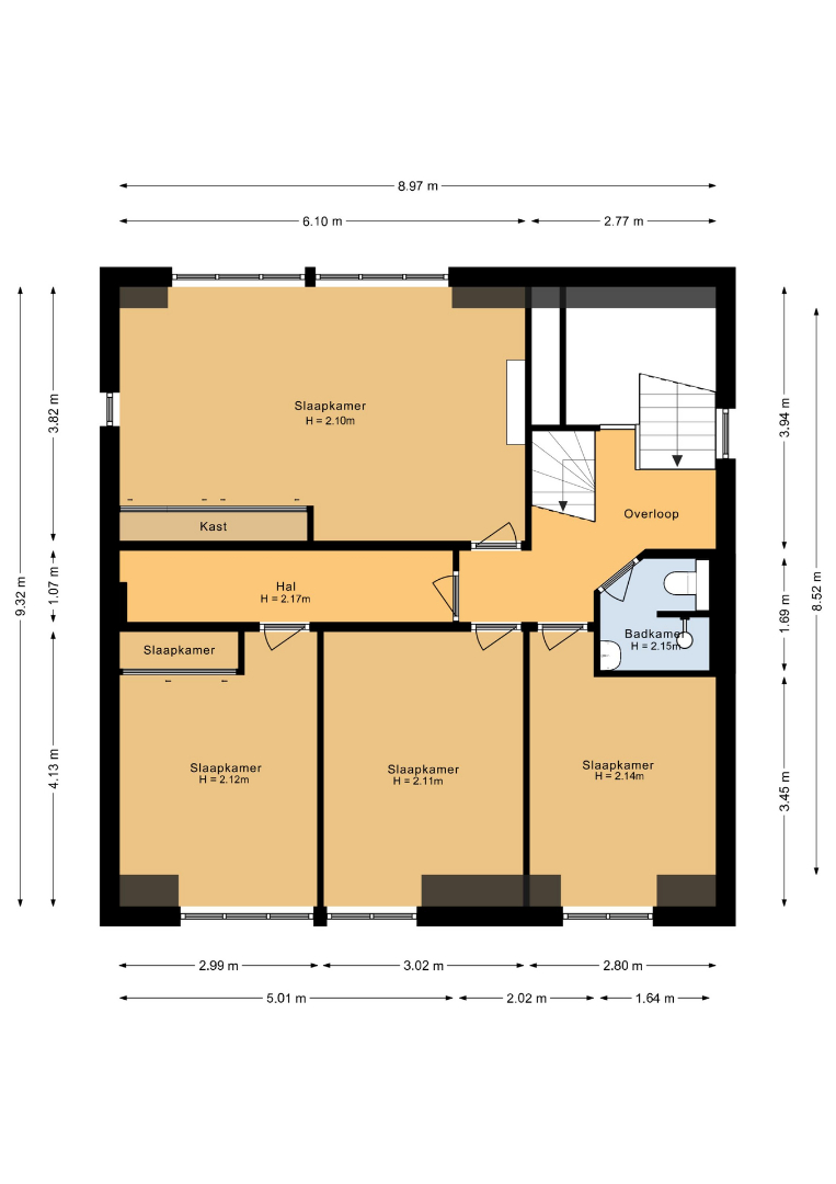 Overloop met houtenvloer. 4 slaapkamers met tapijt waarvan twee slaapkamers zijn voorzien van muurkast. Badkamer (2003) met douche, wastafel en zwevend toilet (zwevend).