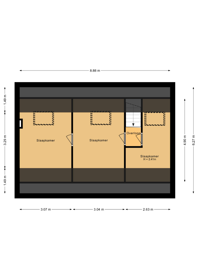 Twee slaapkamers beide voorzien van tapijt en Velux dakraam. Zolderruimte bevindt zich aangrenzend aan een van de slaapkamers en is tevens voorzien van een Velux dakraam.