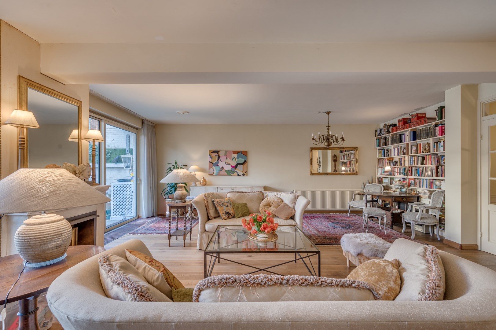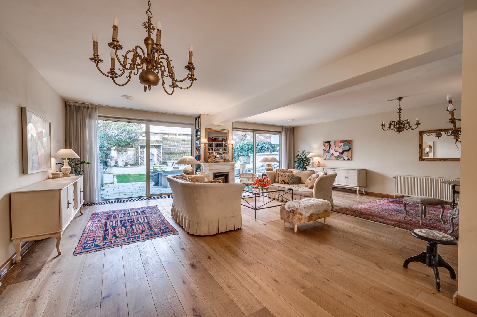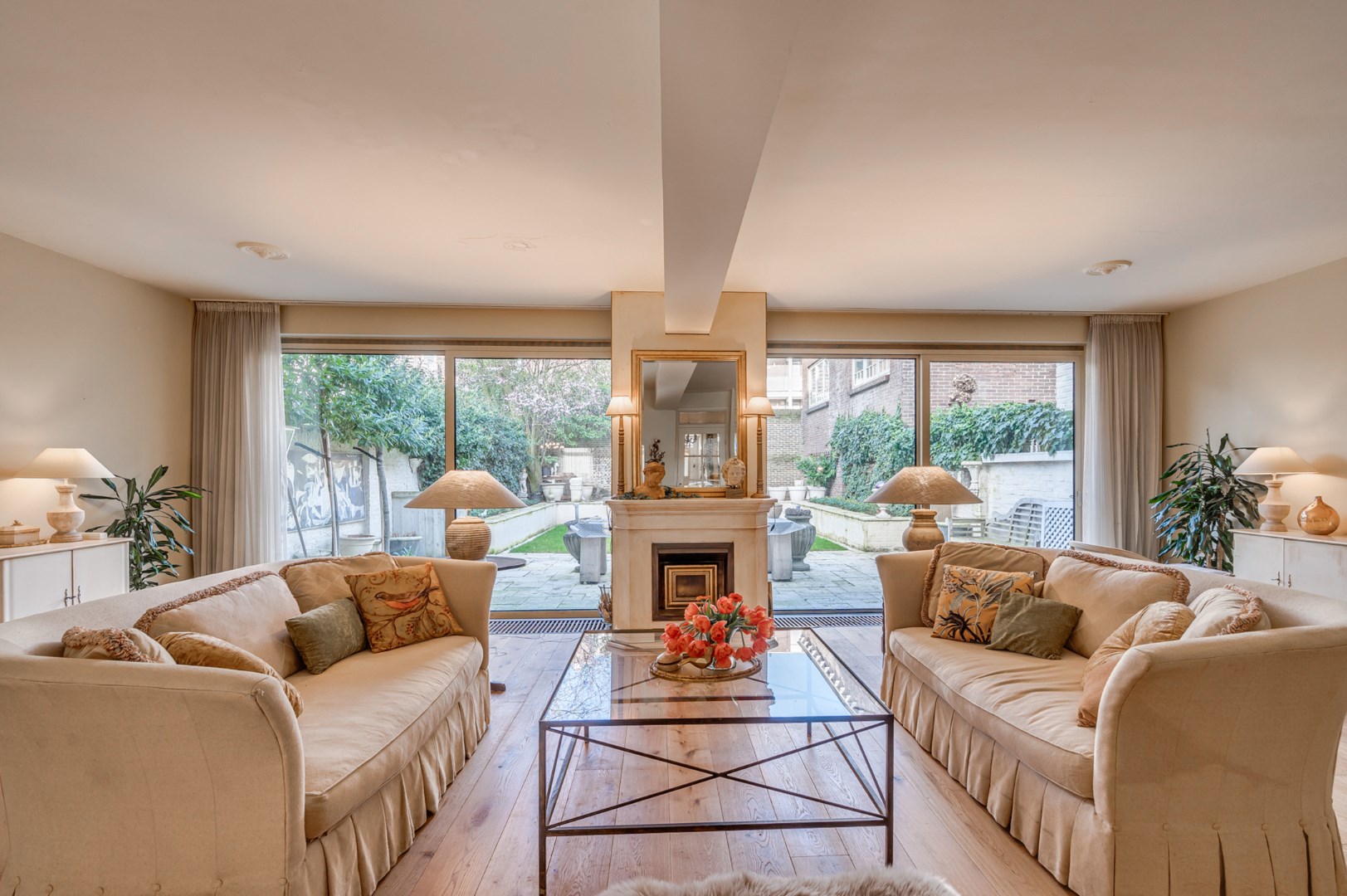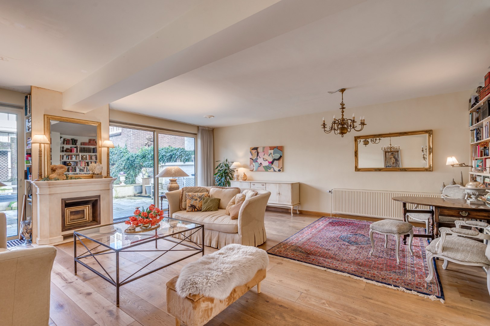 Entree met eikenvloer. Garderobe. Toiletruimte met zwevend toilet en fonteintje. Aparte wasruimte met witgoedaansluiting. Zeer ruime en lichte woonkamer, eetkamer en uitgebouwde zitkamer met 2 schuifpuien welke beide toegang bieden tot de ruime en zonnige stadstuin. De woonkamer is voorzien van 2 muurkasten en goederenliftje. Zowel de woonkamer, eetkamer als zitkamer zijn voorzien van eikenvloer. Aparte leefkeuken voorzien van inbouwapparatuur zoals: 6-pits gasfornuis, afzuigkap, koelkast, diepvries en vaatwasser.