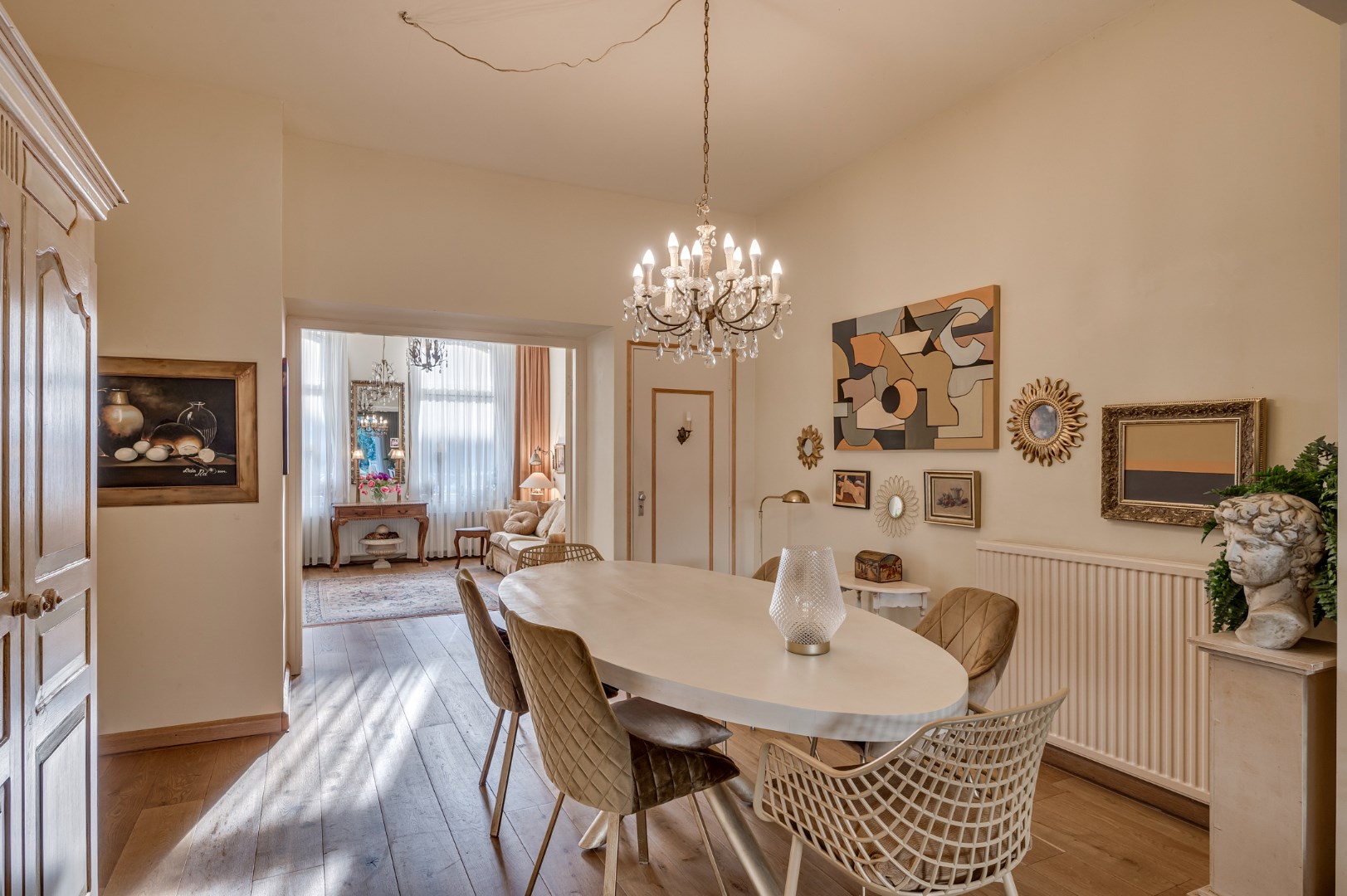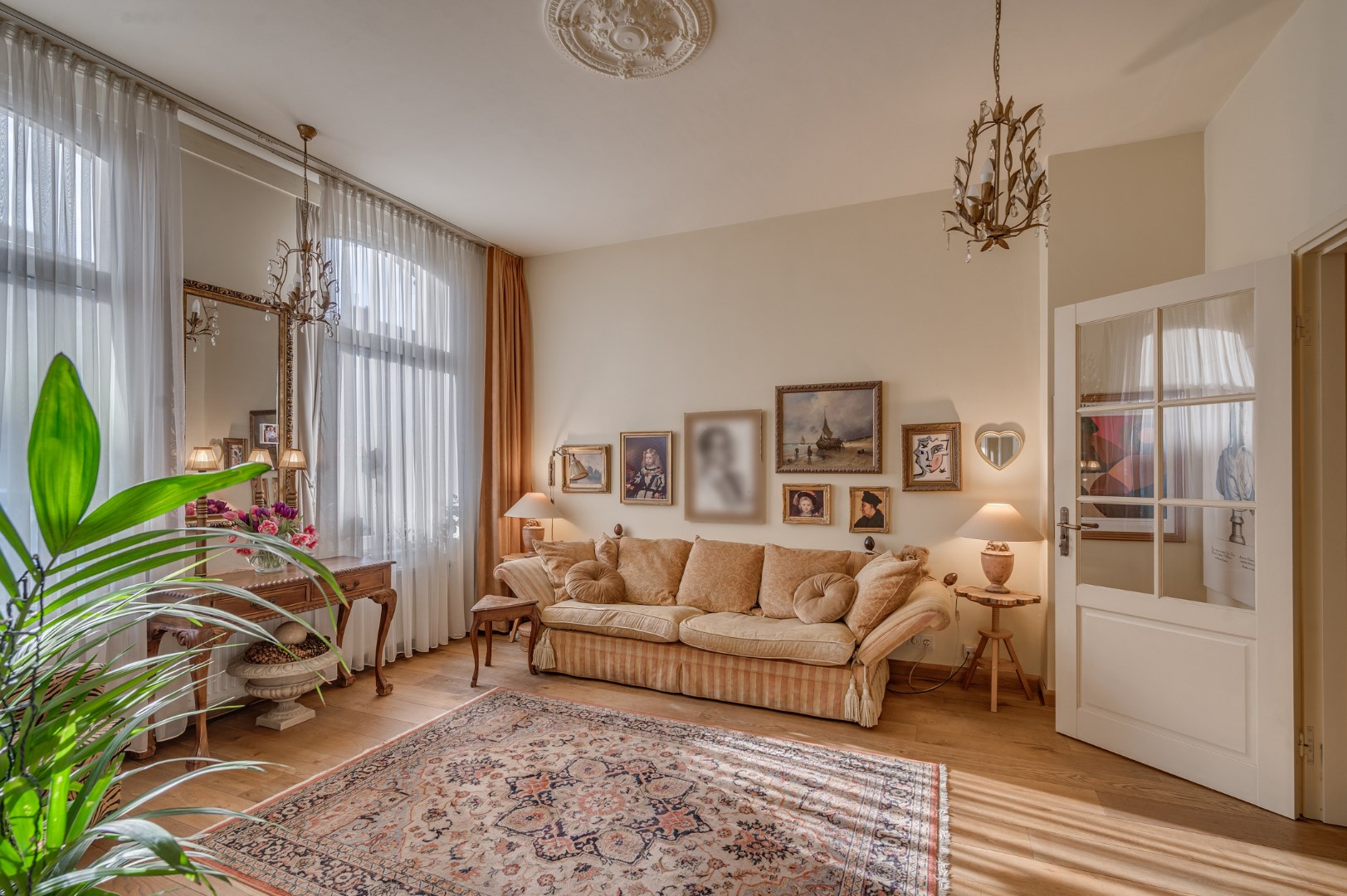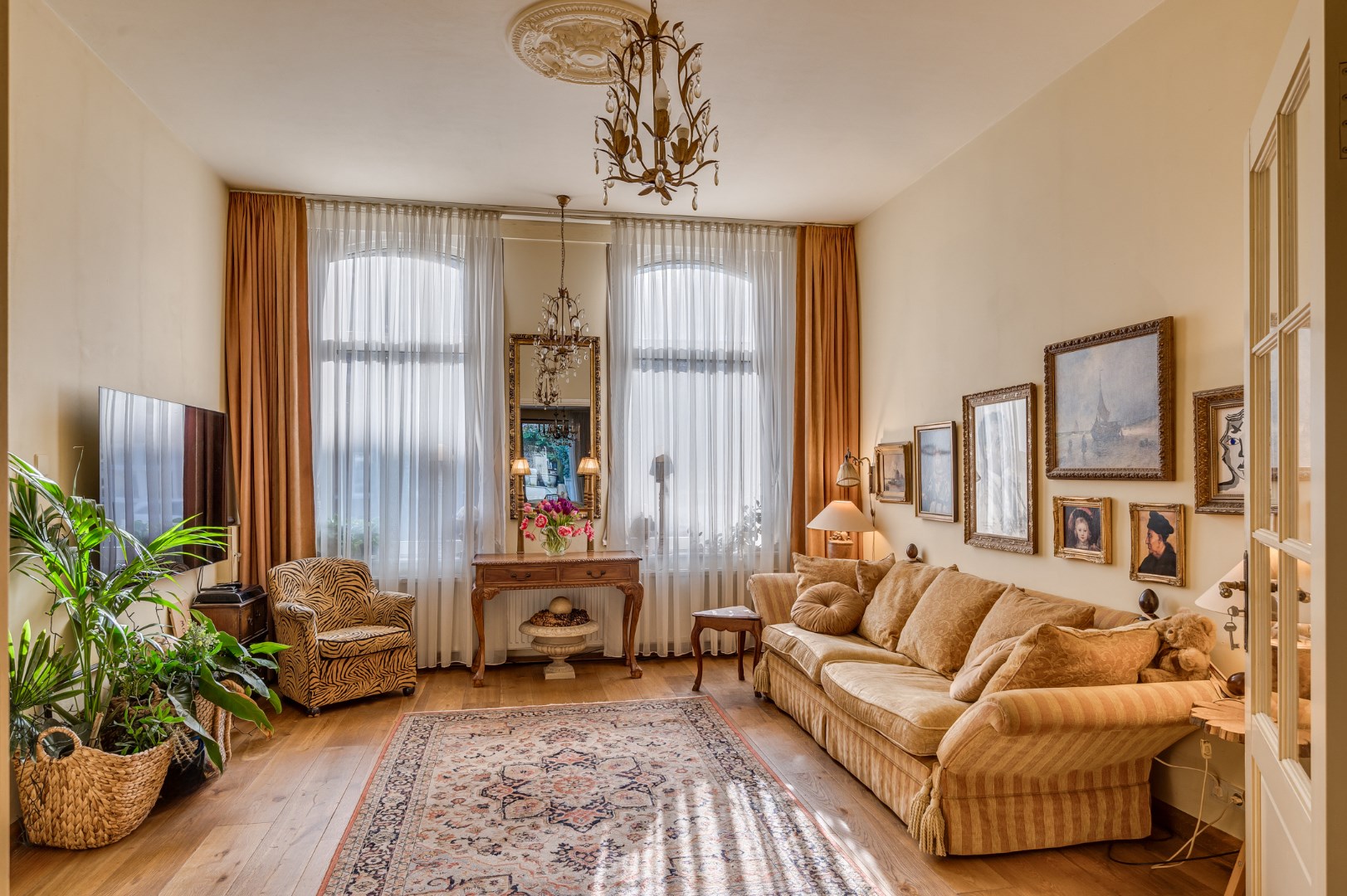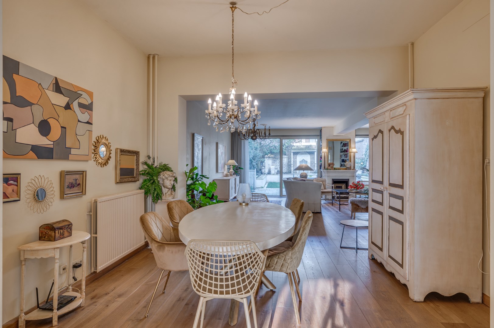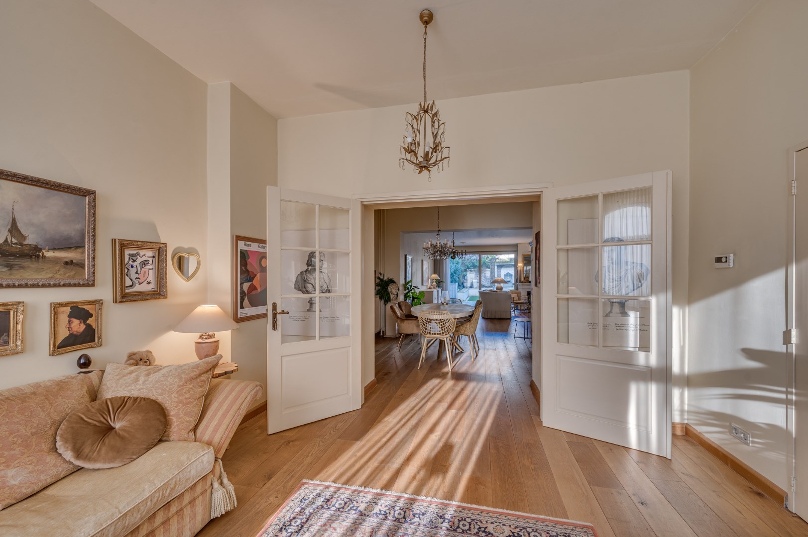 Entree met eikenvloer. Garderobe. Toiletruimte met zwevend toilet en fonteintje. Aparte wasruimte met witgoedaansluiting. Zeer ruime en lichte woonkamer, eetkamer en uitgebouwde zitkamer met 2 schuifpuien welke beide toegang bieden tot de ruime en zonnige stadstuin. De woonkamer is voorzien van 2 muurkasten en goederenliftje. Zowel de woonkamer, eetkamer als zitkamer zijn voorzien van eikenvloer. Aparte leefkeuken voorzien van inbouwapparatuur zoals: 6-pits gasfornuis, afzuigkap, koelkast, diepvries en vaatwasser.
