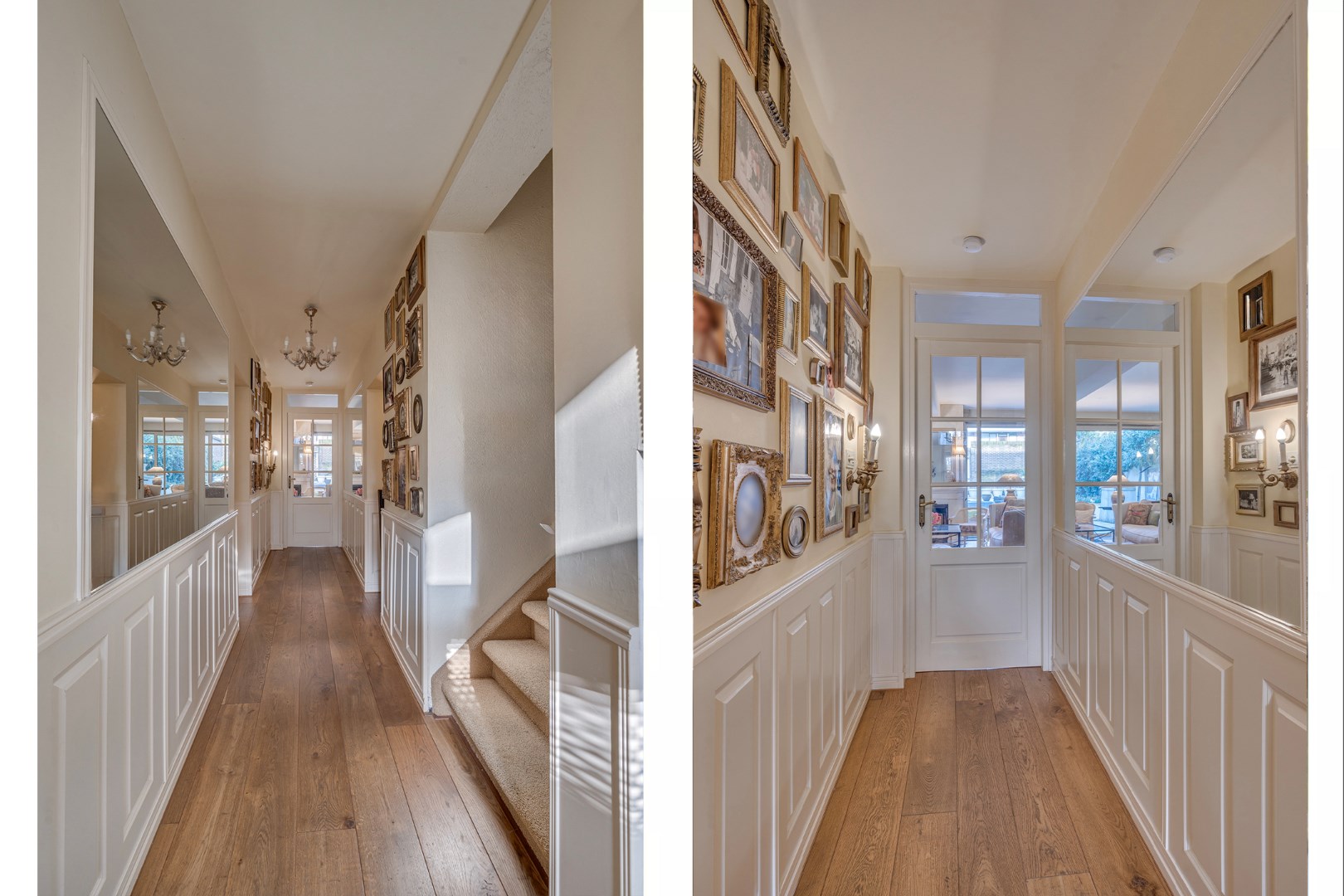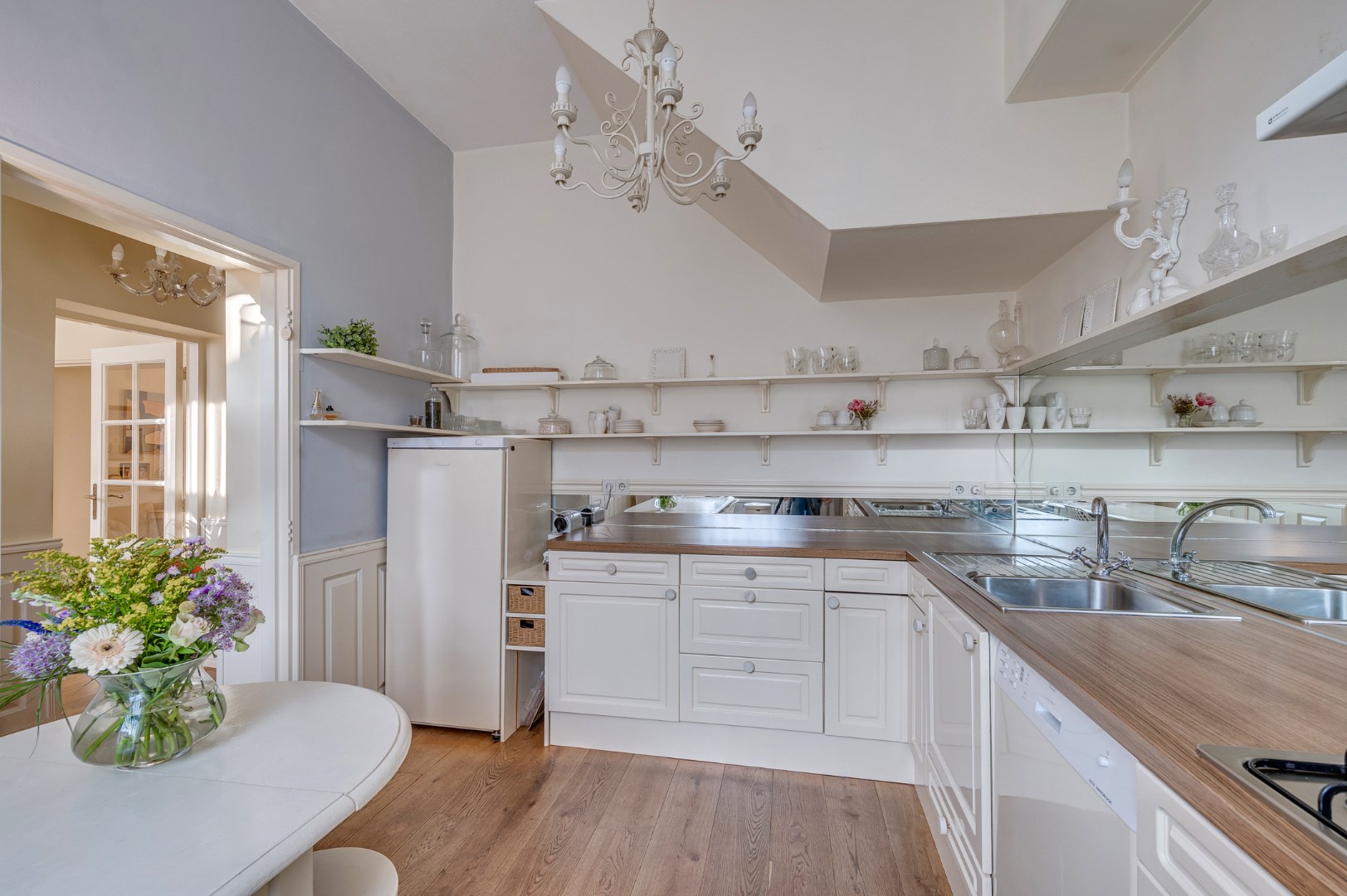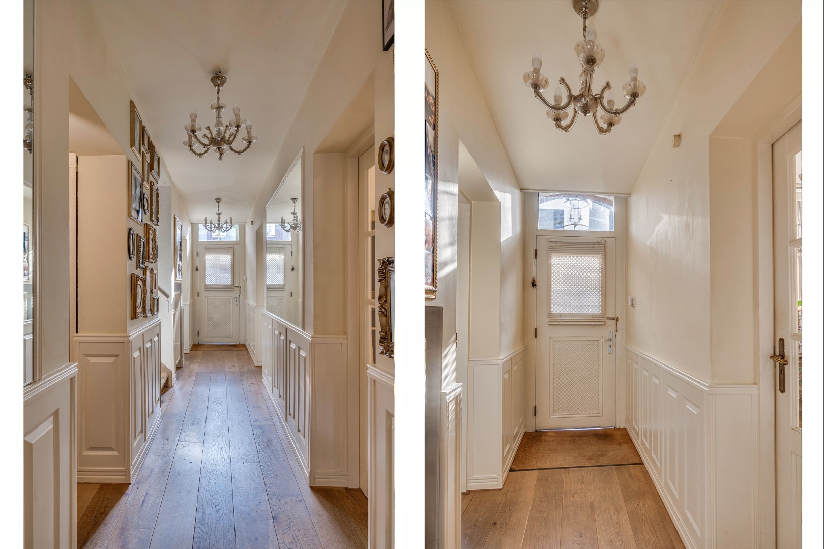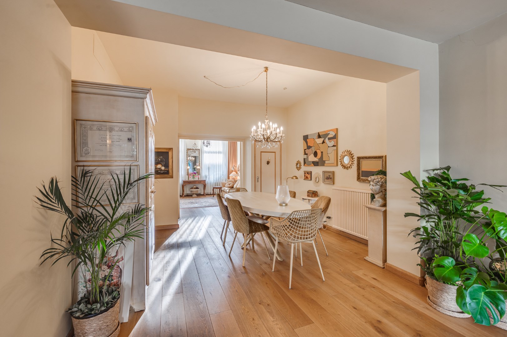 Entree met eikenvloer. Garderobe. Toiletruimte met zwevend toilet en fonteintje. Aparte wasruimte met witgoedaansluiting. Zeer ruime en lichte woonkamer, eetkamer en uitgebouwde zitkamer met 2 schuifpuien welke beide toegang bieden tot de ruime en zonnige stadstuin. De woonkamer is voorzien van 2 muurkasten en goederenliftje. Zowel de woonkamer, eetkamer als zitkamer zijn voorzien van eikenvloer. Aparte leefkeuken voorzien van inbouwapparatuur zoals: 6-pits gasfornuis, afzuigkap, koelkast, diepvries en vaatwasser.