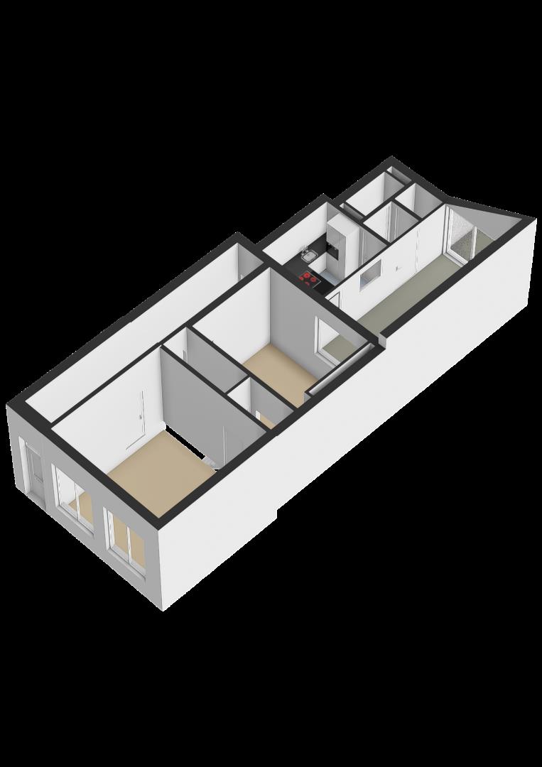 Entree met tegelvloer. Hangend toilet met fonteintje . Zitkamer met laminaatvloer en middels enkele treden te bereiken eetkamer met eveneens laminaatvloer. De aparte keuken is voorzien van houten aanrechtblad, spoelbak, en inbouwapparatuur zoals: 4-pits inductie kookplaat en afzuigkap. In de bijkeuken bevindt zich de aansluiting voor de wasmachine.