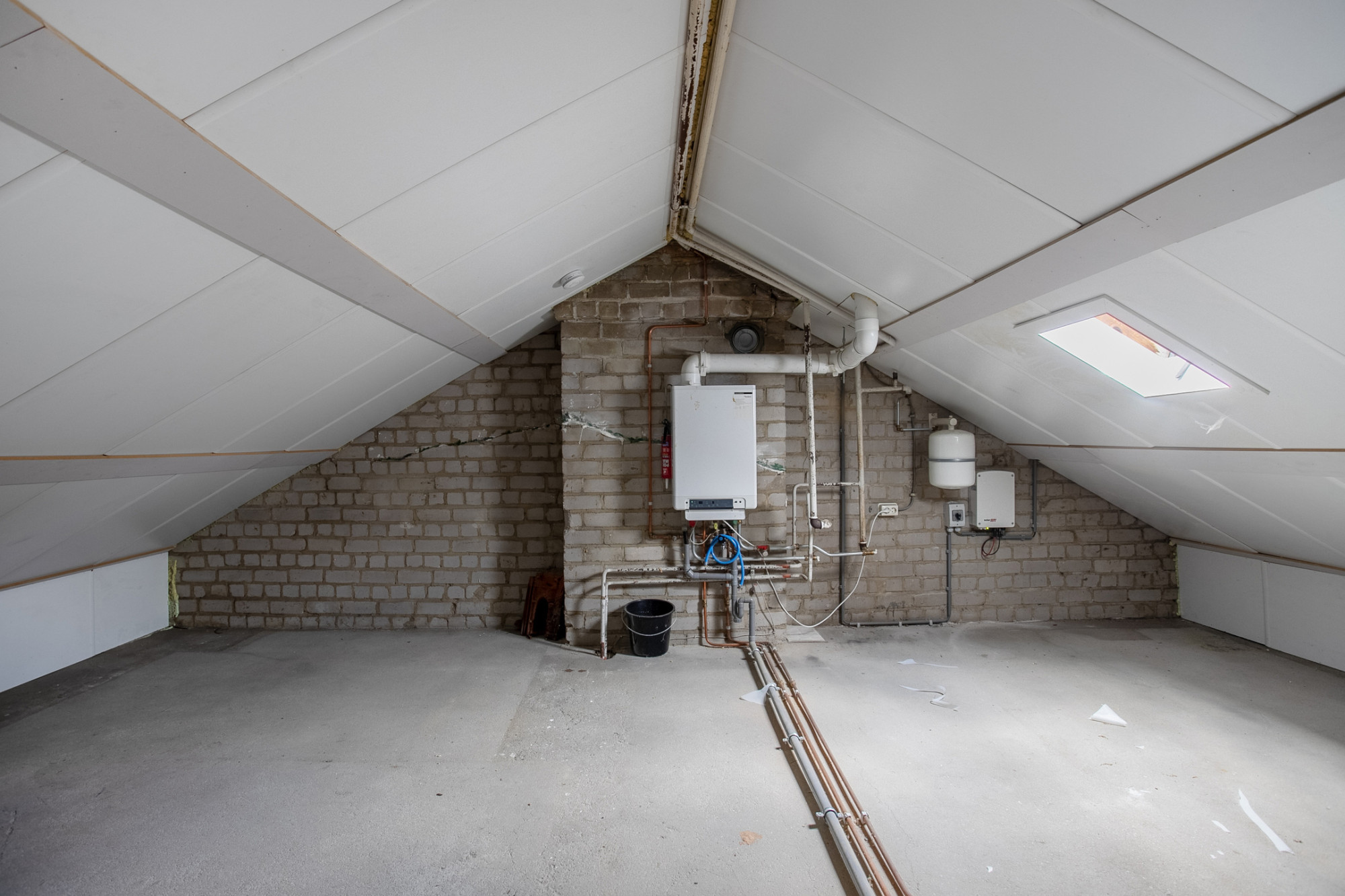 De ruimte is verdeeld en de cv opstelling en omvormer van de zonnepanelen zijn hier gesitueerd. De zolder biedt zonder meer gelegenheid voor het realiseren van een vaste trap en bijvoorbeeld een dakkapel.