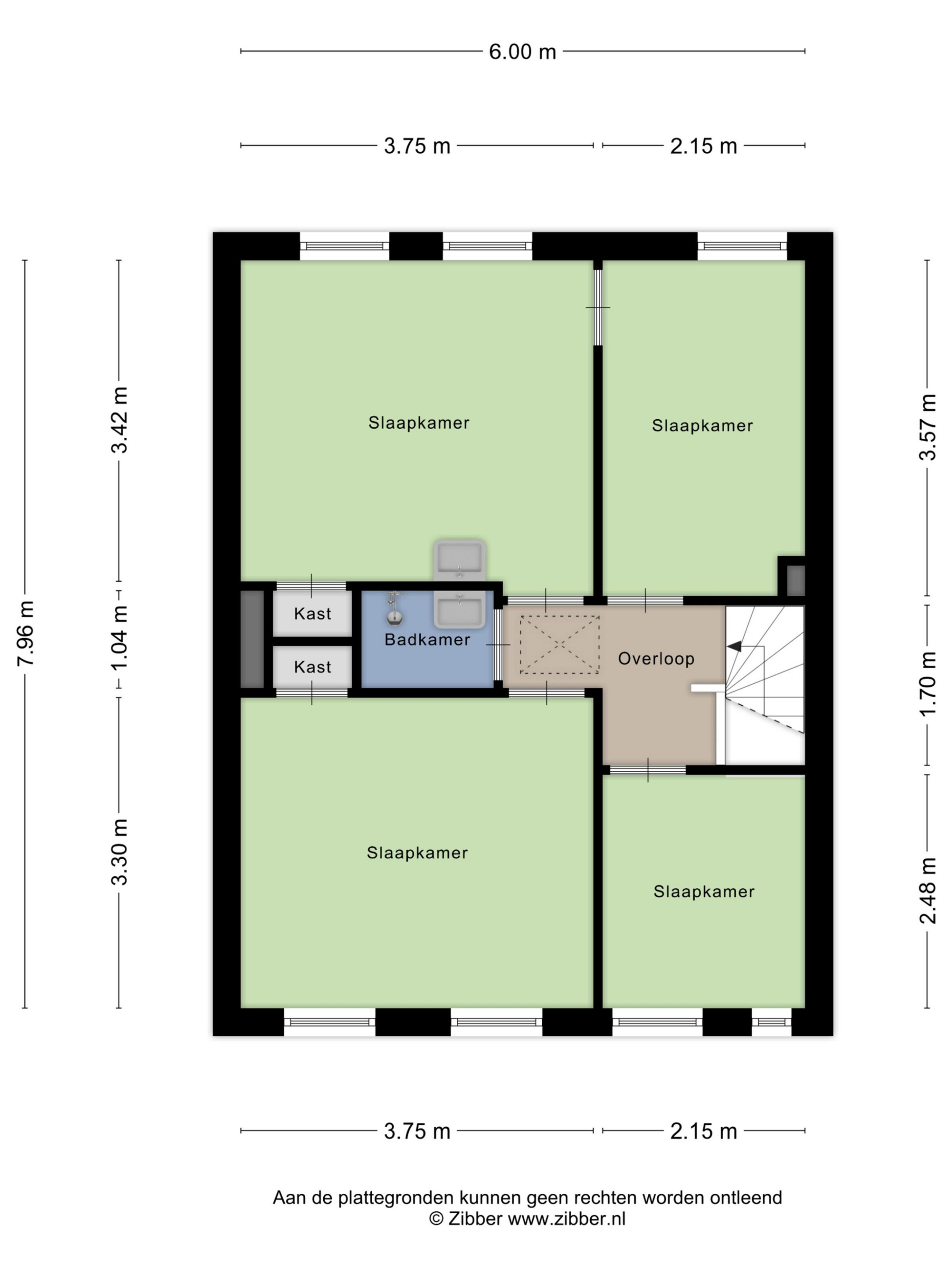 Vanuit de overloop heeft u toegang tot de vier slaapkamers en de doucheruimte. De slaapkamers zijn circa 5 m², 8 m², 13 m² en 12 m² groot. De doucheruimte is geheel betegeld en voorzien van een douche en vaste wastafel.