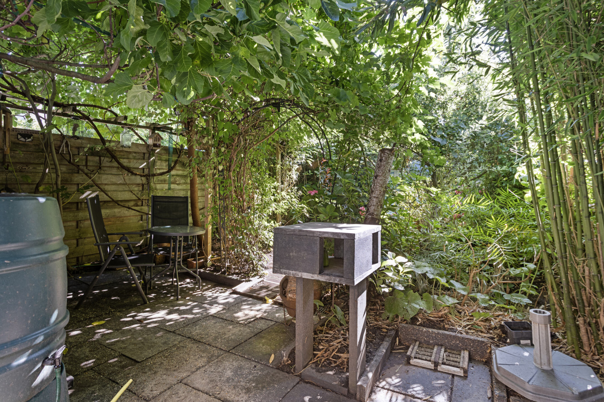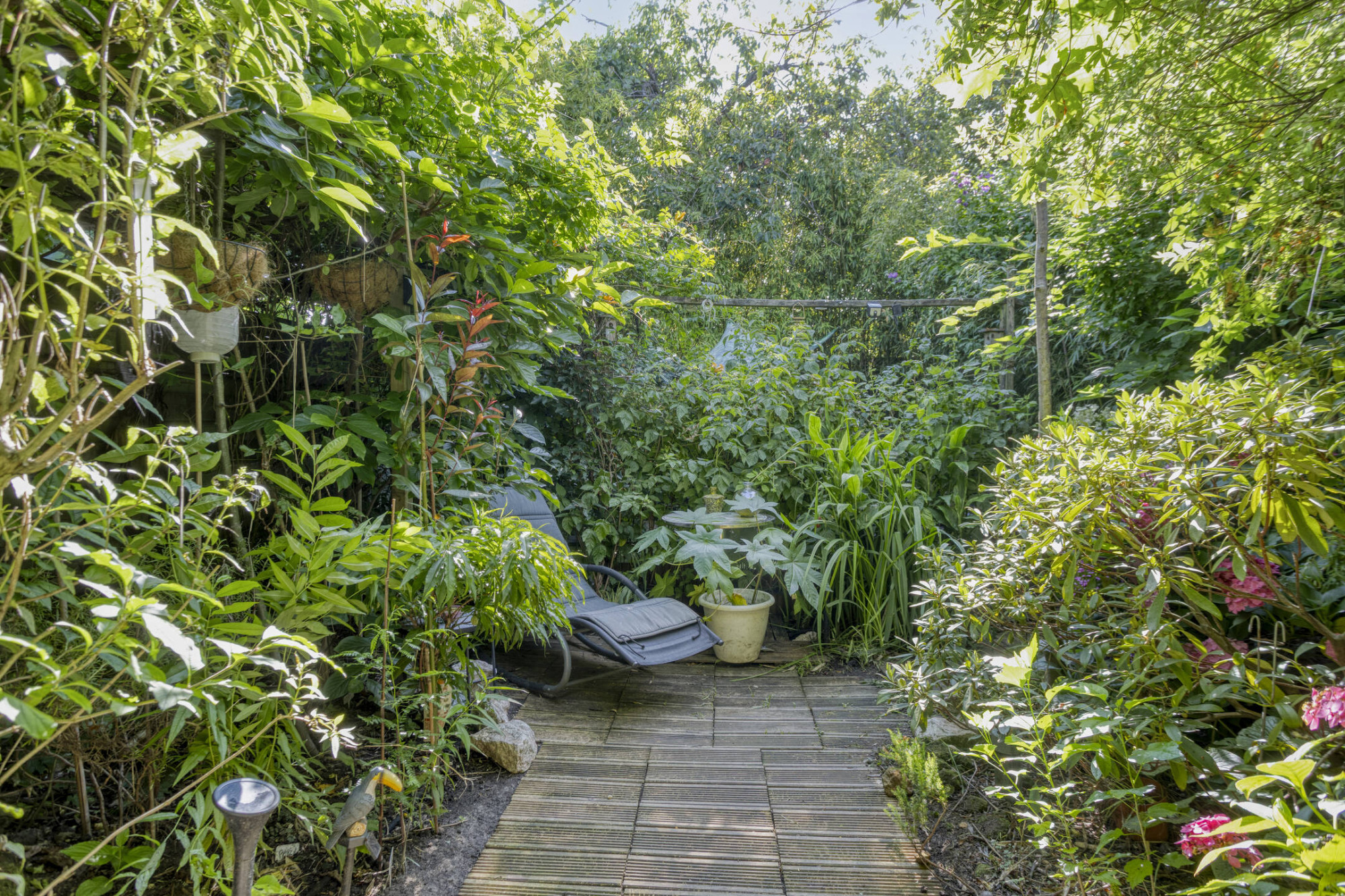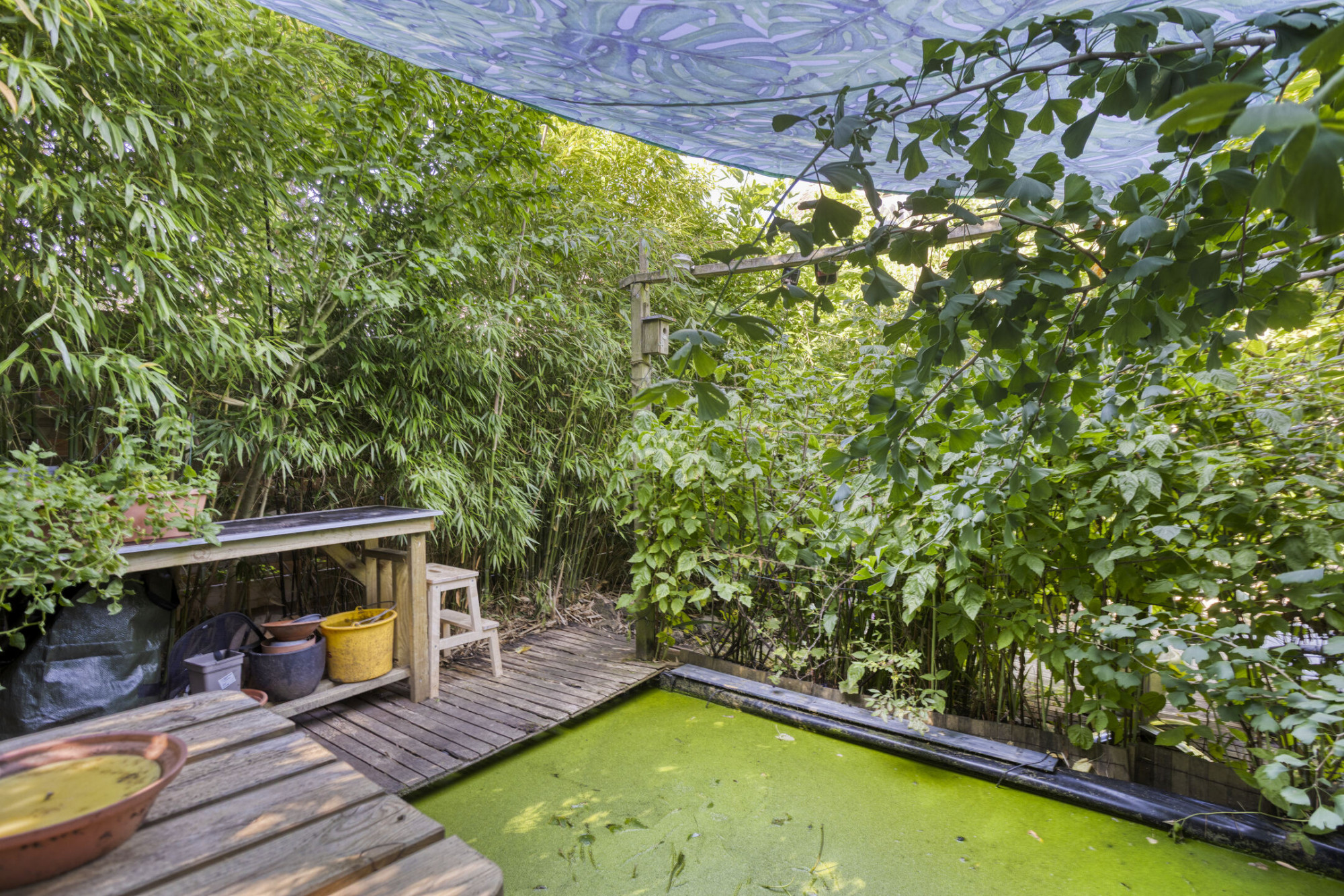De achtertuin is speels aangelegd en bestaat uit meerdere groene hoekjes met veel beplanting, waardoor je hier veel privacy hebt. Er zijn verschillende terrassen gecreëerd waar je beschut kunt zitten. Achter in de tuin ligt een waterpartij, deze is momenteel volledig bedekt met eendenkroos, waardoor het oppervlak groen oogt. Verder is er voldoende ruimte voor tuinspullen en is er een mix van bestrating, houten vlonders en weelderige beplanting. De tuin heeft een natuurlijke, rustige uitstraling en biedt altijd wel een plekje in de zon of schaduw. De tuin beschikt ook over een achterom