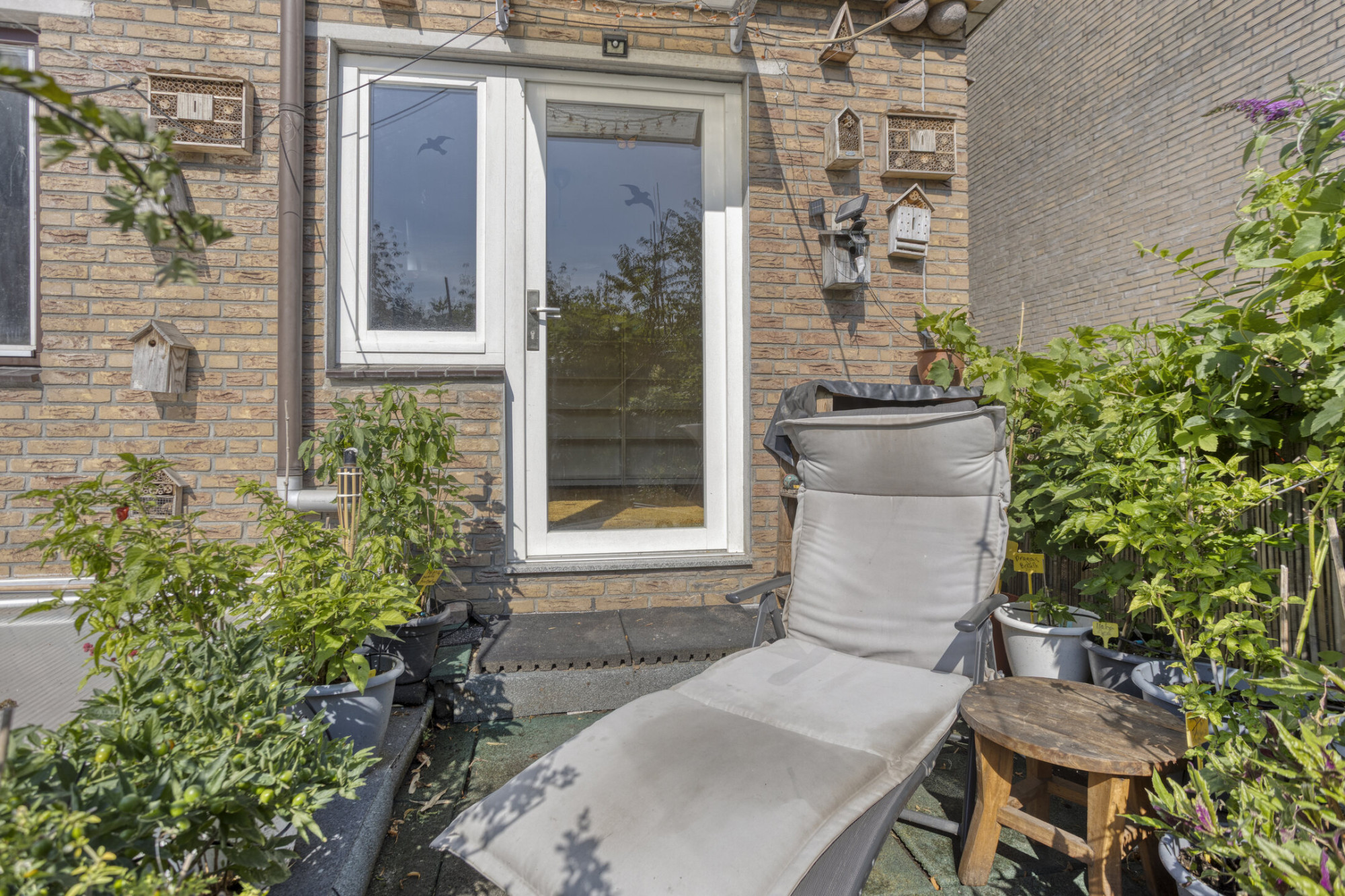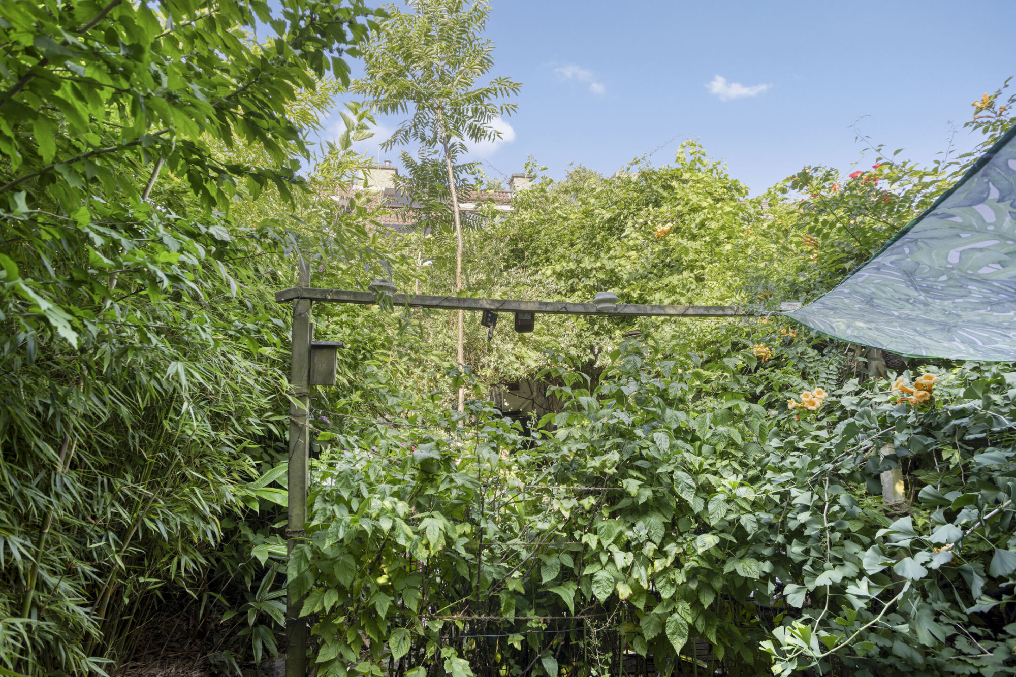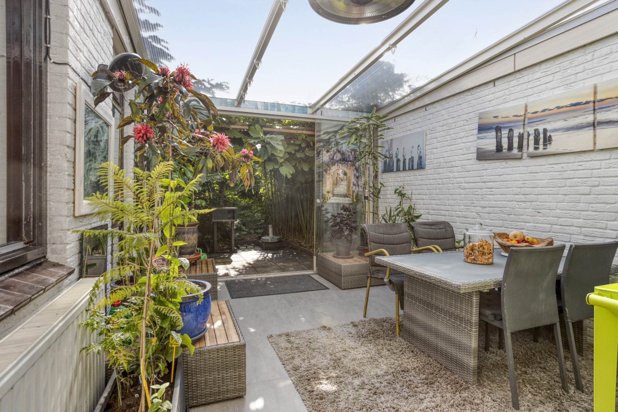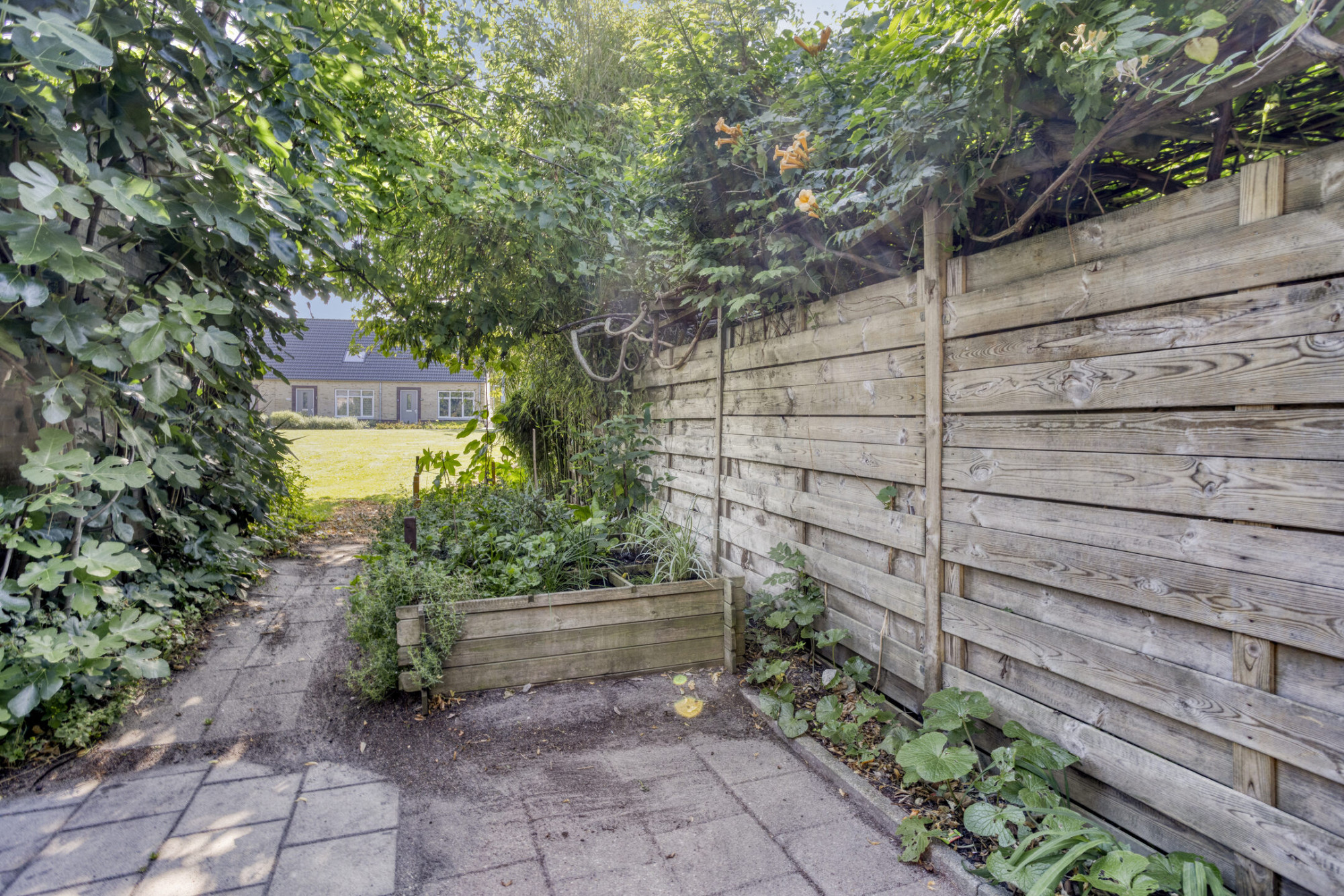 De achtertuin is speels aangelegd en bestaat uit meerdere groene hoekjes met veel beplanting, waardoor je hier veel privacy hebt. Er zijn verschillende terrassen gecreëerd waar je beschut kunt zitten. Achter in de tuin ligt een waterpartij, deze is momenteel volledig bedekt met eendenkroos, waardoor het oppervlak groen oogt. Verder is er voldoende ruimte voor tuinspullen en is er een mix van bestrating, houten vlonders en weelderige beplanting. De tuin heeft een natuurlijke, rustige uitstraling en biedt altijd wel een plekje in de zon of schaduw. De tuin beschikt ook over een achterom