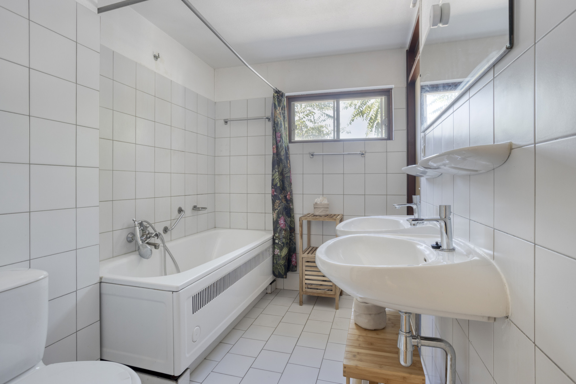 De badkamer ligt aan de voorzijde van de woning en beschikt over een ligbad met douche, dubbele wastafels, een toilet, en een raam voor natuurlijke ventilatie. De badkamer heeft een praktische indeling en voldoende ruimte voor dagelijks comfort.