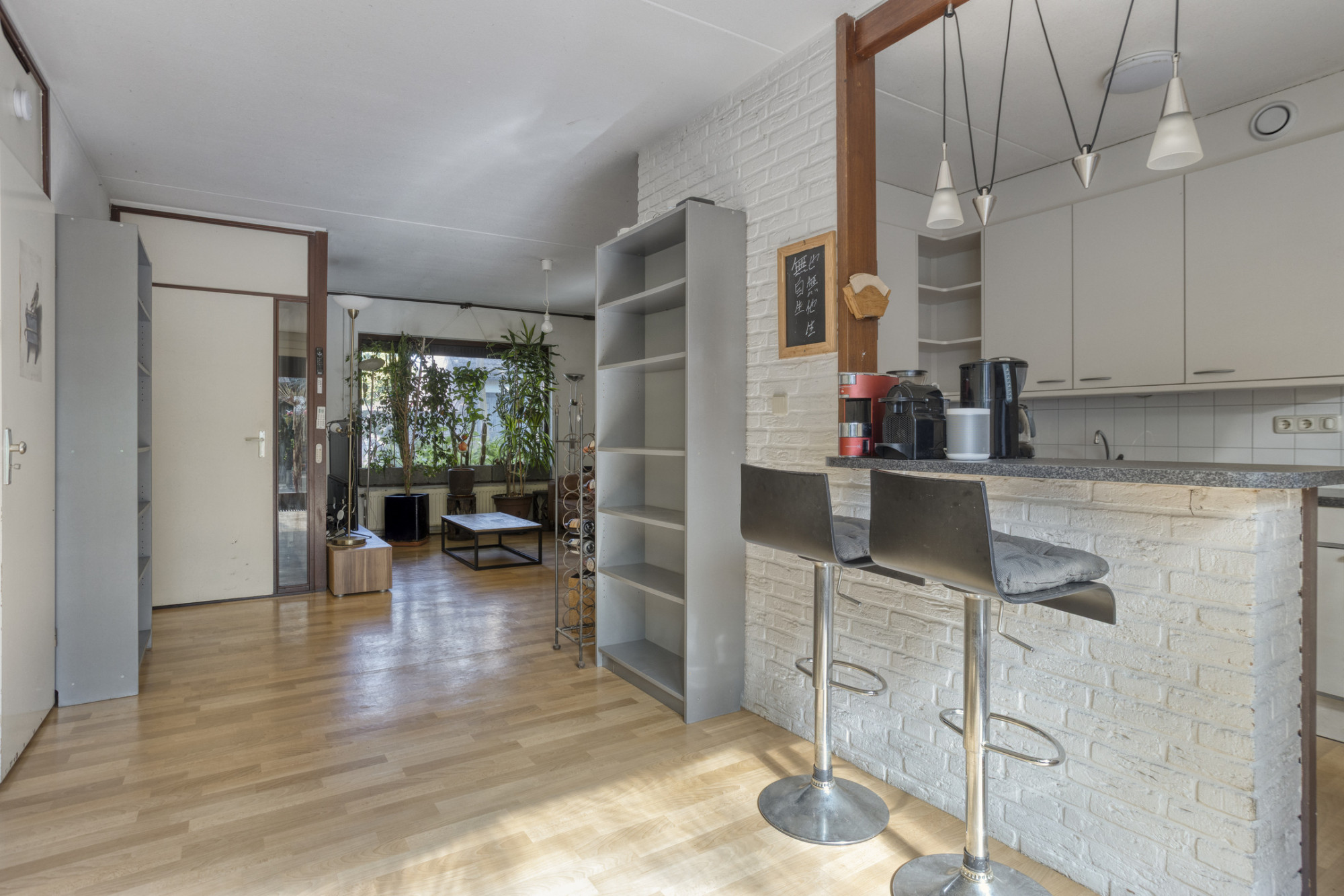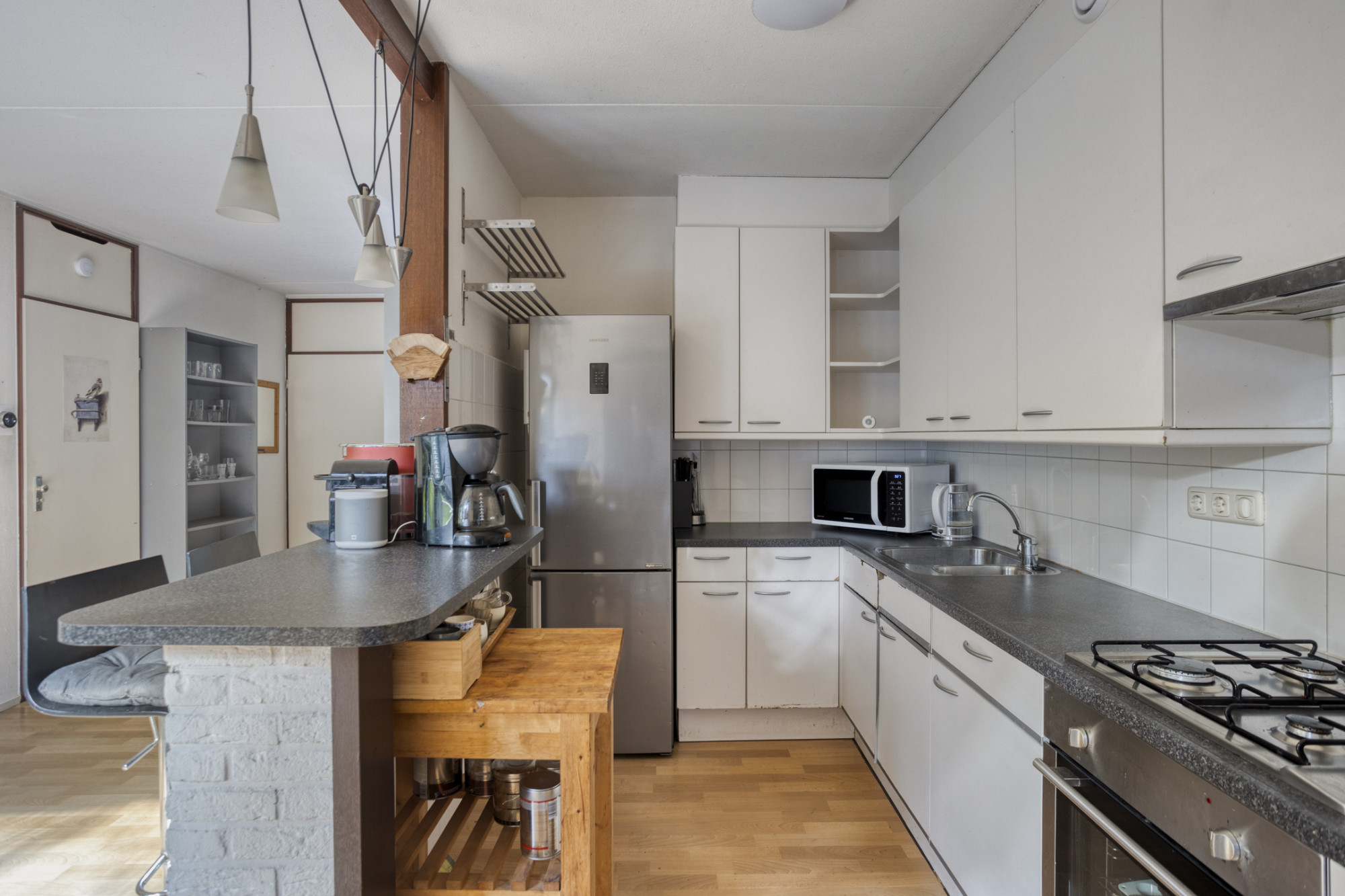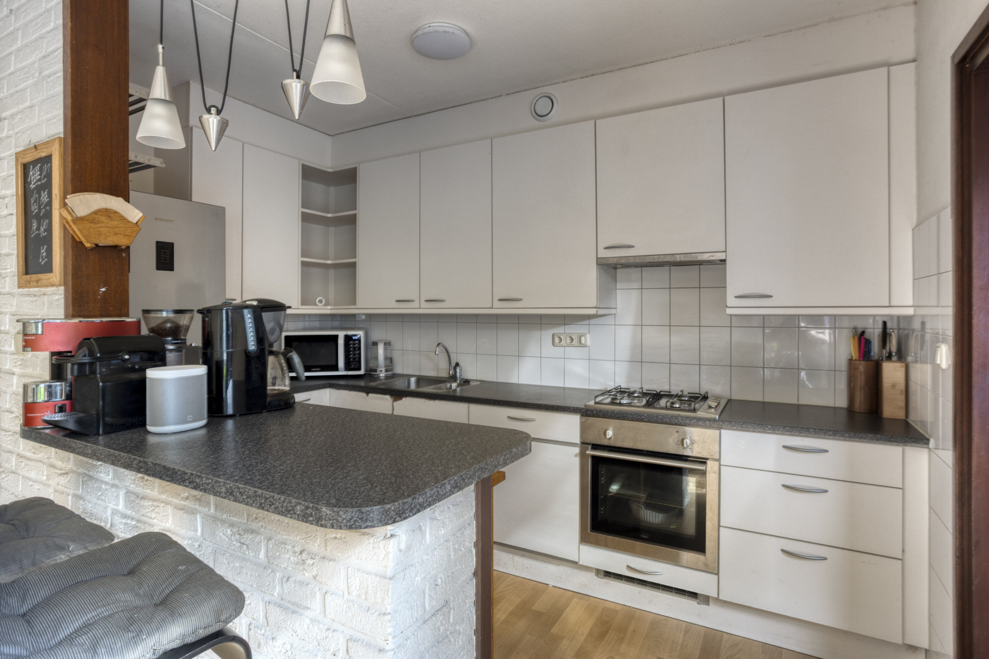 De keuken staat in open verbinding met de woonkamer en is ingericht in een praktische hoekopstelling. Je kookt op een 4-pits gasfornuis en beschikt over een inbouwoven en voldoende kastruimte. Het bar blad aan de keuken zorgt voor een gezellige plek om aan te zitten.