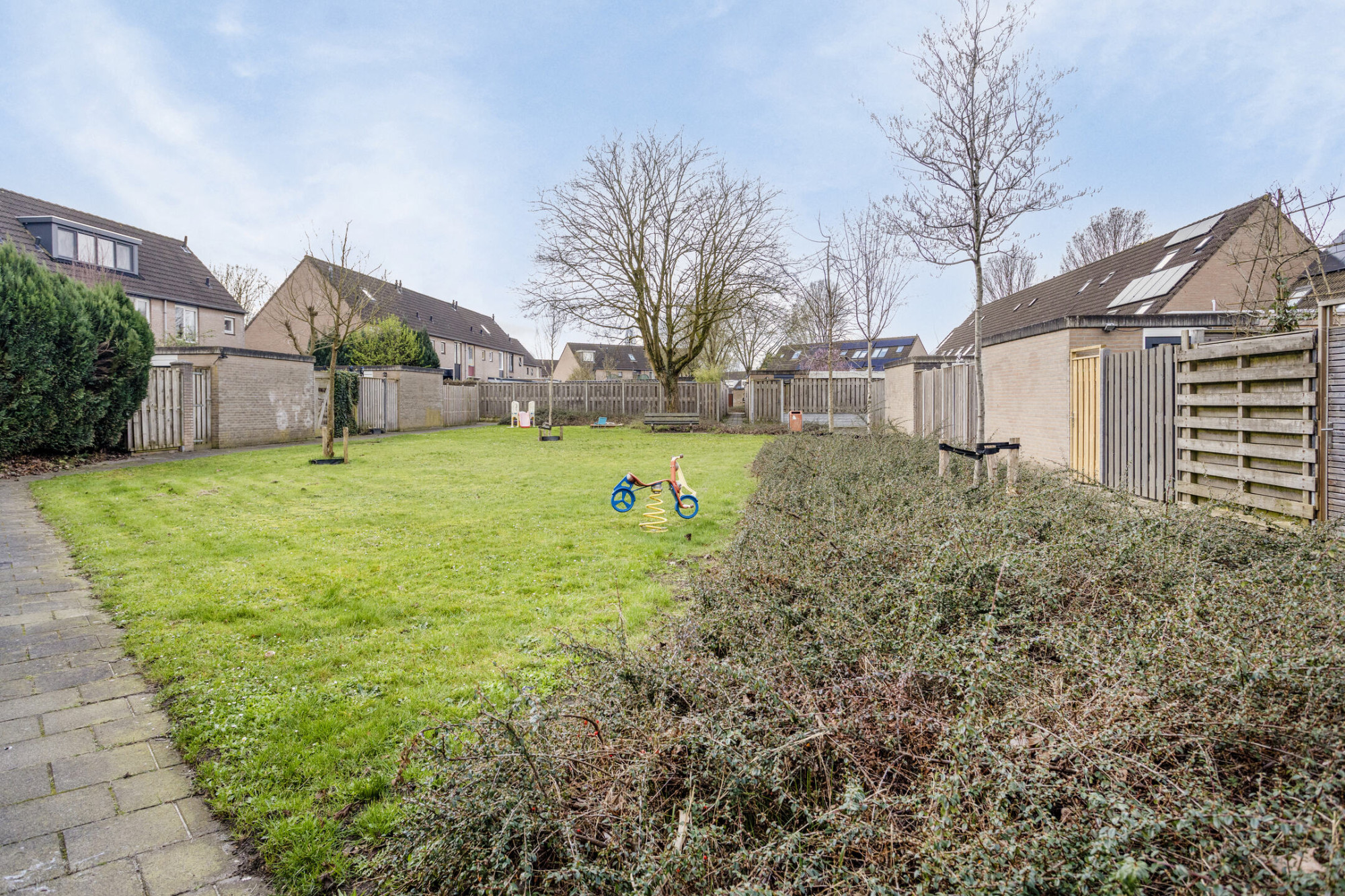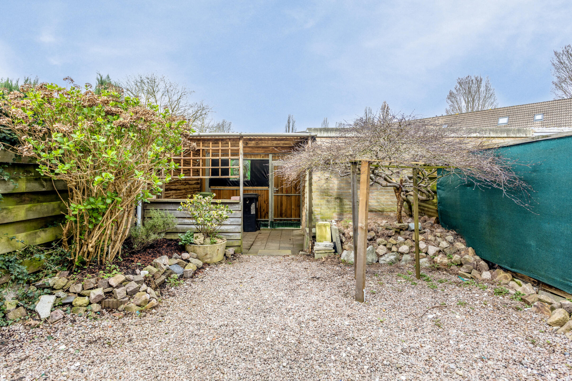 De achtertuin is gelegen op het westen en aangelegd met een ruime, dichte overkapping aan huis, beplanting en een vrijstaande berging achterin de tuin met een overkapping en grote schuifpoort. Achter de woning ligt een leuk plantsoentje waardoor de achtertuin de nodige privacy biedt.