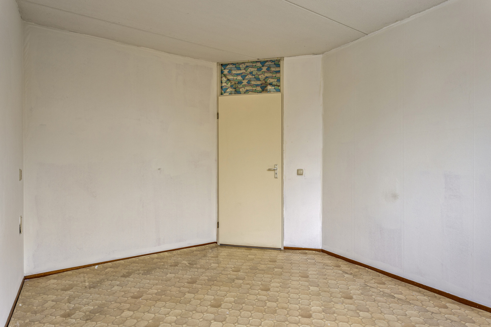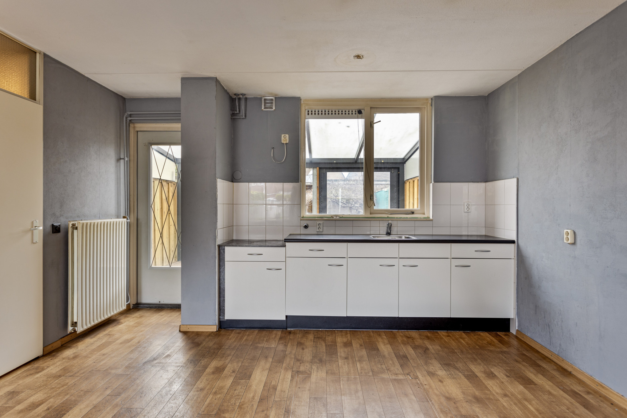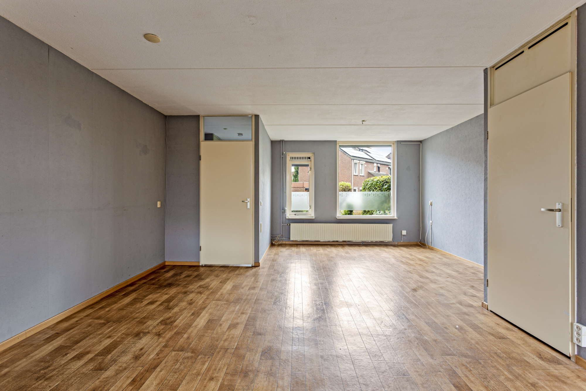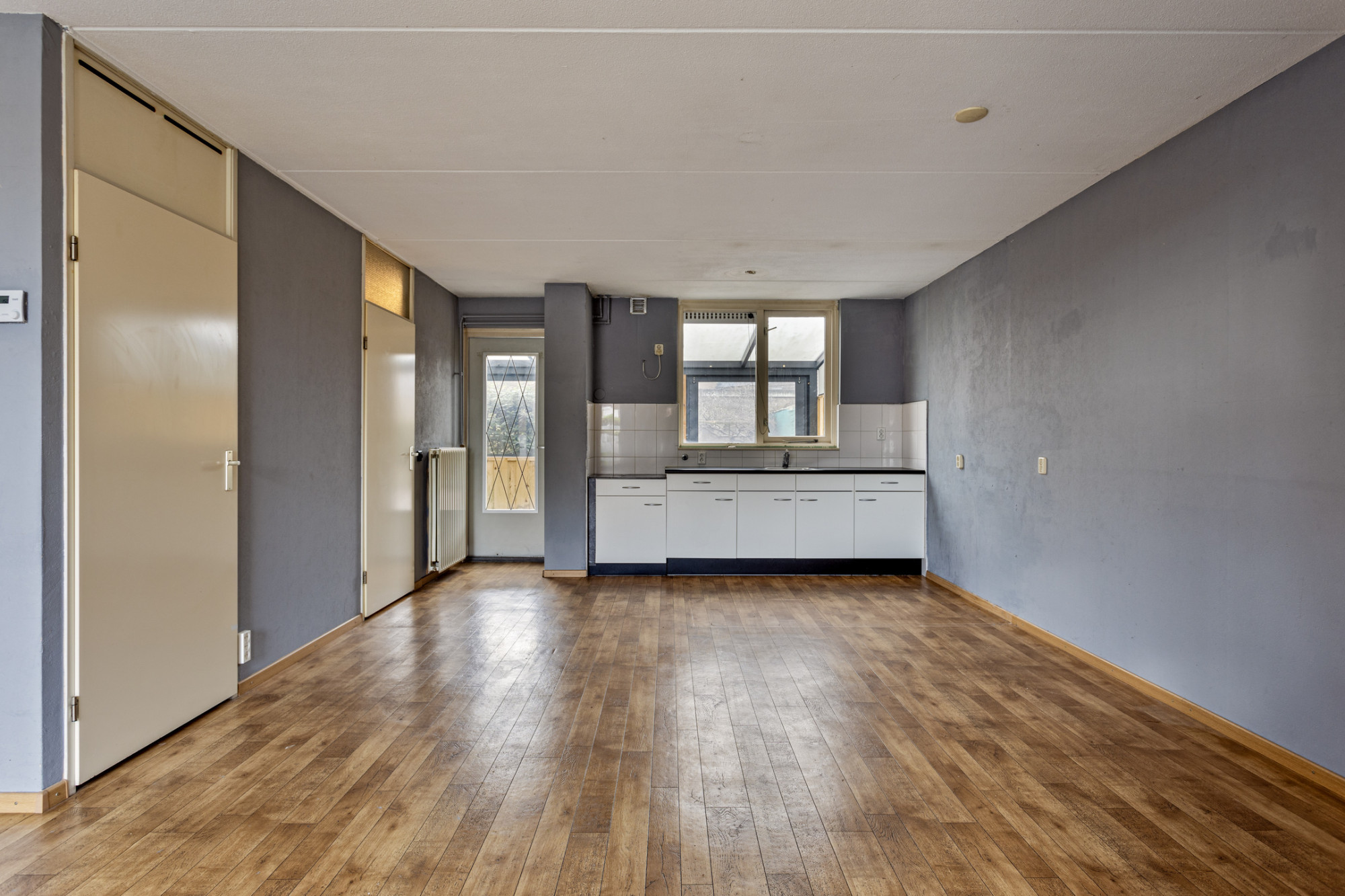 Entree met vernieuwde meterkast en toegang tot de woonkamer met veel lichtinval door de grote ramen aan de voorzijde. Open keuken aan de achterzijde met eenvoudige inbouwkeuken.