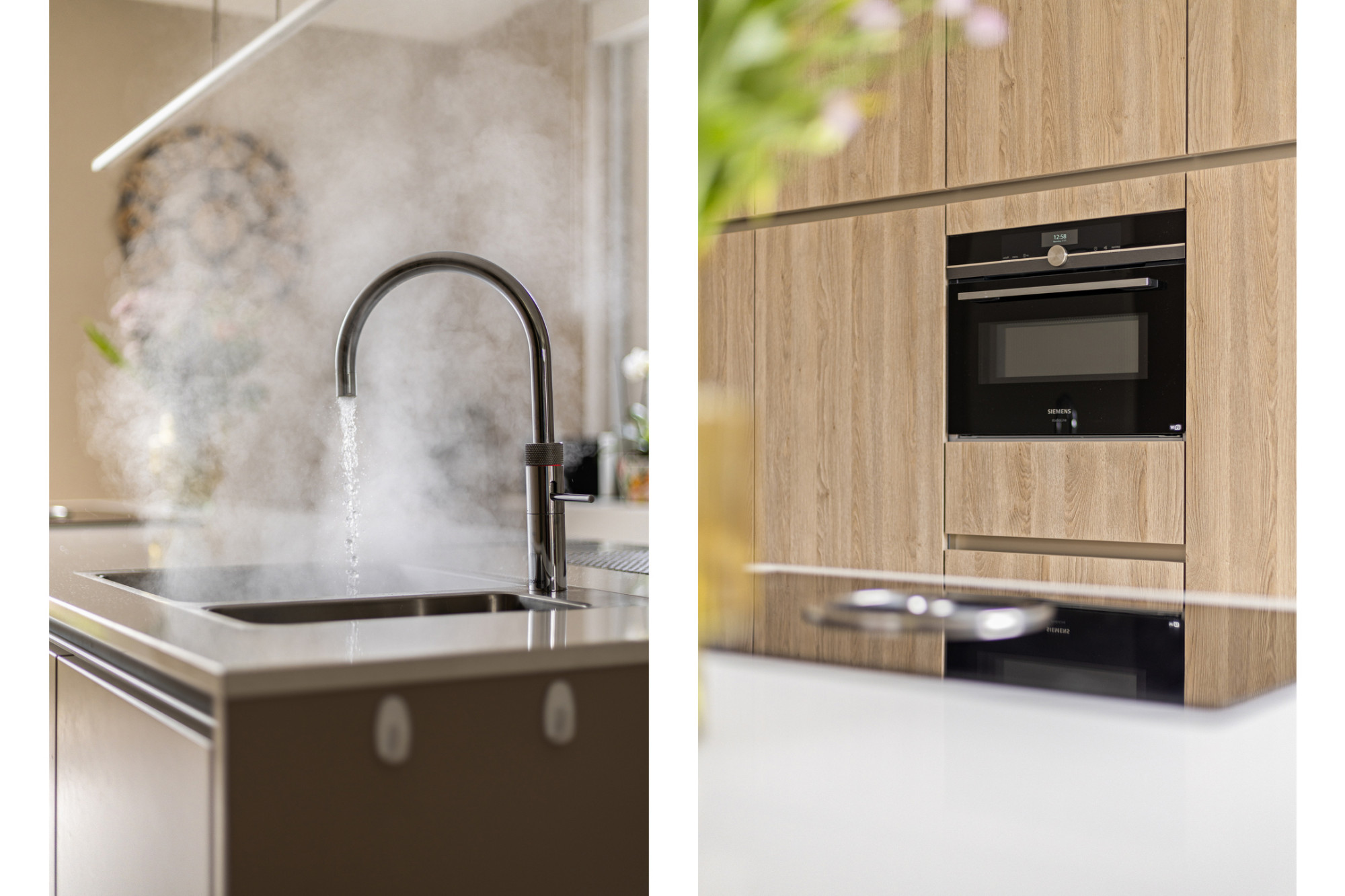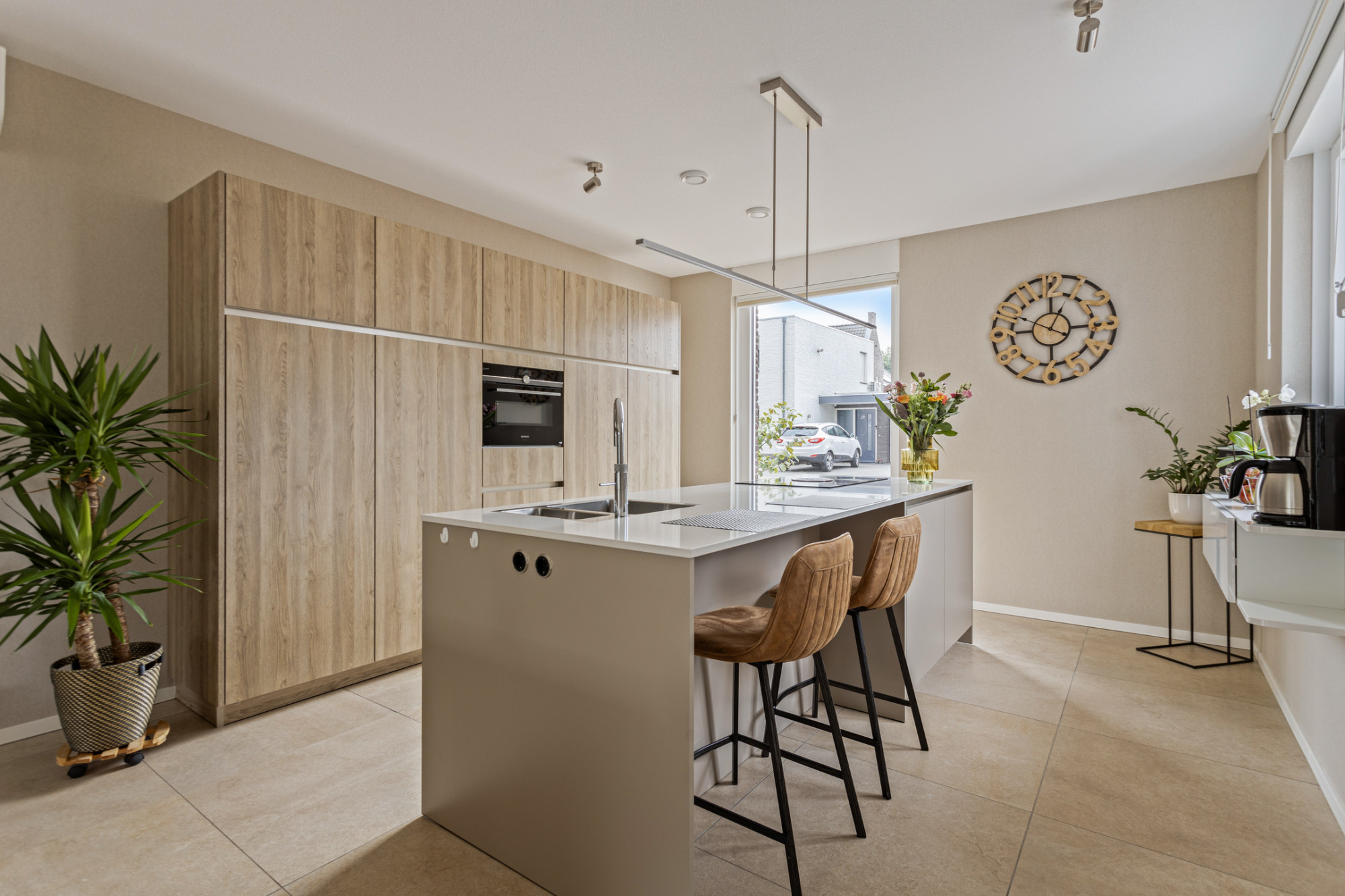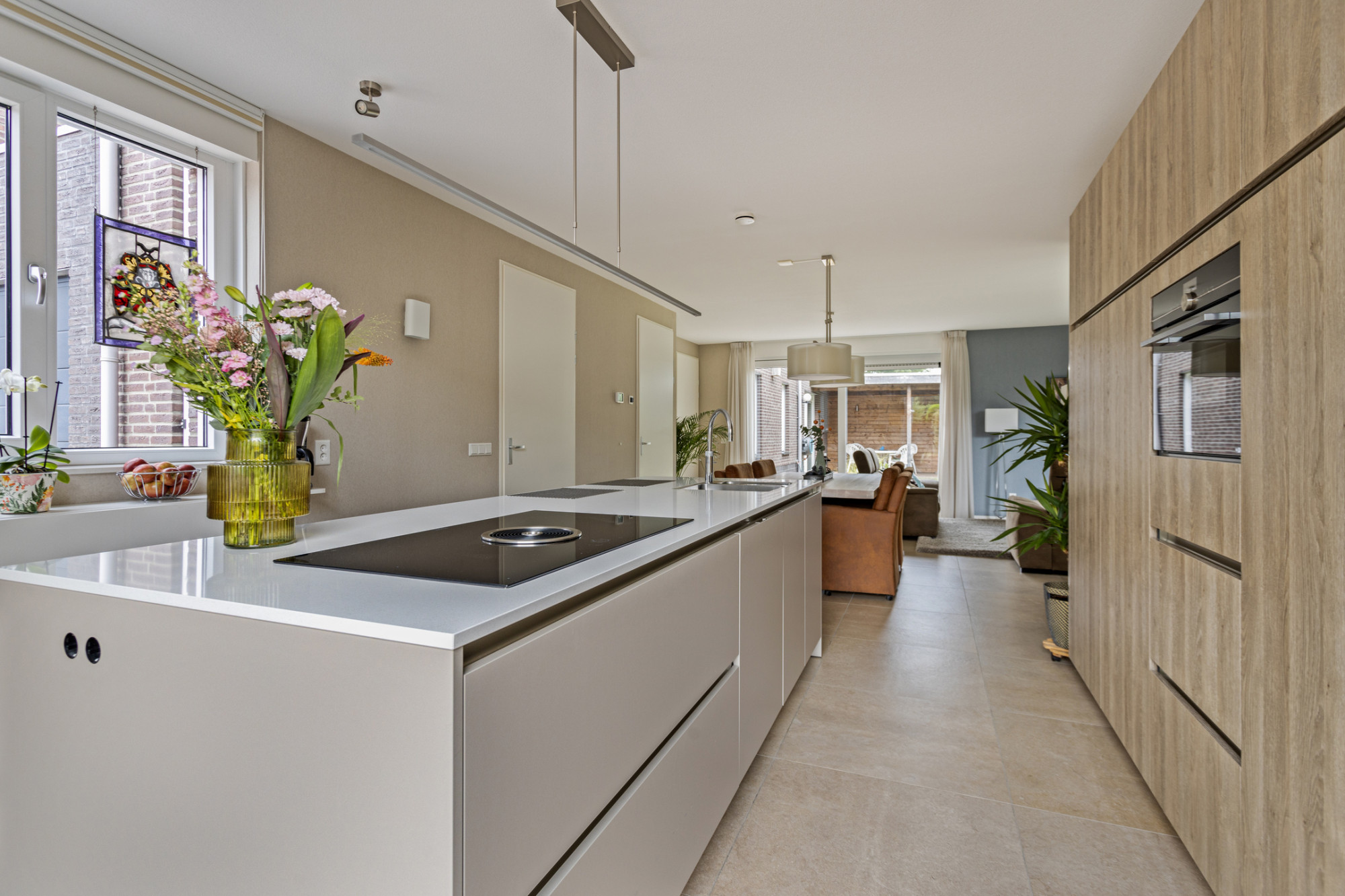 De woonkamer met open keuken meten een comfortabele 42 m². De keuken bevindt zich aan de voorzijde en is voorzien van een luxe keukeninrichting met een kookeiland met keramisch werkblad, een inductiekookplaat met geïntegreerde afzuiging, een spoelbak met Quooker en een vaatwasser. In de wandopstelling bevindt zich een combimagnetron, koelkast en vriezer. Uiteraard is er voldoende kastruimte aanwezig.