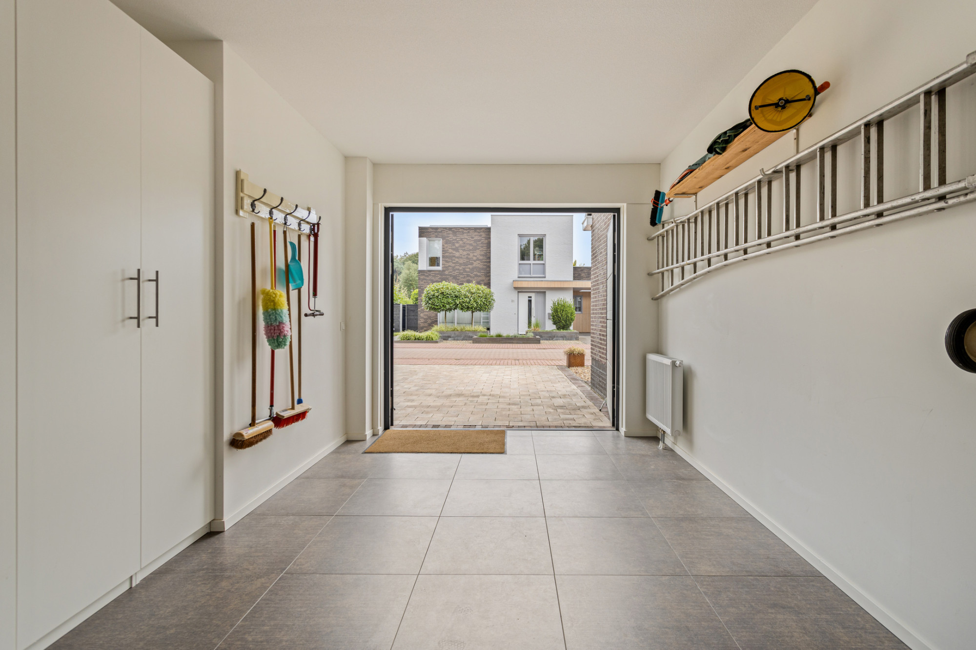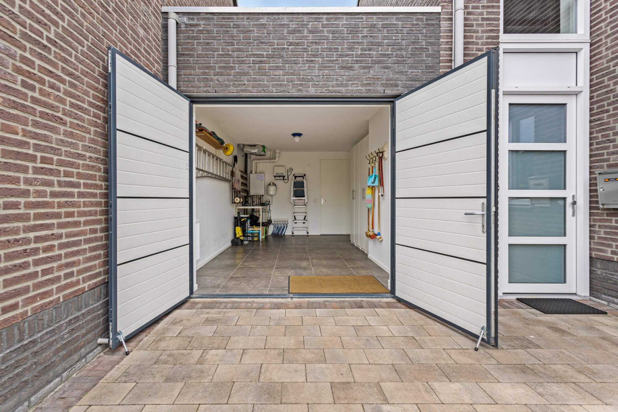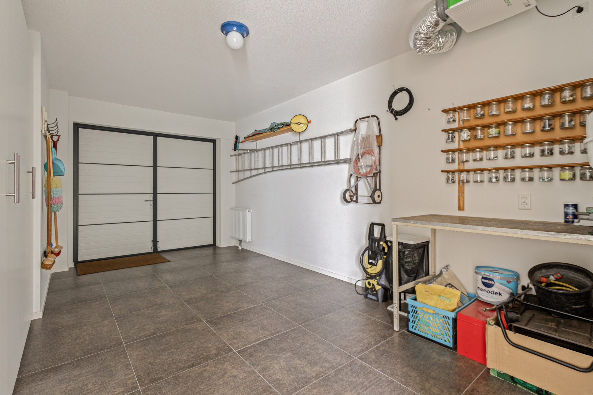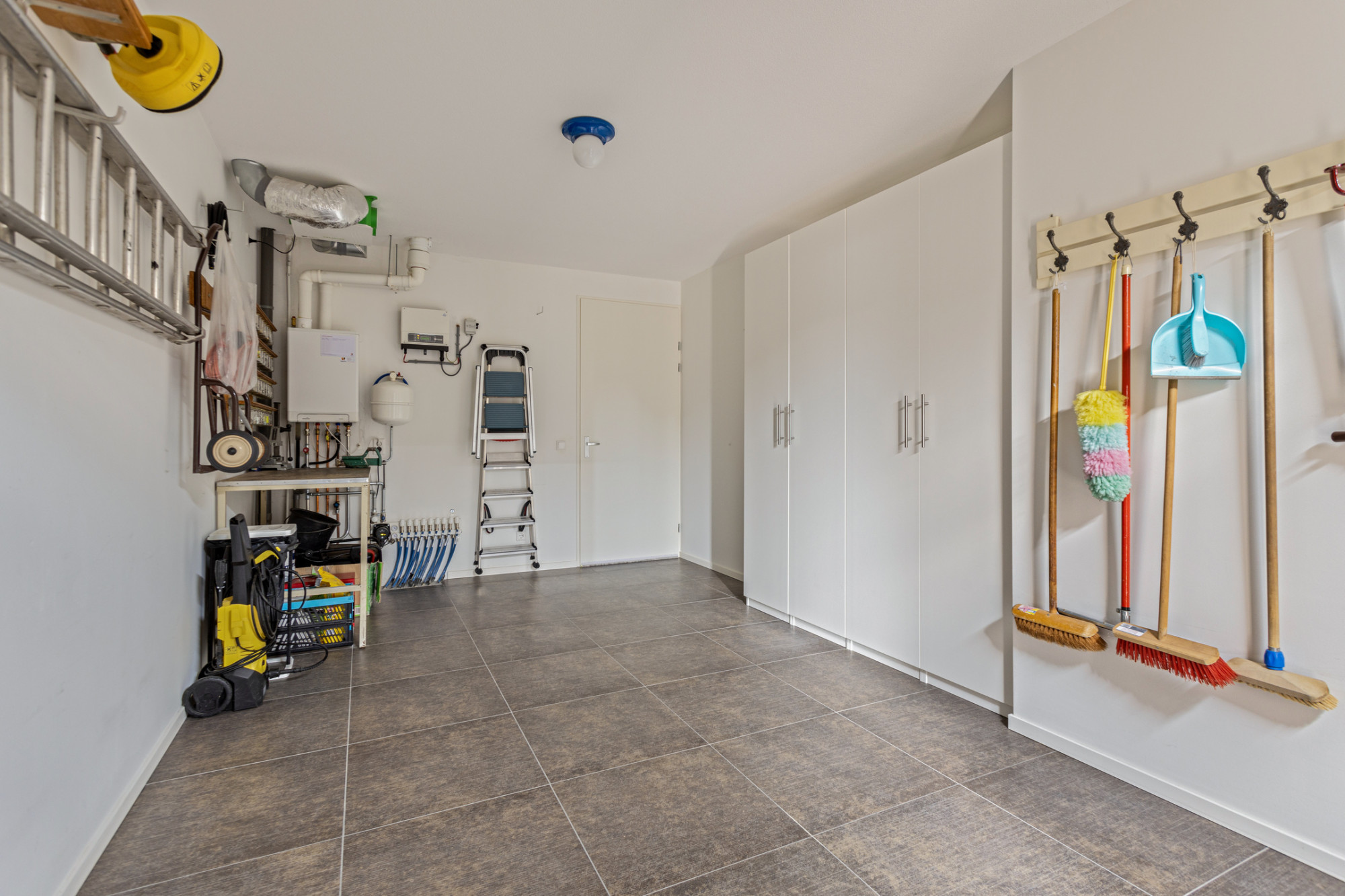 De inpandig te bereiken en verwarmde garage is keurig afgewerkt en voorzien van een tegelvloer, 2 geïsoleerd deuren naar de oprit en de opstelling van de cv-ketel, een 2e omvormer van de zonnepanelen (6 zonnepanelen op het platte dak), de vloerverwarmingsunit en de unit van de mechanische ventilatie.