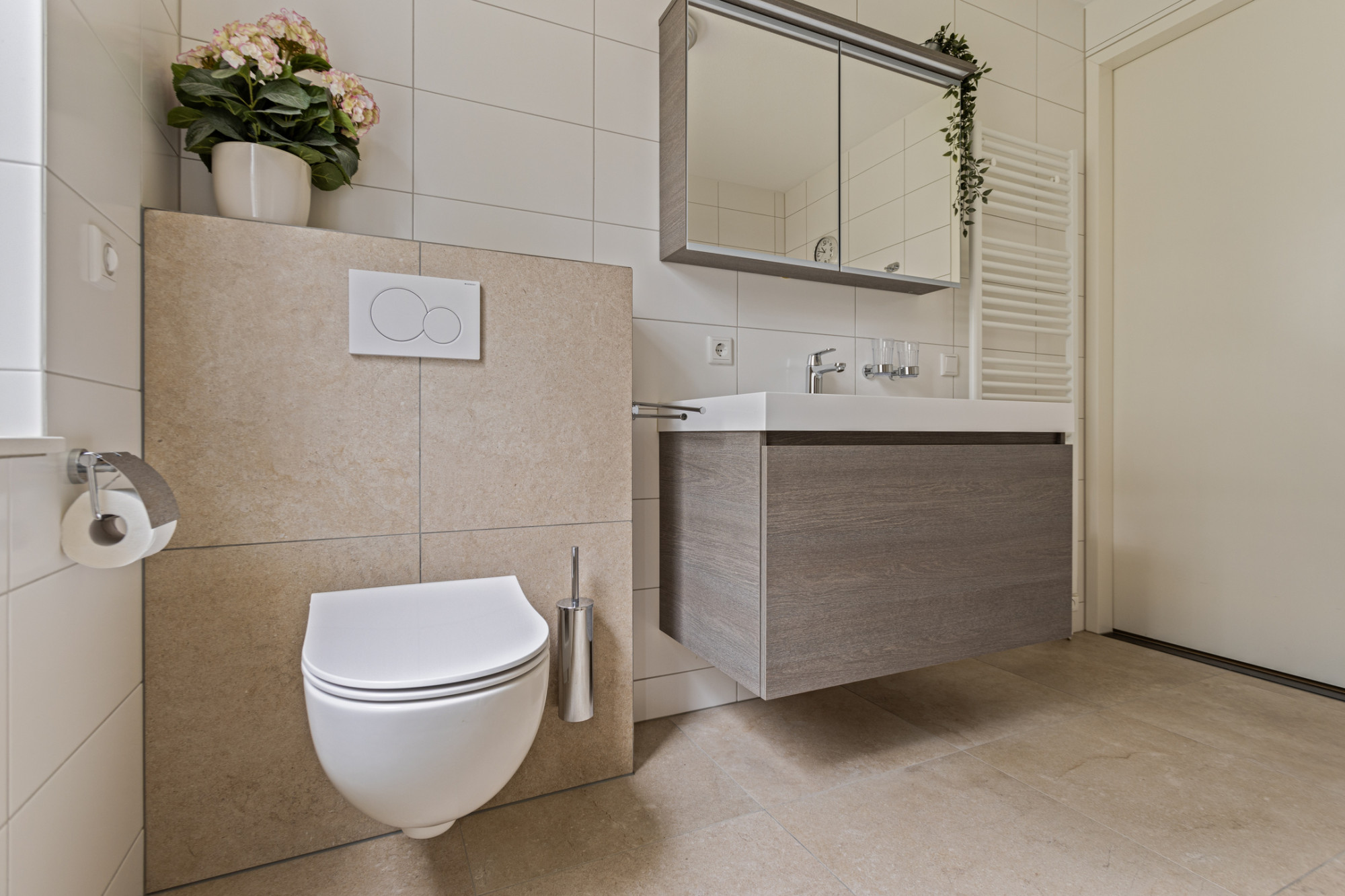 - Gehele begane grond (m.u.v. de garage) voorzien van tegelvloer met vloerverwarming