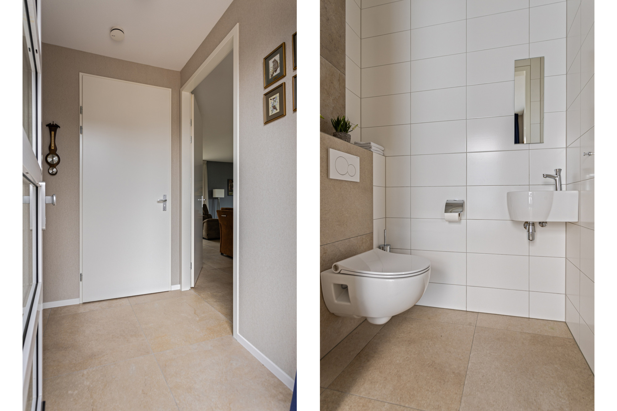 Middels de verharde oprit bereikt u de woning. Na binnenkomst komt u in de hal waar zich de meterkast, een garderobe-nis en een moderne toiletruimte bevinden. De toiletruimte is geheel betegeld en voorzien van een wandcloset en een fonteintje.
