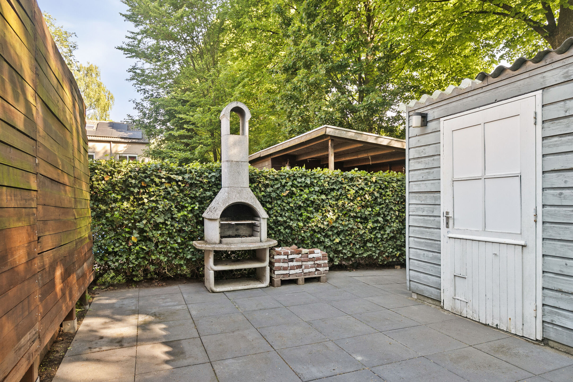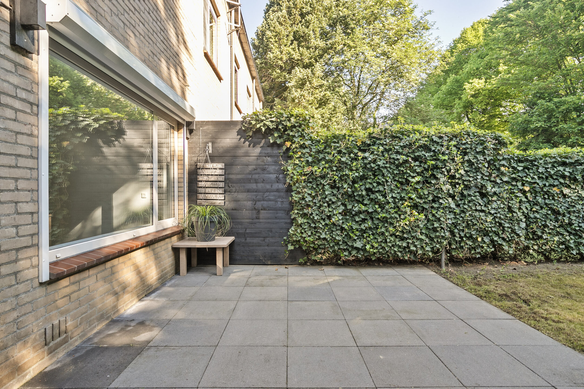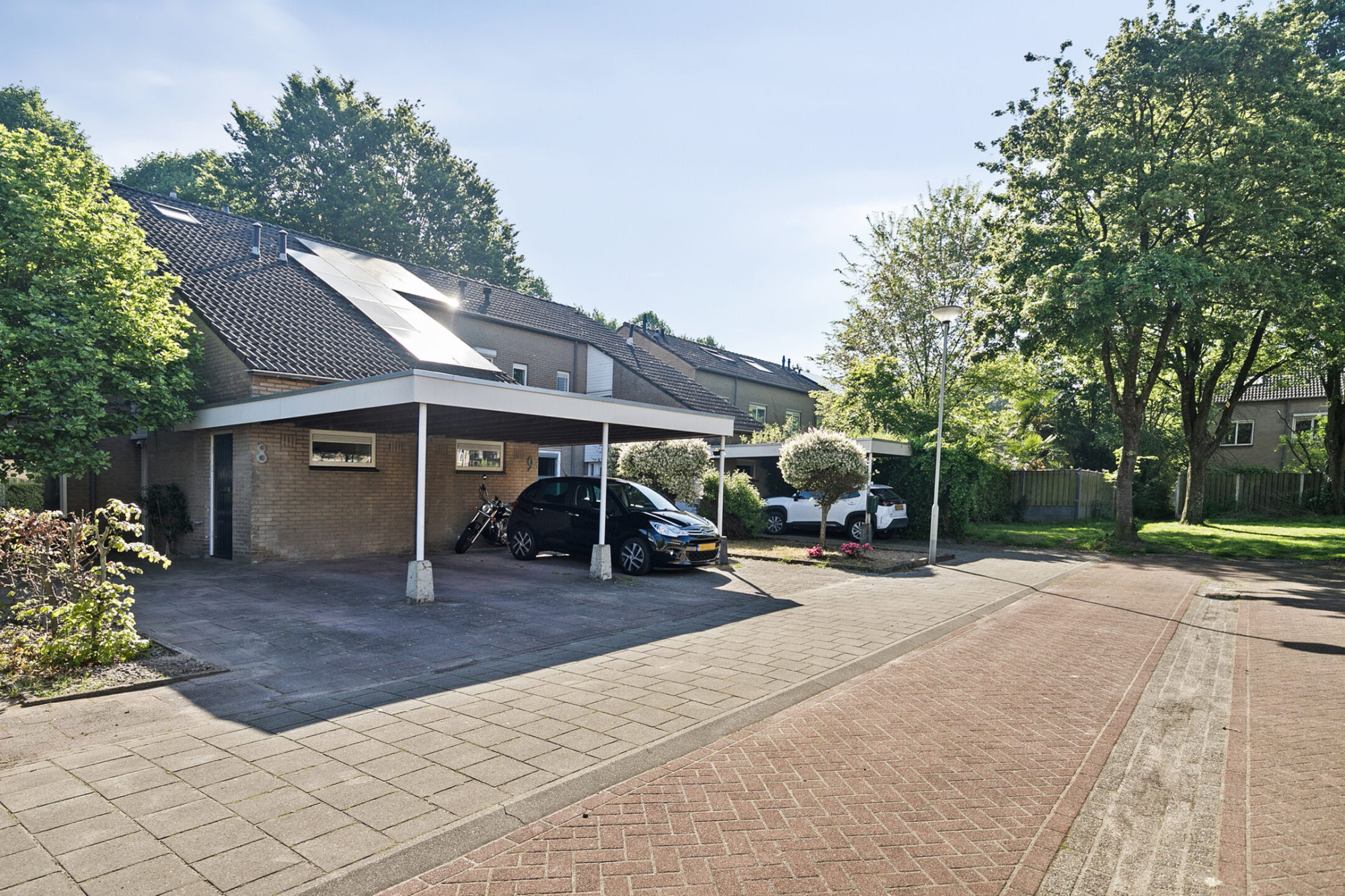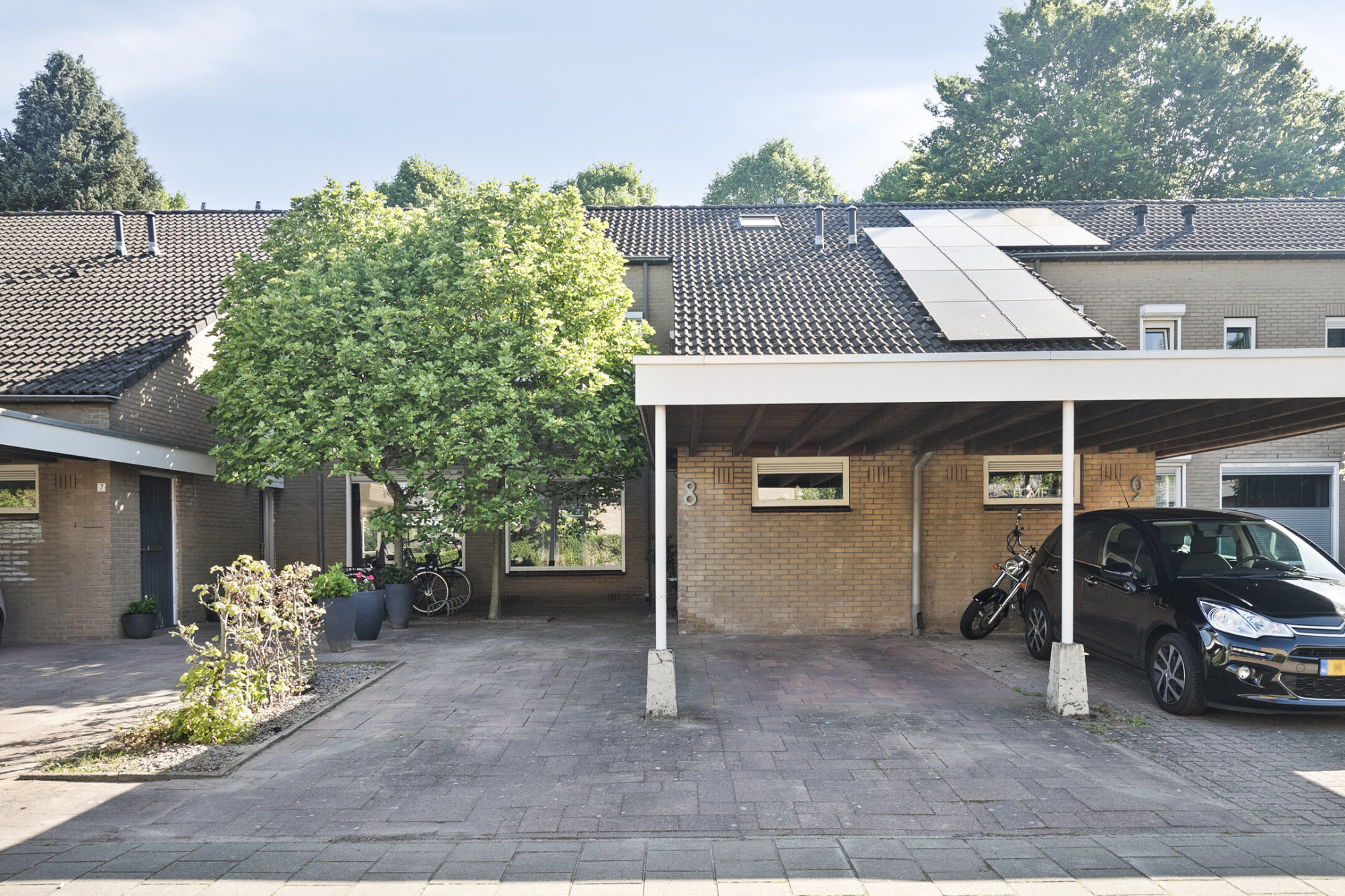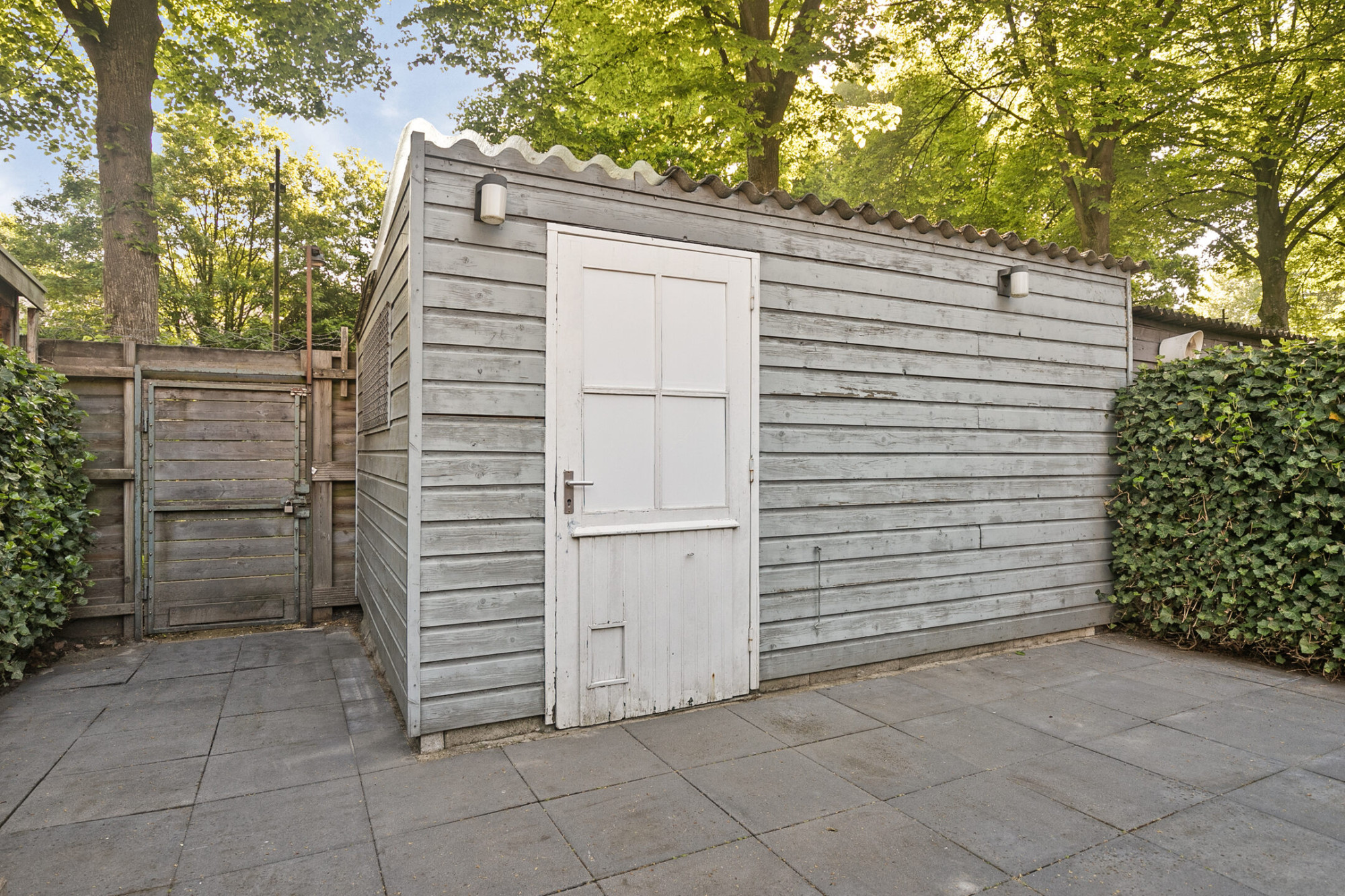 De woning beschikt over een voortuin met carport en toegang tot de berging. Daarnaast een diepe achtertuin met vrijstaande berging, terras, gazon en achterom