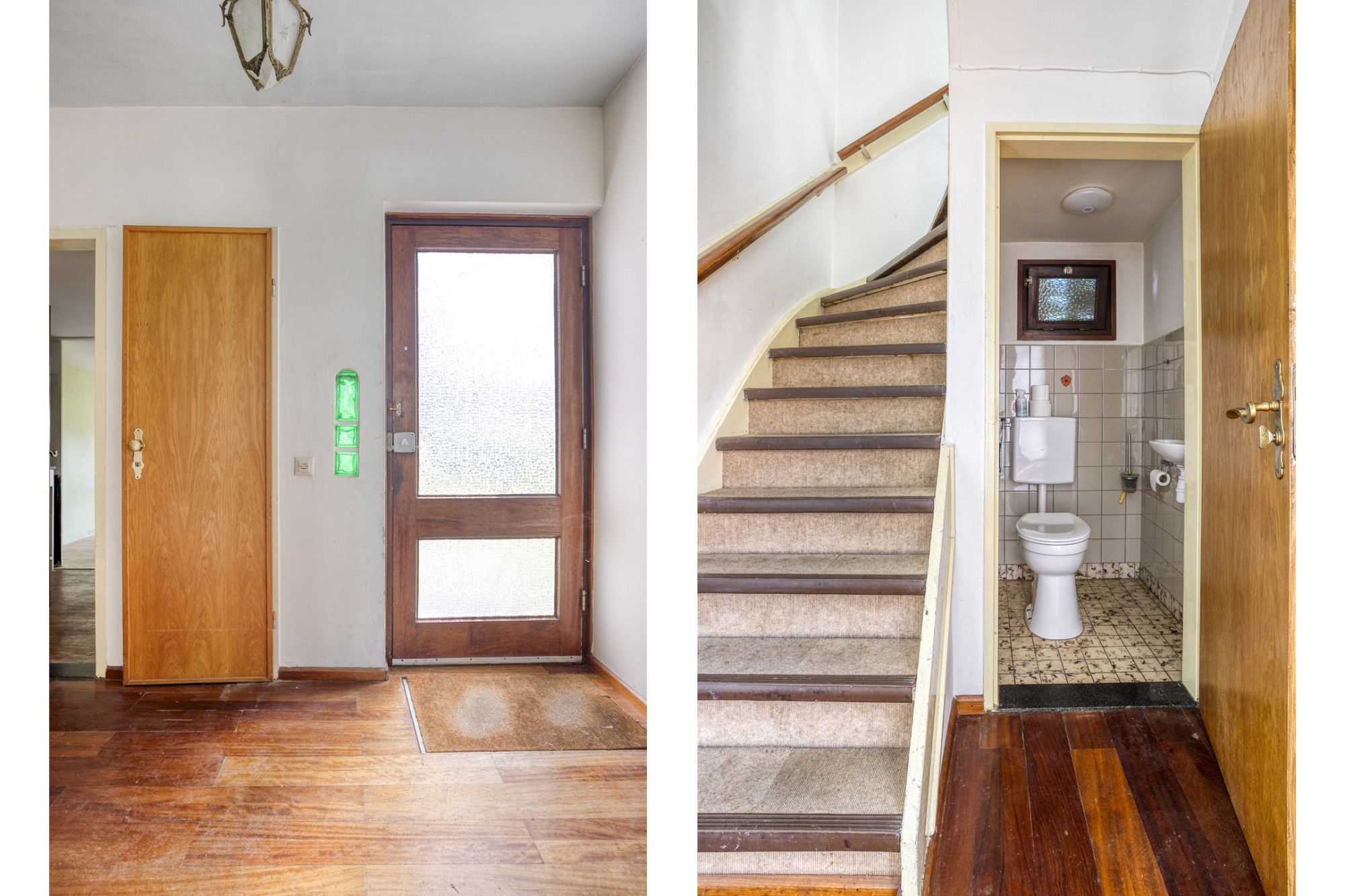 Via de voordeur kom je binnen in de hal van de woning. Hier bevindt zich de meterkast, het toilet en de trapopgang naar de eerste verdieping. Het toilet is betegeld en voorzien van een wastafelfonteintje. Vanuit de hal is tevens toegang tot de woonkamer en een extra ruimte (voormalige garage) die voor diverse doeleinden gebruikt kan worden.
