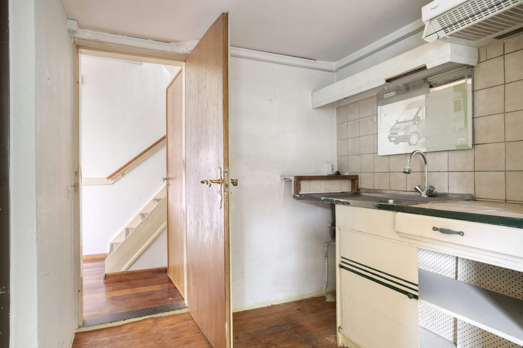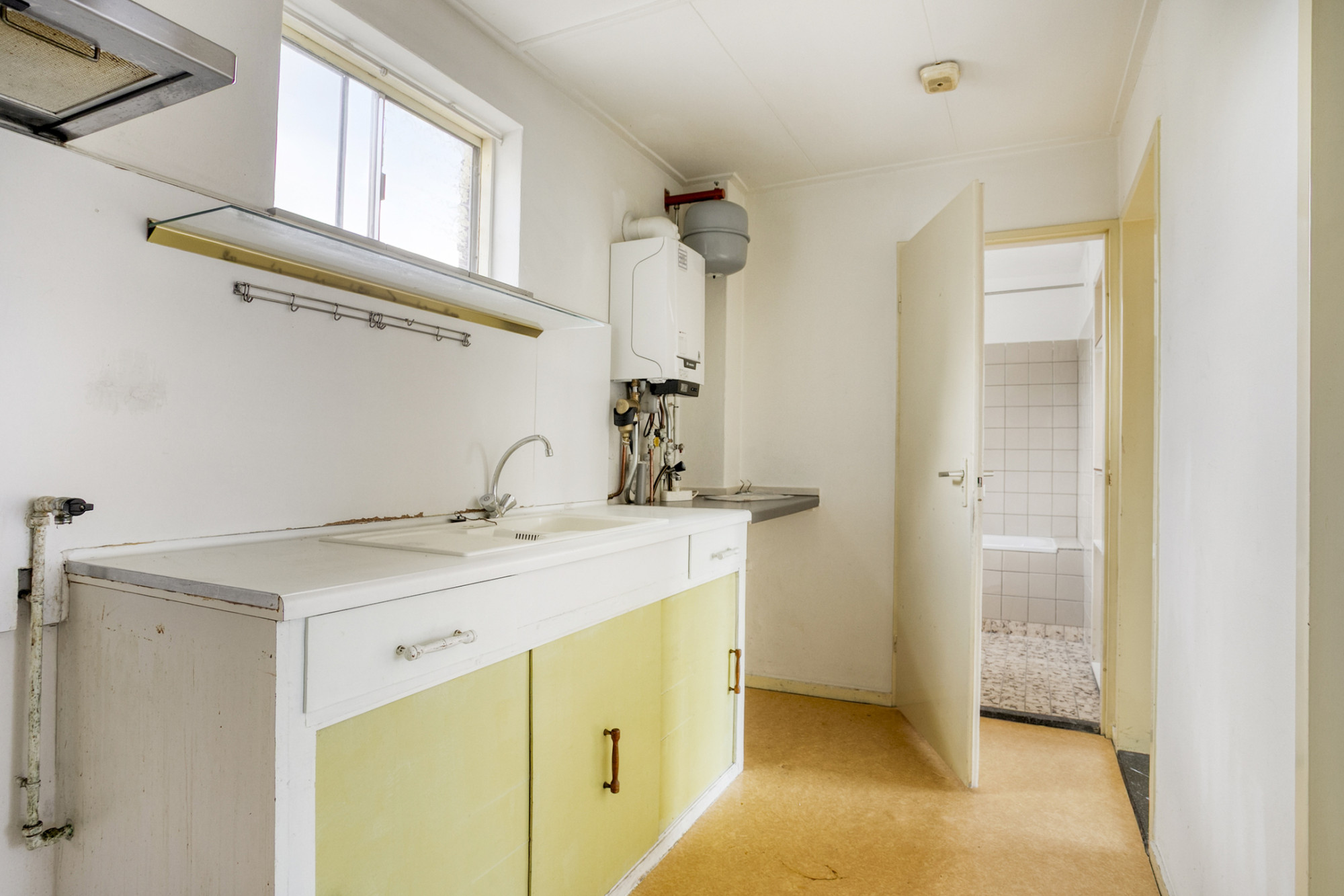 De keuken is direct vanuit de woonkamer toegankelijk. De keuken is eenvoudig uitgevoerd en voorzien van een rechte opstelling met spoelbak en kastruimte. Vanuit de keuken is er toegang tot de tuin.
