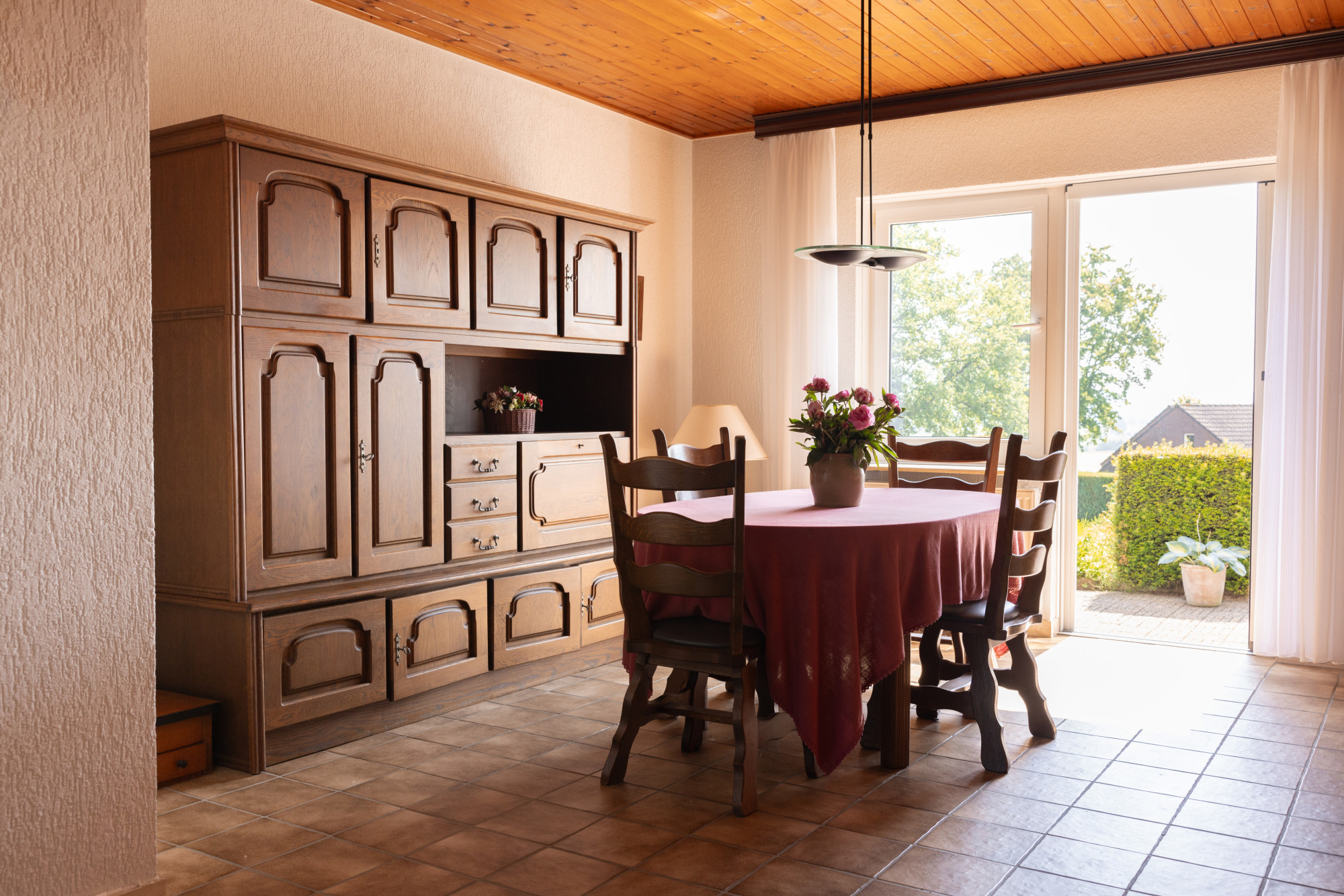 Vanuit de eetkamer komen we rechtstreeks in de gesloten keuken (377 x 276 cm). Ook hier heeft de jaren ’80 styling de overhand. Voorzien van een rustiek eiken keukenblok met inductiekookplaat, oven, afzuigkap, werkblad en 1½ spoelunit.