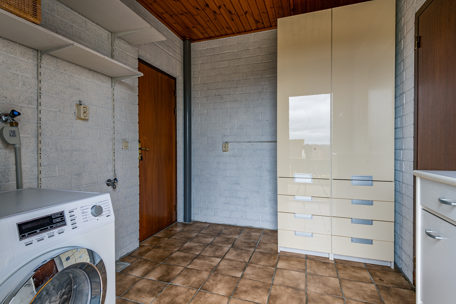 Direct naast de keuken bevindt zich de berging met aansluiting voor wasmachine en eventueel droger. Er blijft nog voldoende plaats over voor een vriezer, garderobe etc.