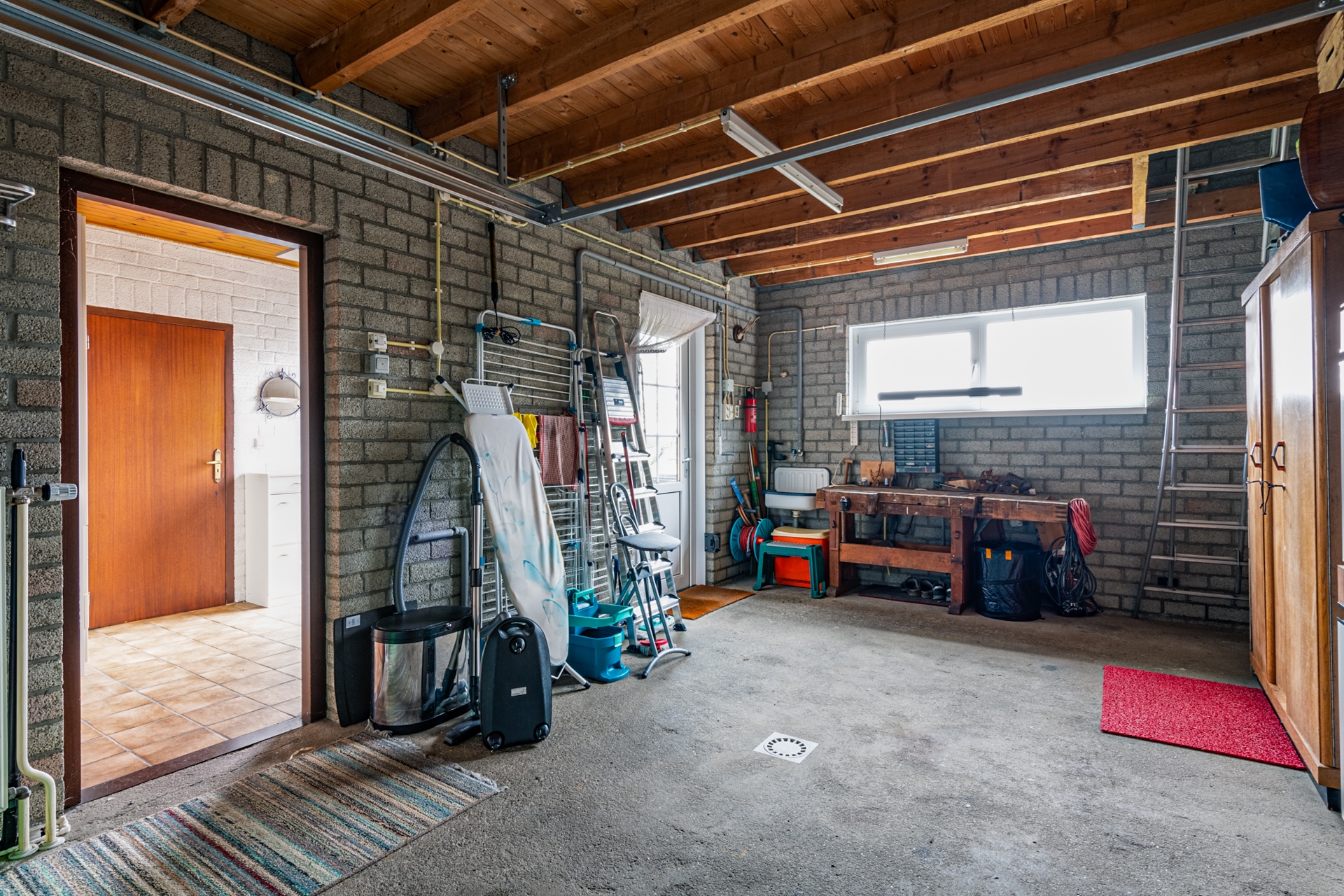 Rest de inpandige garage (594 x 373 cm) met vliering. De auto kan hier prima binnen staan. De elektrische roldeur laat je zo naar buiten rijden. Maar ook fietsen, scooter en meer kunnen hier geparkeerd worden.