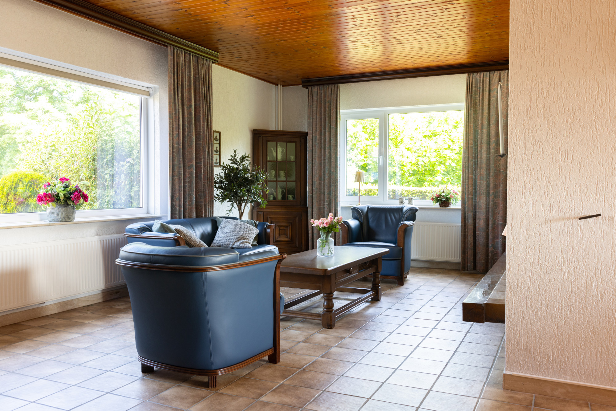 De ruime woonkamer (in L-vorm, 696 x 397 cm) met eetkamer (420 x 395 cm) heeft door de grote raampartijen een mooie lichtinval en uitzicht. De vloer is voorzien van een keramische, bruine tegel. Deze tegel is over de gehele benedenverdieping gelegd tot en met de berging. Dit geeft de woning een mooi samenhangend geheel. De wanden zijn met granol afgewerkt en ook hier geldt dat dit over de gehele begane grond is uitgevoerd. Plafonds zijn in jaren ’80 stijl met houten schroten en bruin gelakt. De ouderslaapkamer (428 x 337 cm) vinden we aan de voorzijde van de woning. De badkamer (245 x 215 cm) met douche, dubbele wasbak en toilet is ruim van opzet.