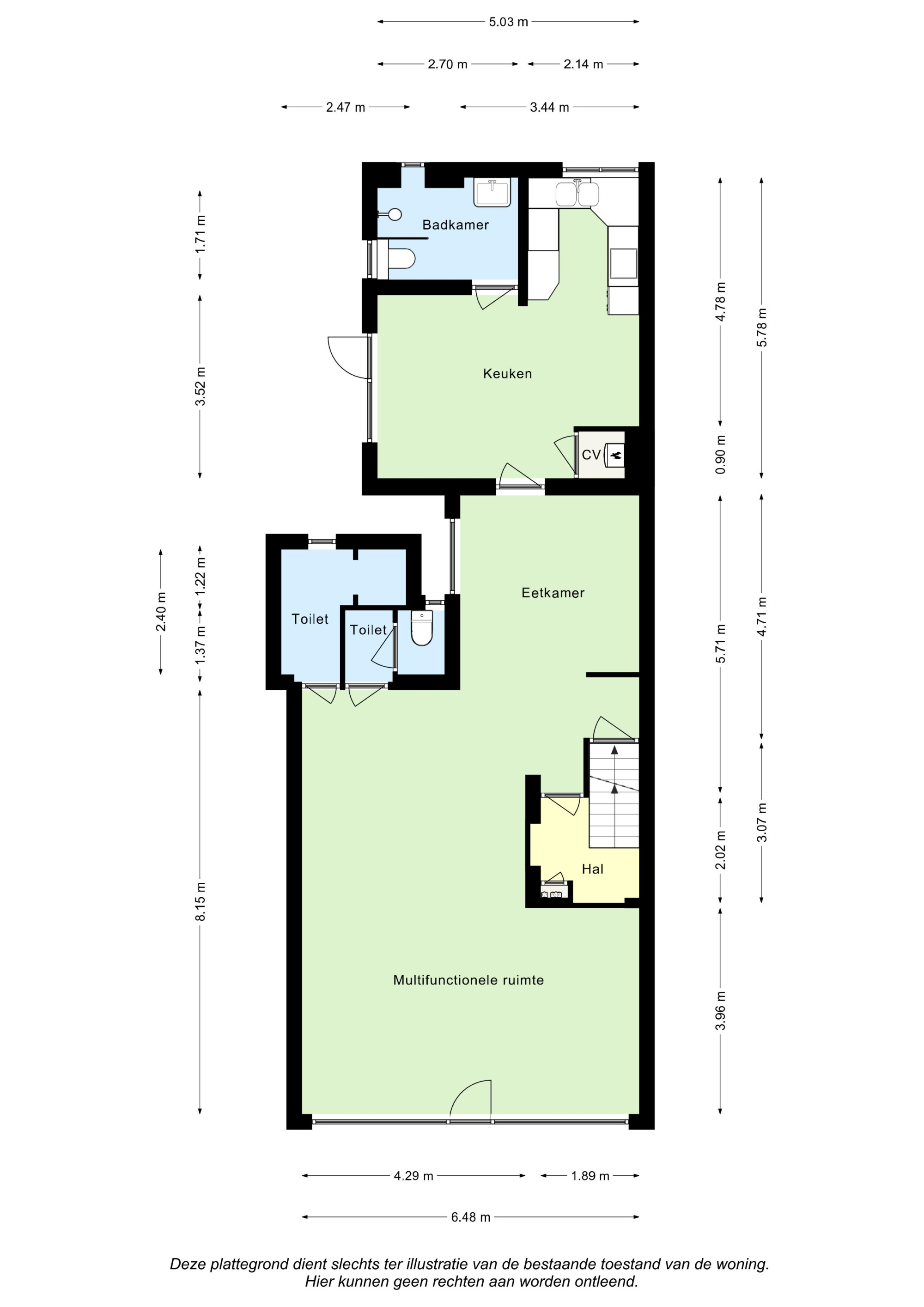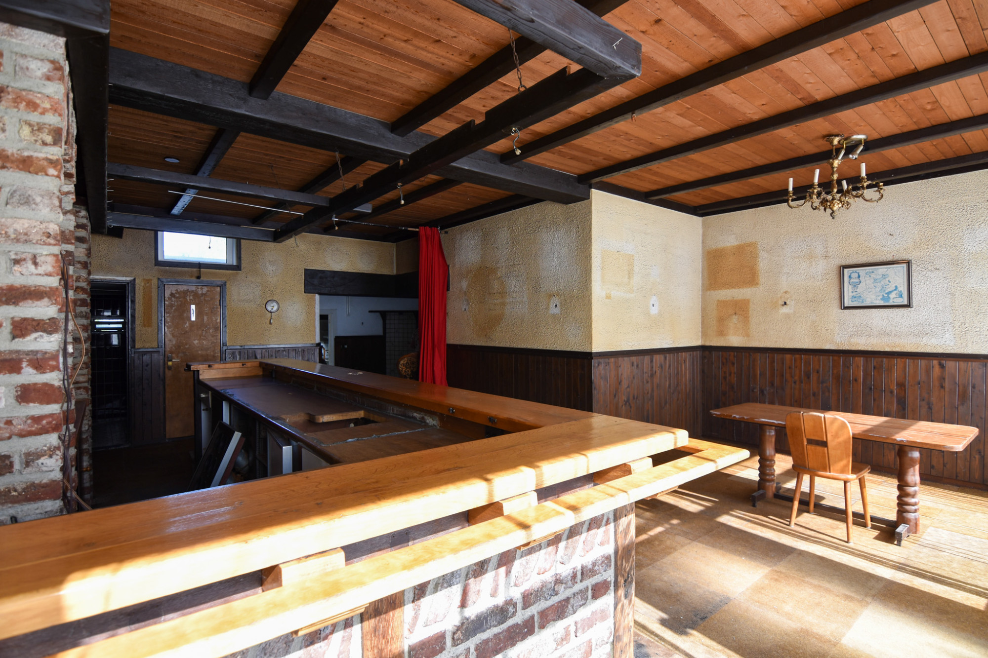 Entree, voormalig café (8,15m x 6,48m/4,29m) met heren en dames toilet. Vanuit het café bereikt men de eet-/zitkamer (4,71m x 3,44m) met deur naar kelder en trapopgang naar verdieping.