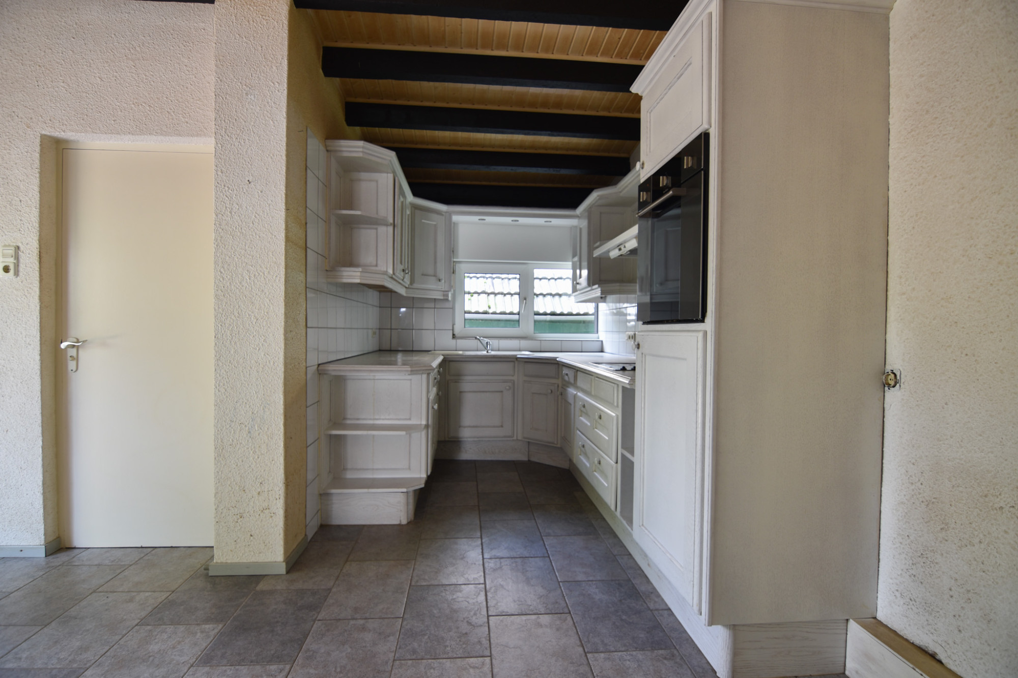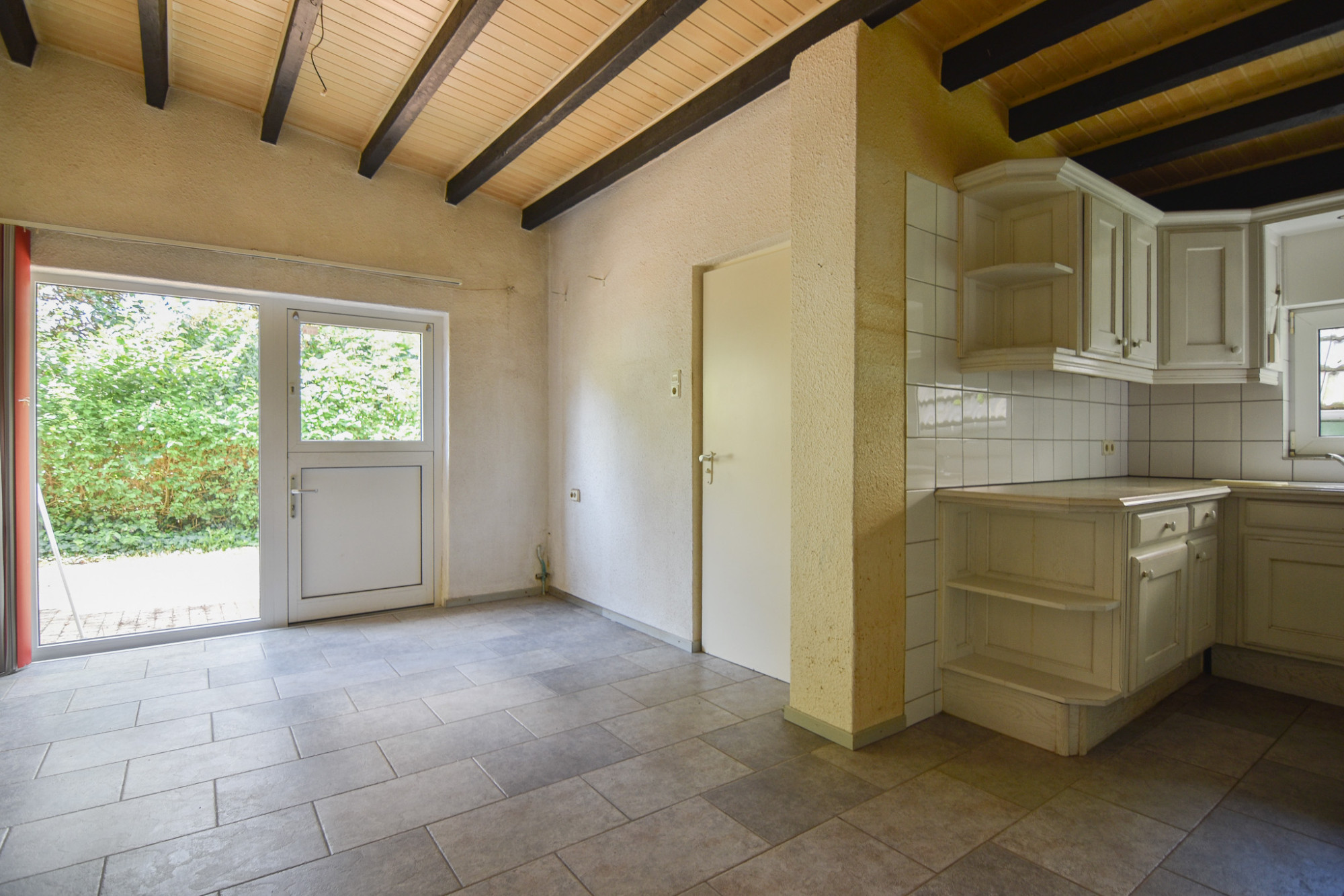 De ruime separate keuken (3,52m x 5,03m) bevindt zich achter de eet-/zitkamer. De keuken is v.v. een plavuizenvloer en deur naar badkamer en tuin. Tevens is hier ook de c.v. ketel geplaatst.