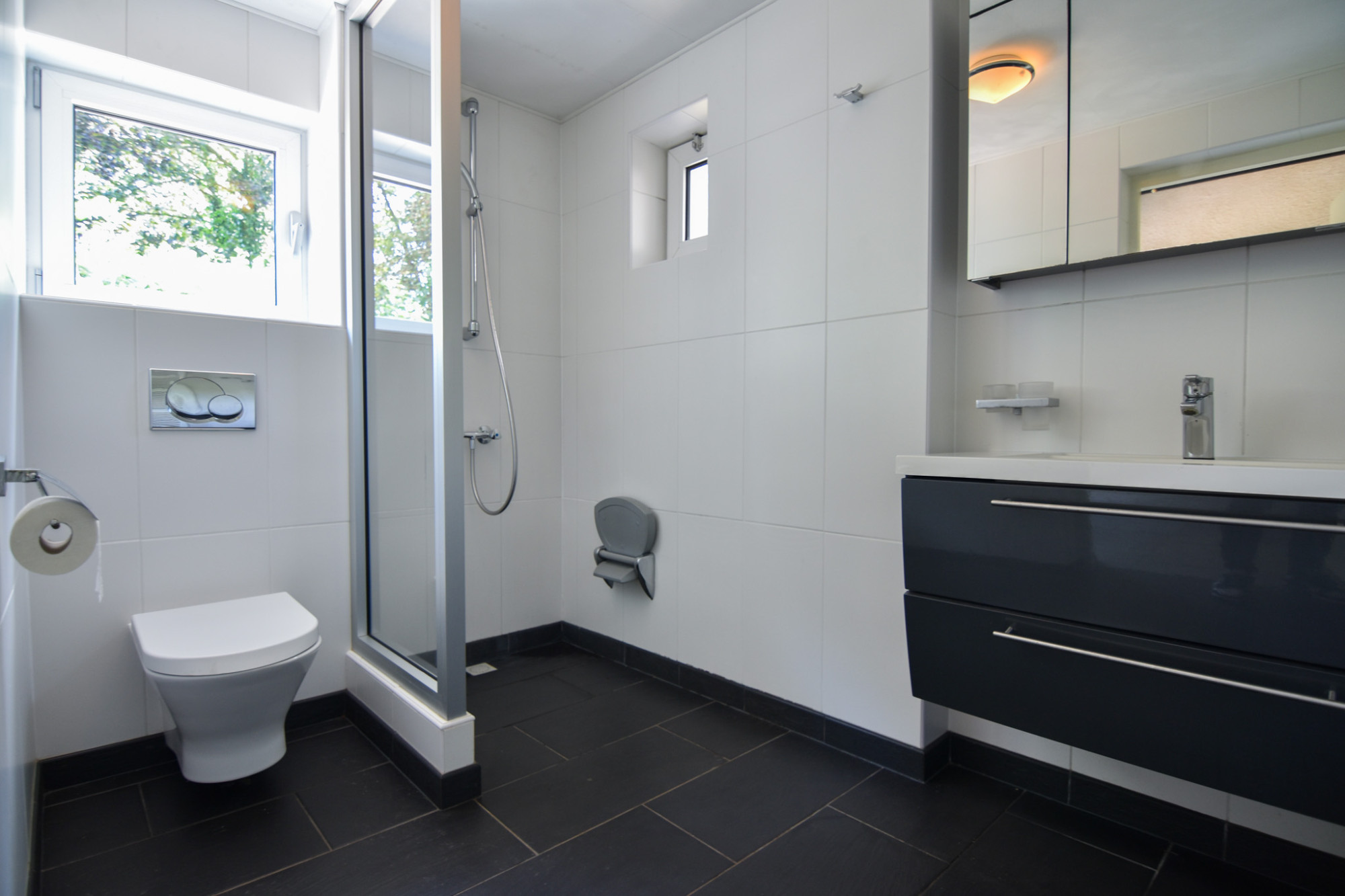 Moderne betegelde badkamer (1,71m x 2,70m) met inloopdouche, wastafelmeubel en toilet