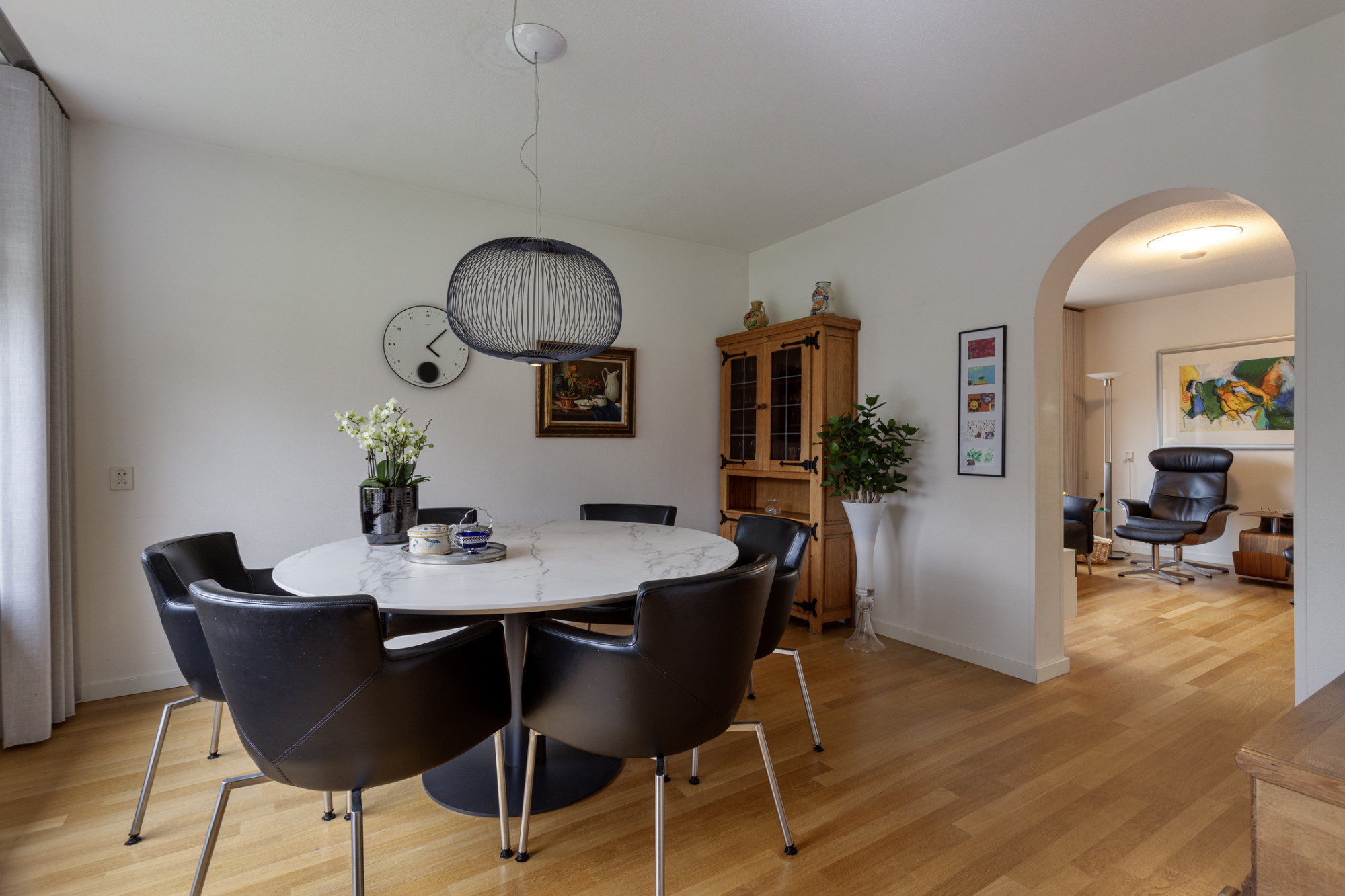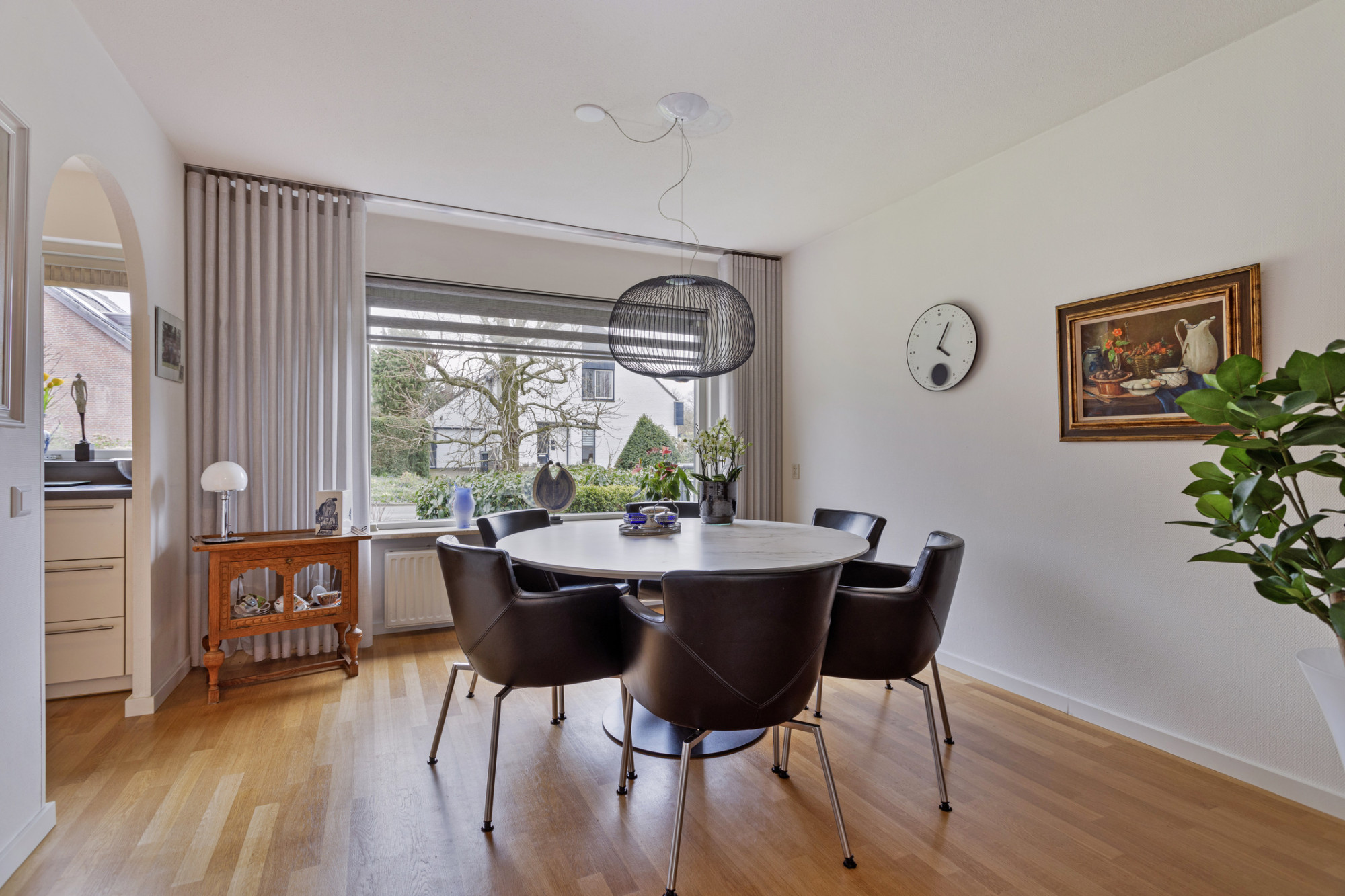 Eetkamer (4.08 x 3.58 m) voorzien van parketvloer.