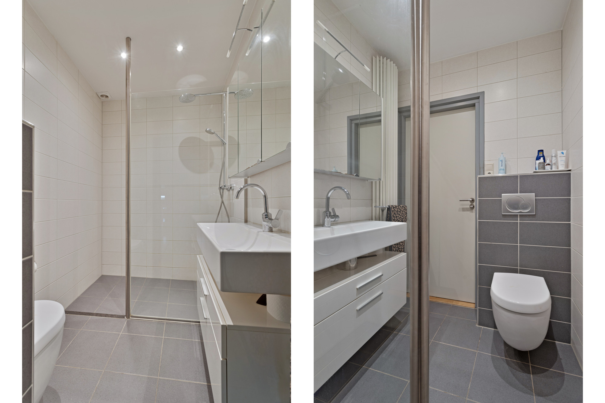 Badkamer (2.33 x 1.64 m) met ruime inloopdouche, zwevend toilet en brede wastafel met badmeubel.