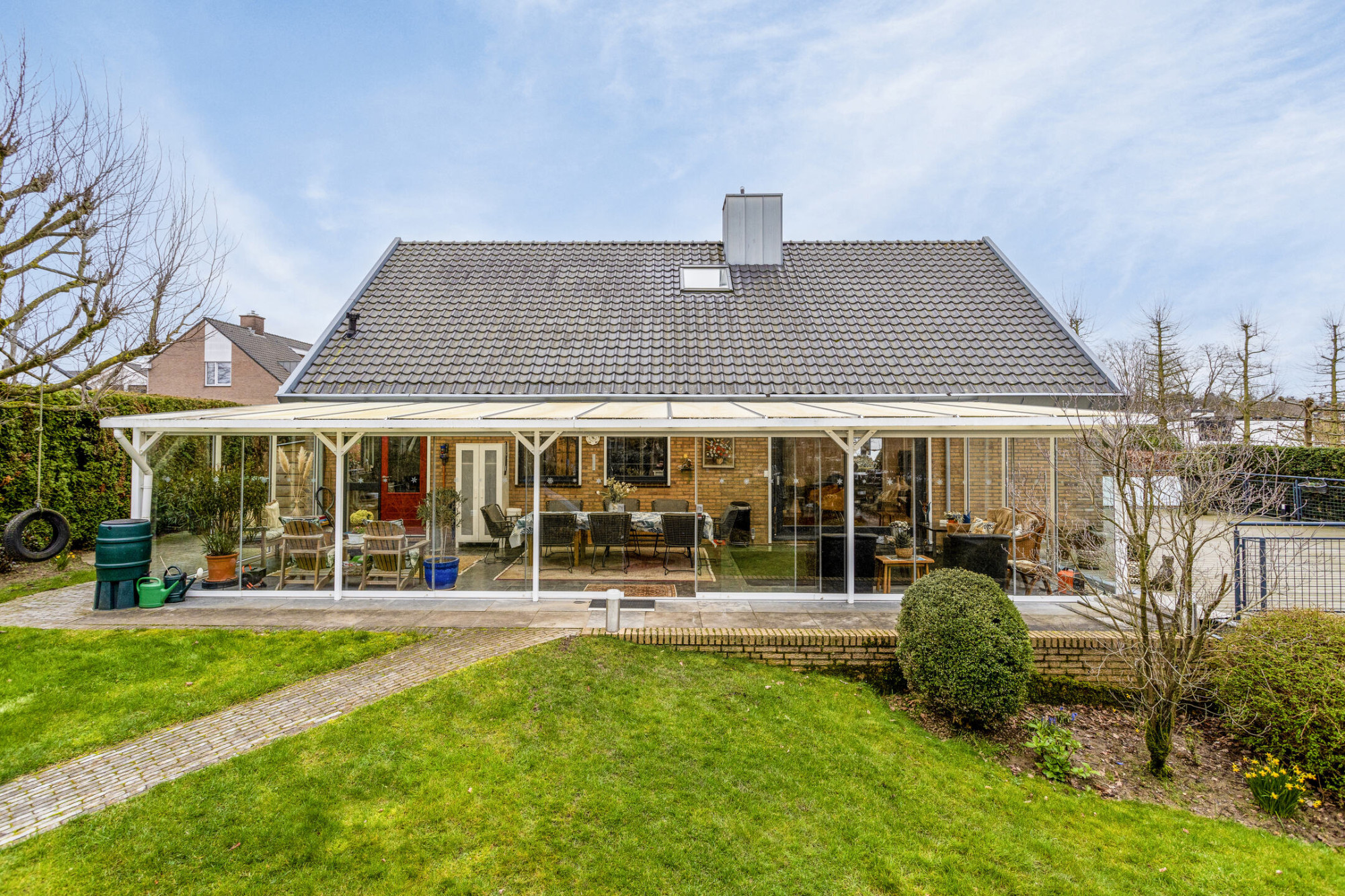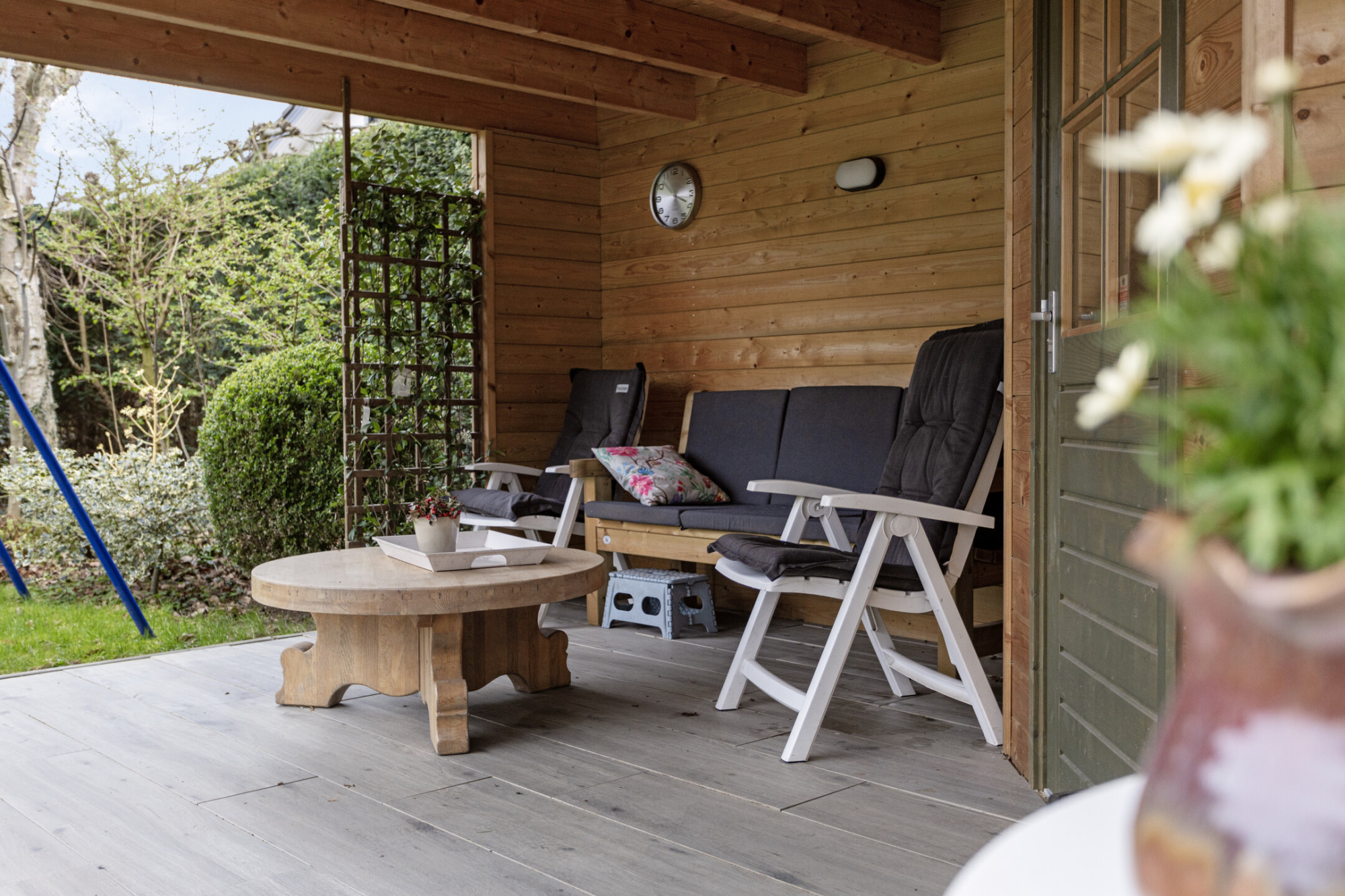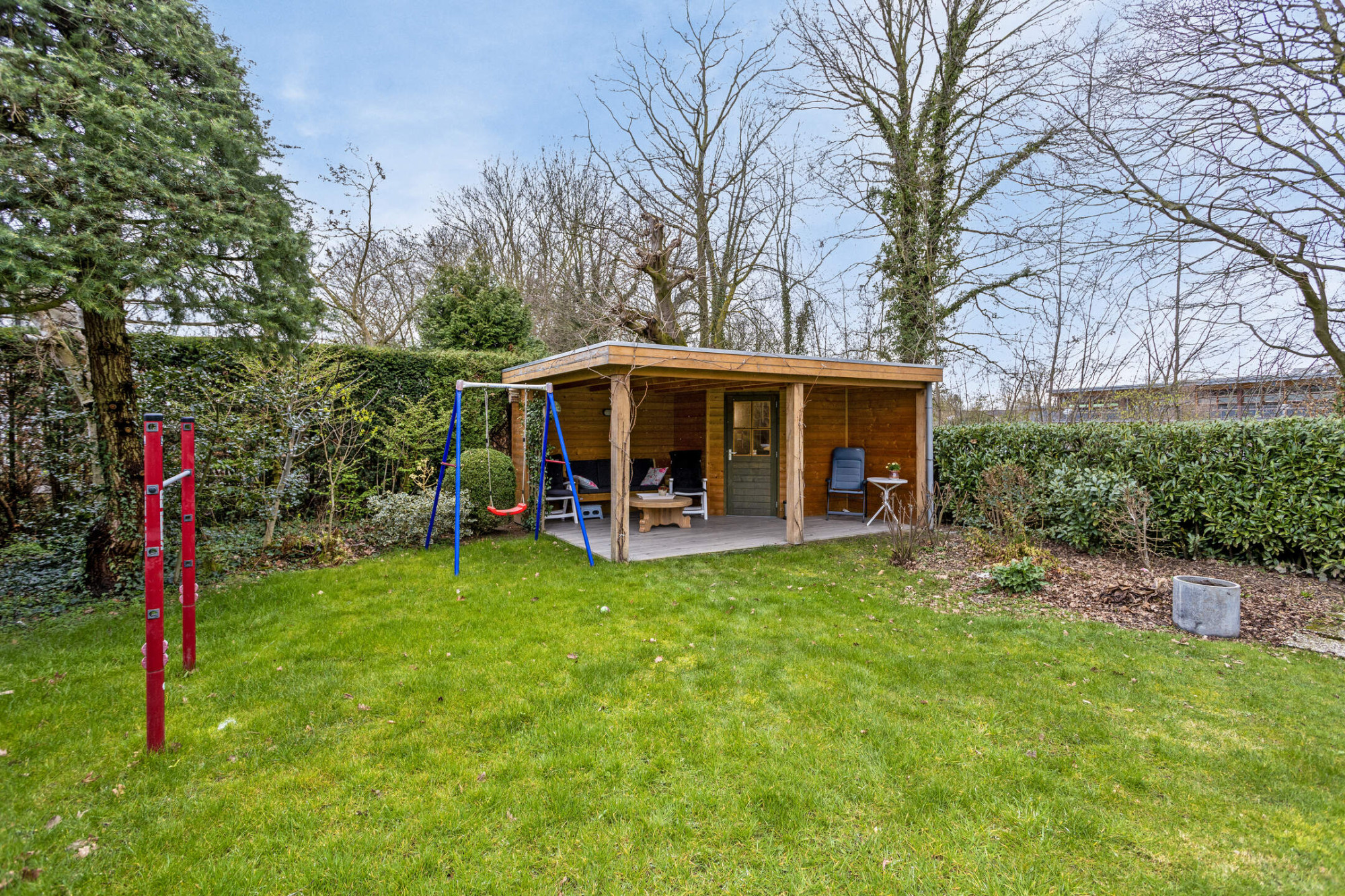 Achtertuin met terrassen, gazon, aanplanting, speeltoestellen en houten tuinhuis (2.06 x 2.06 m) met overkapping (5.03 x 3.73 m). Tevens is er een achteringang via afsluitbare poort aanwezig.
