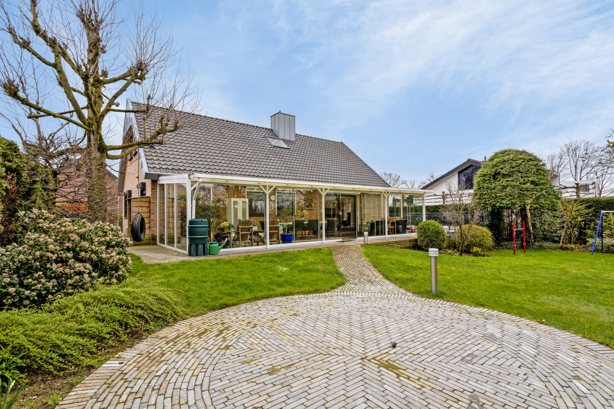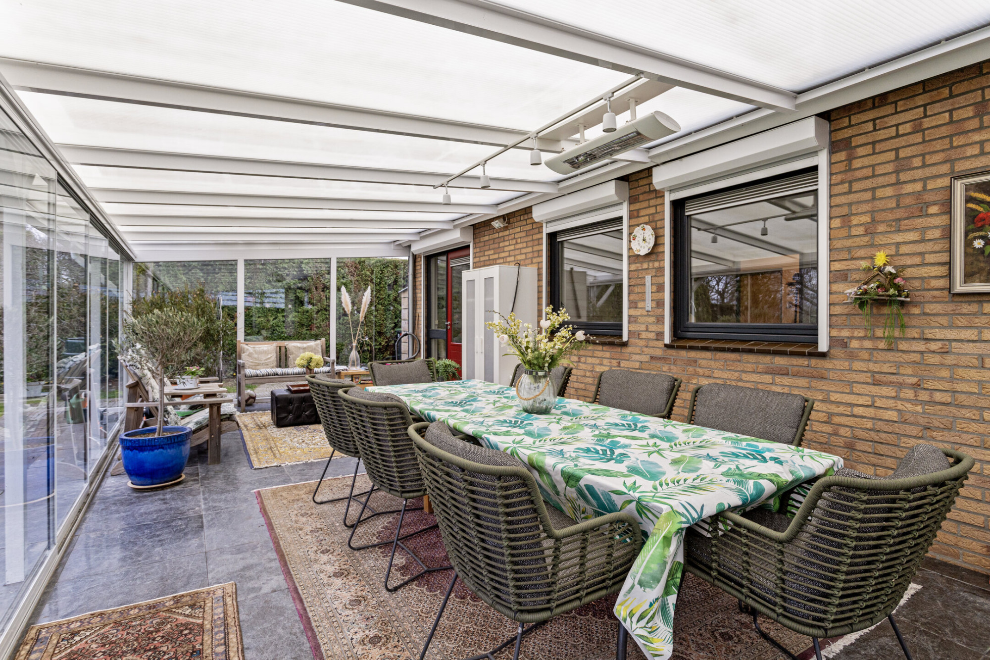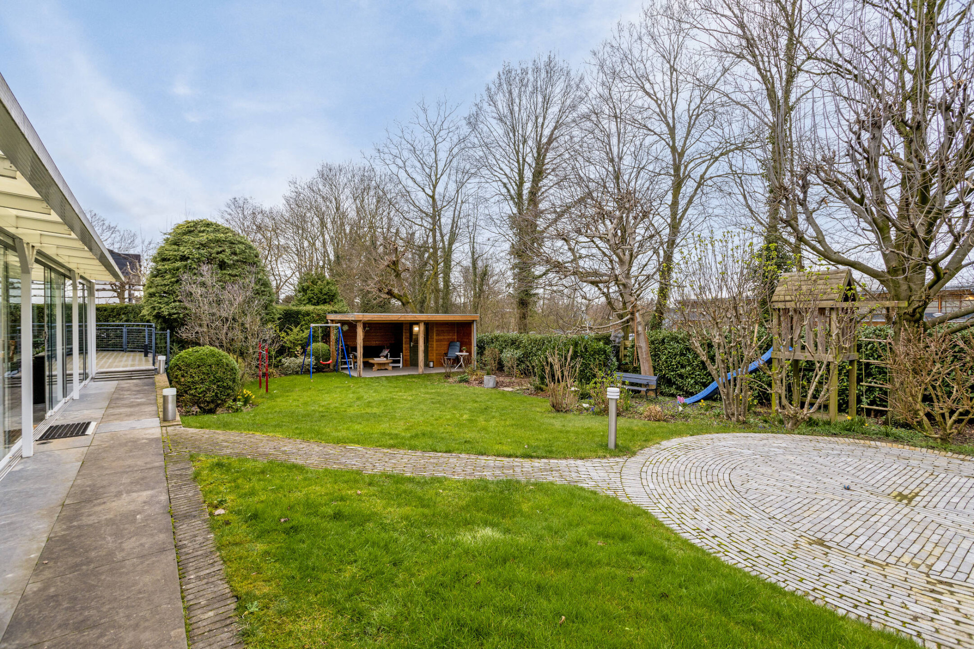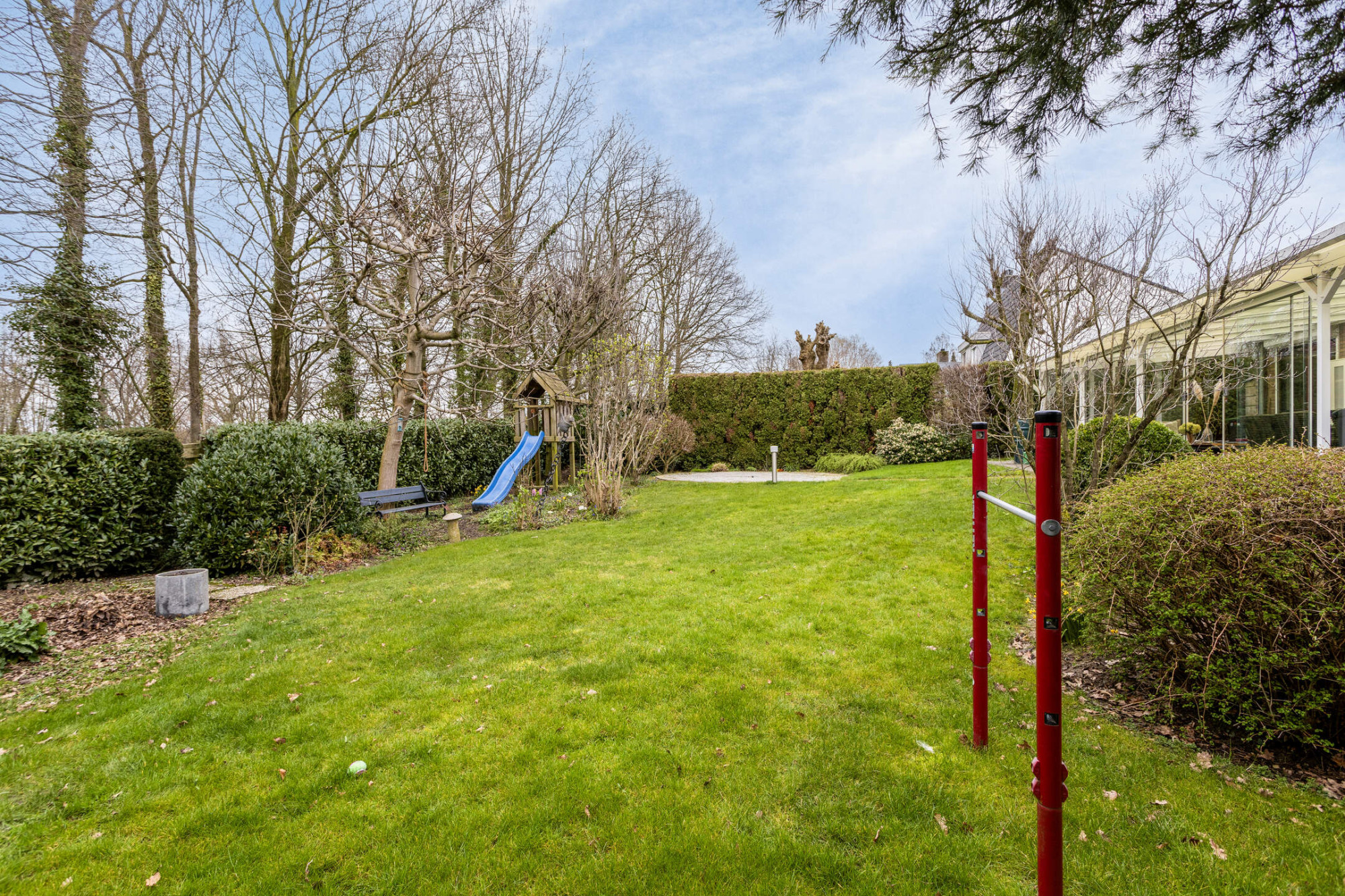 Achtertuin met terrassen, gazon, aanplanting, speeltoestellen en houten tuinhuis (2.06 x 2.06 m) met overkapping (5.03 x 3.73 m). Tevens is er een achteringang via afsluitbare poort aanwezig.