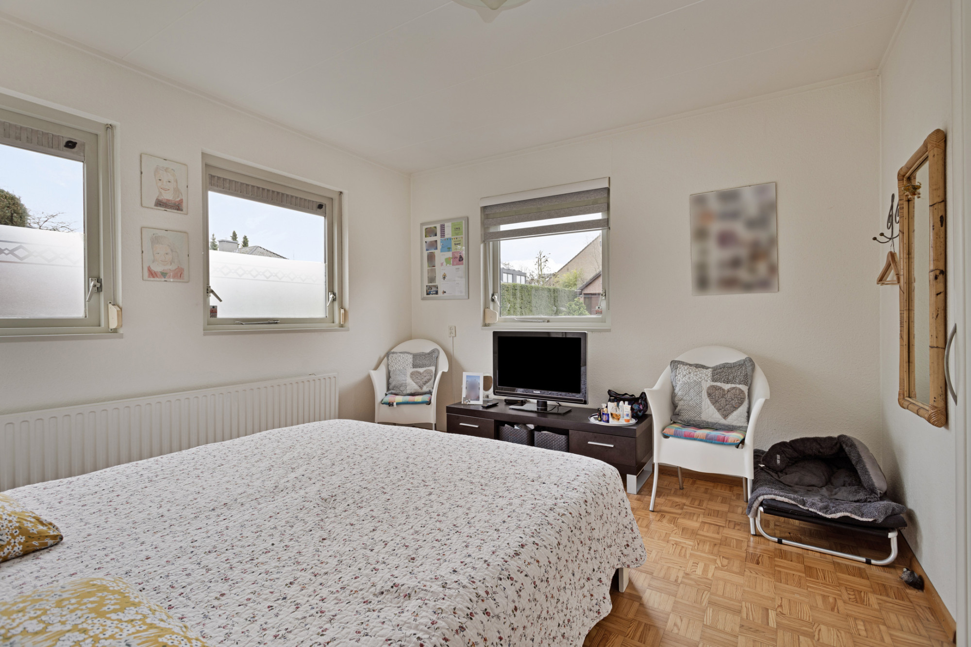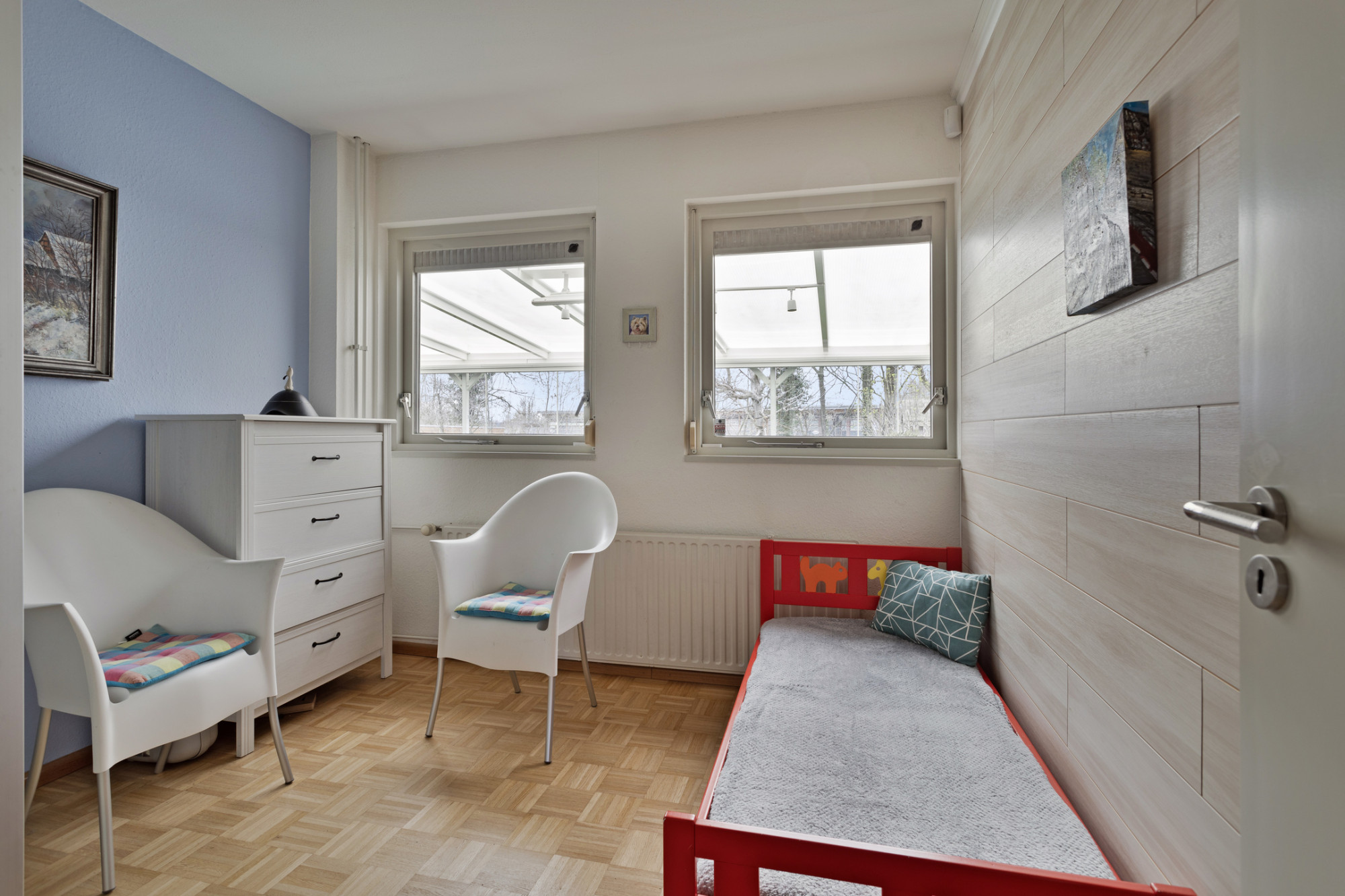 Slaapkamer 2 (3.55 x 2.98 m) voorzien van parketvloer en met toegang naar de tuin.