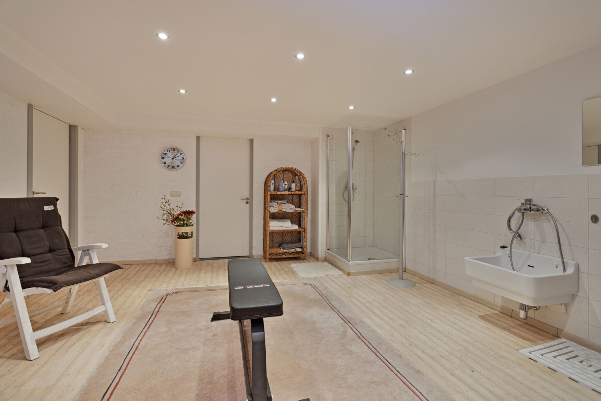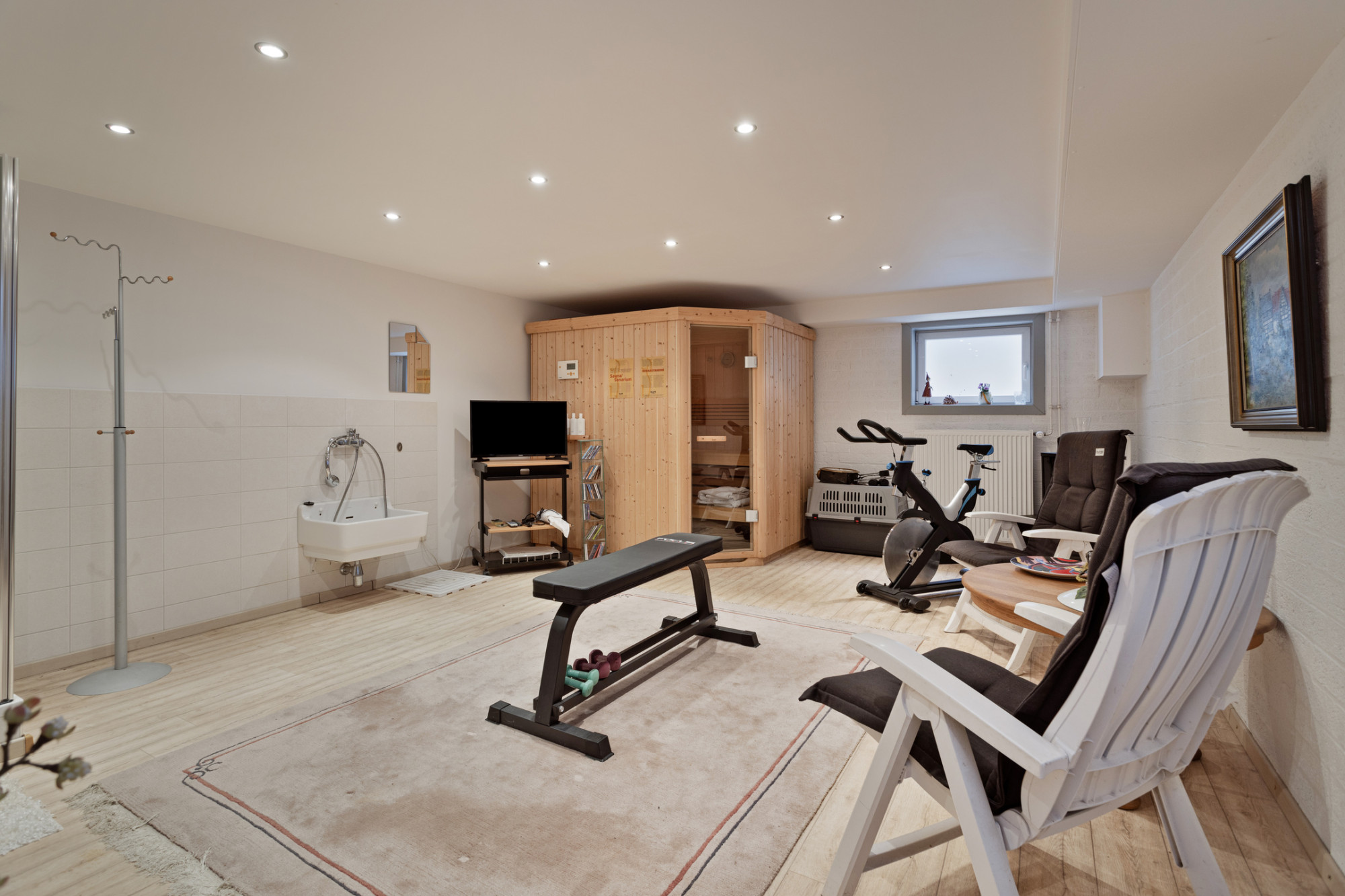 Wellness ruimte 2 (6.44 x 4.50 m) voorzien van tegelvloer en met douche cabine, sauna, wasbak en inbouwverlichting.