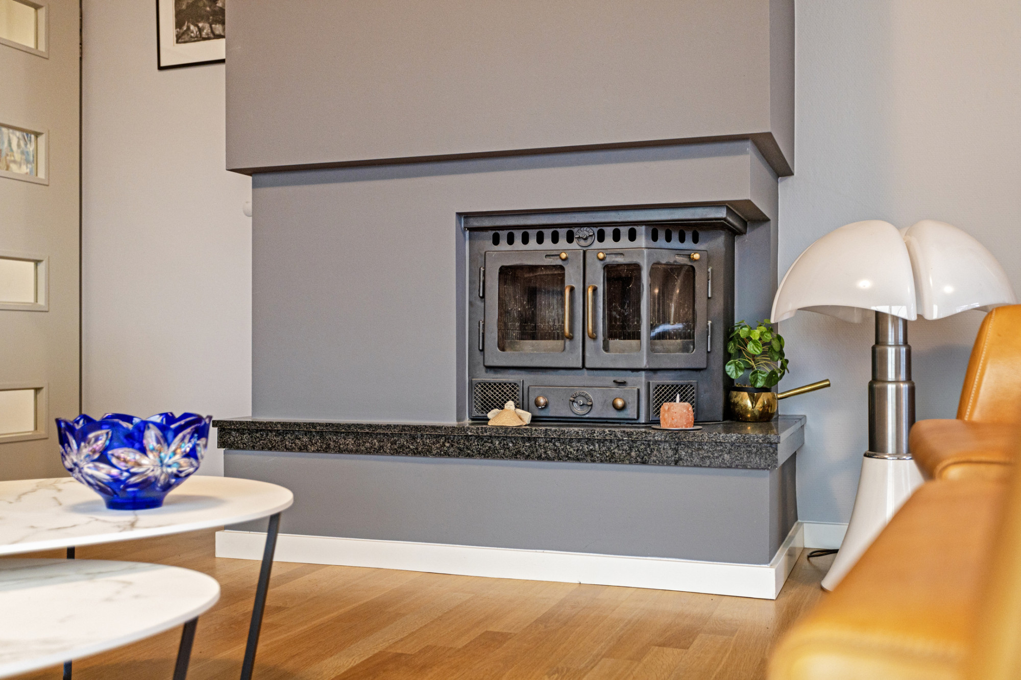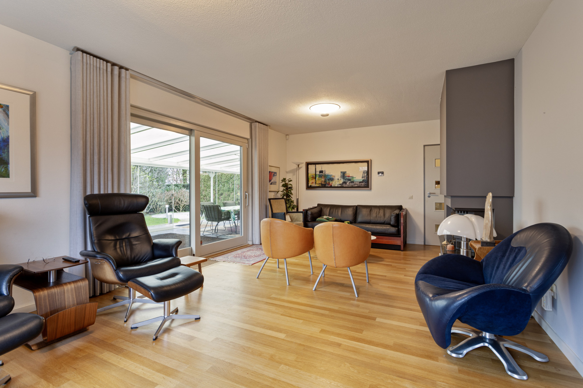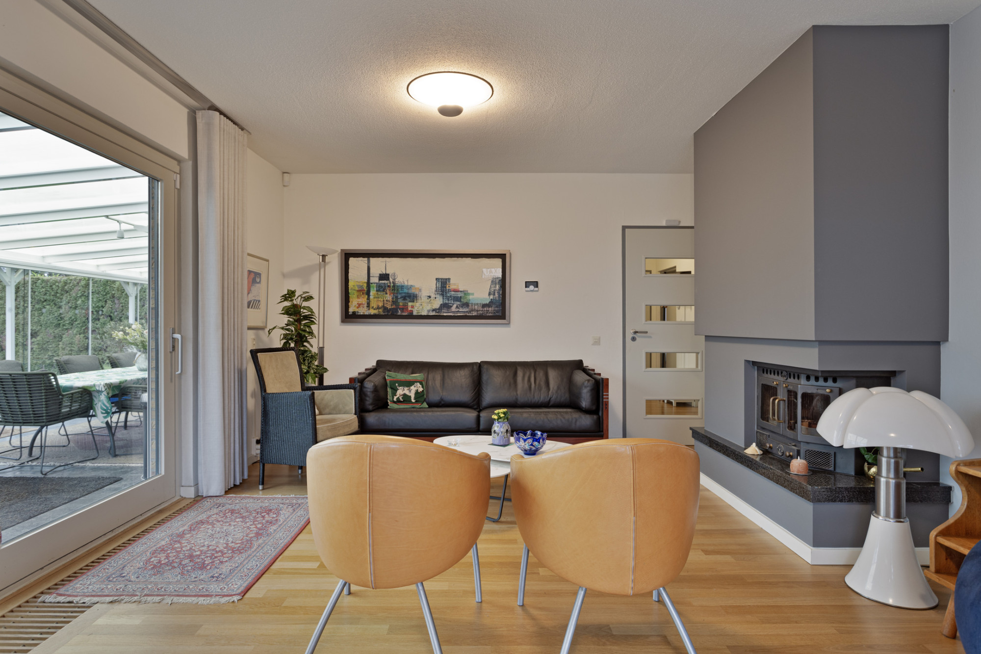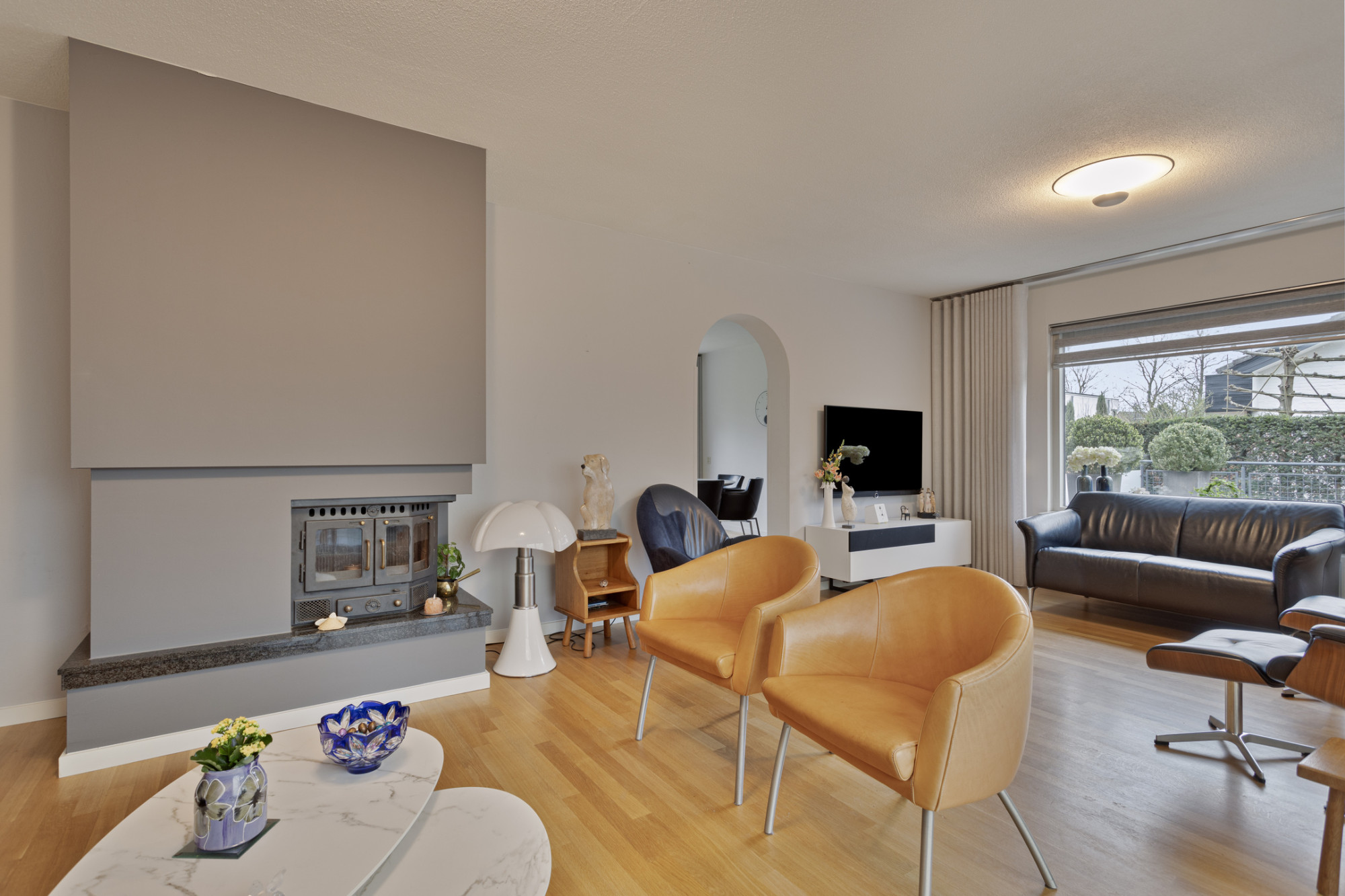 Living (7.18 x 4.09 m) voorzien van mooie parketvloer, open haard/houtkachel en schuifpui naar de serre.