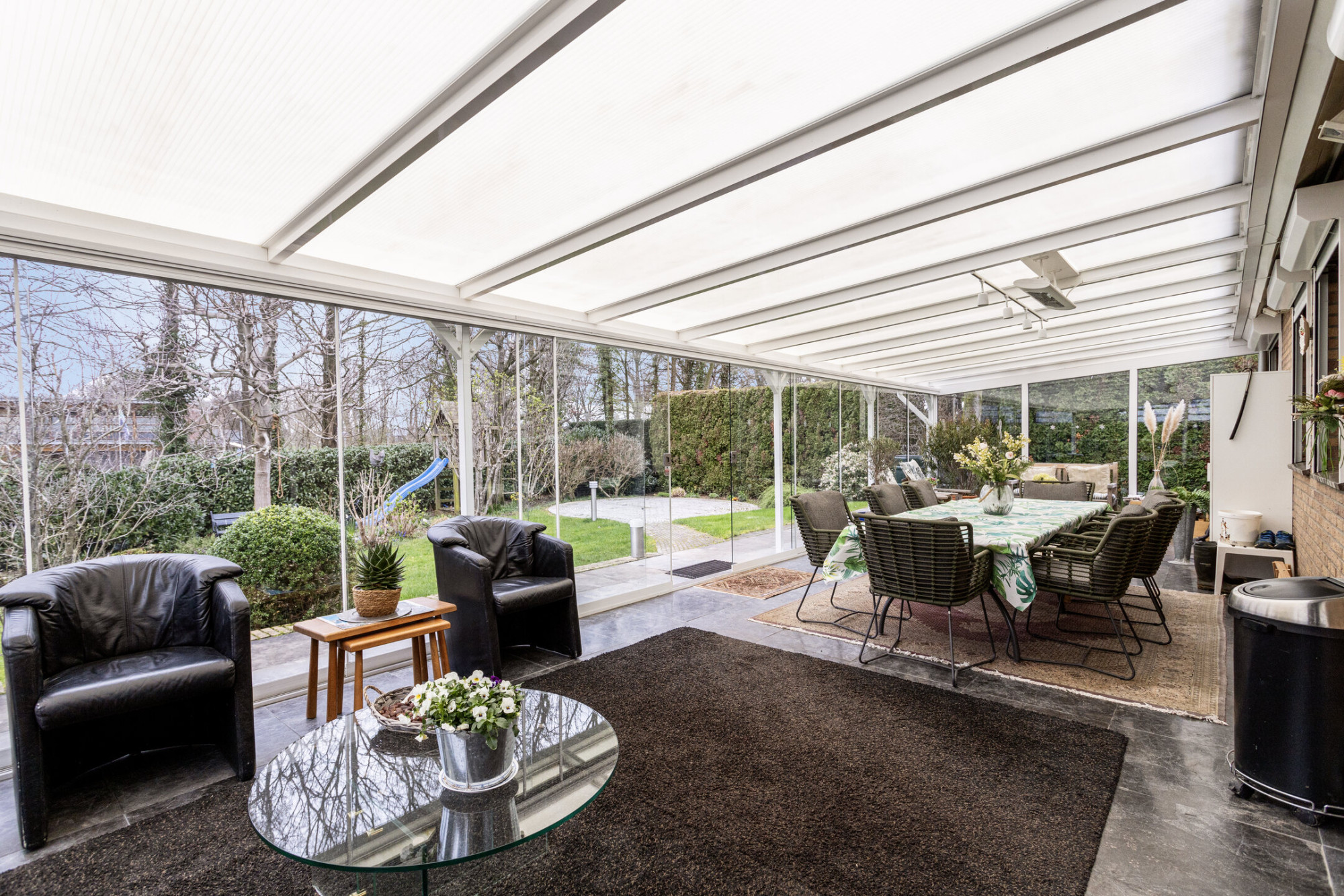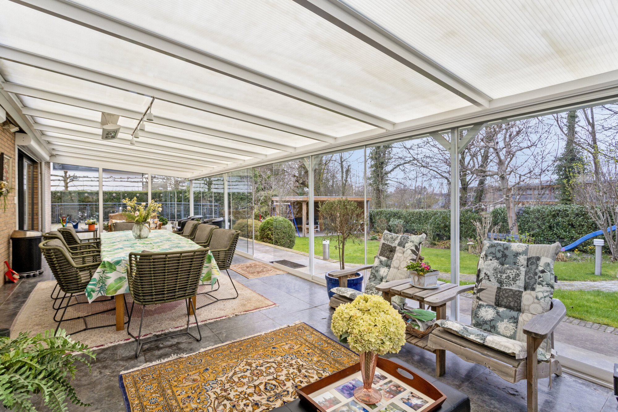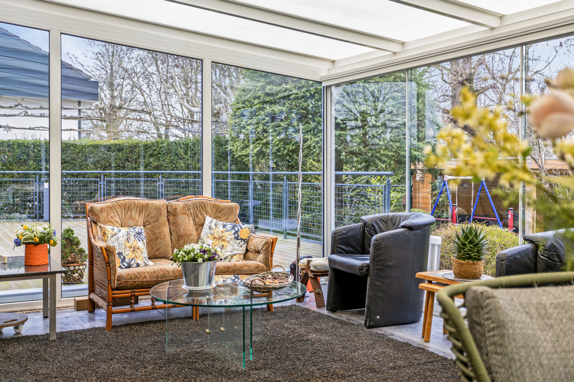Serre (11.70 x 3.85 m) voorzien van tegelvloer en volledig uitschuifbare glazen deuren zodat er een optimaal tuincontact is.