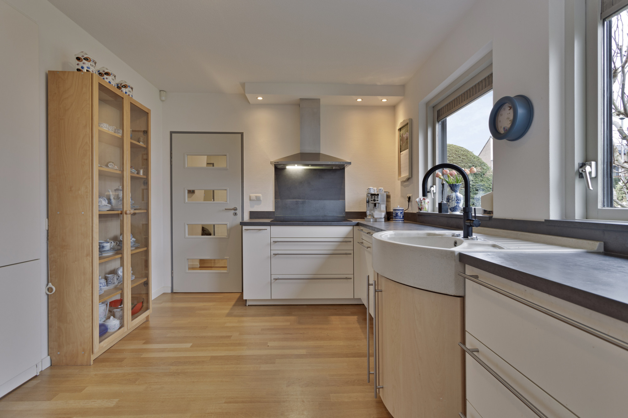 Keuken (3547 x 2.98 m) met ruime keukeninstallatie met vele handige vernuftige opbergmogelijkheden en inclusief inbouwapparatuur, te weten: combi oven, inductie kookplaat, RVS afzuigkap, koelkast met vriesvak, vaatwasser en close-in boiler.