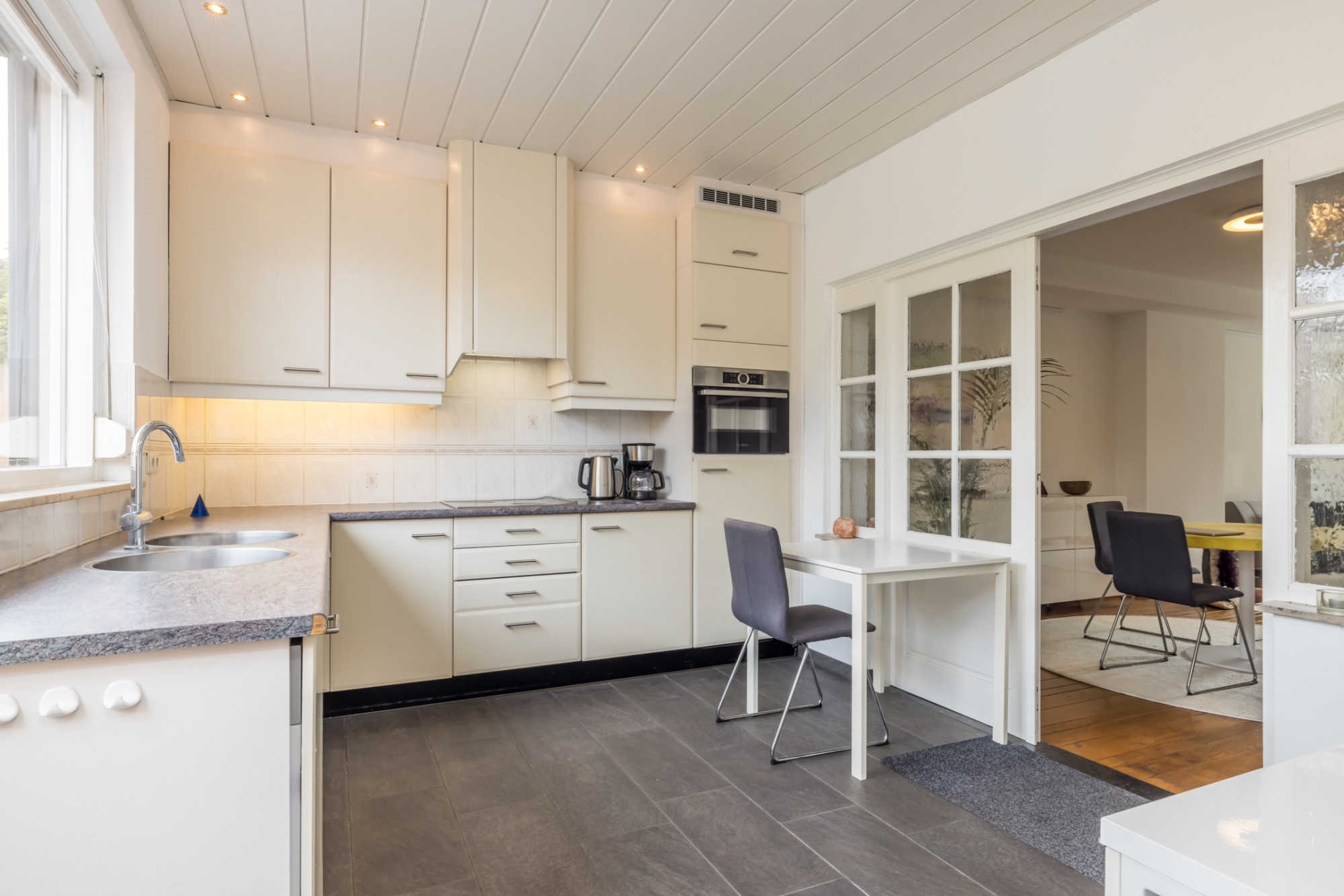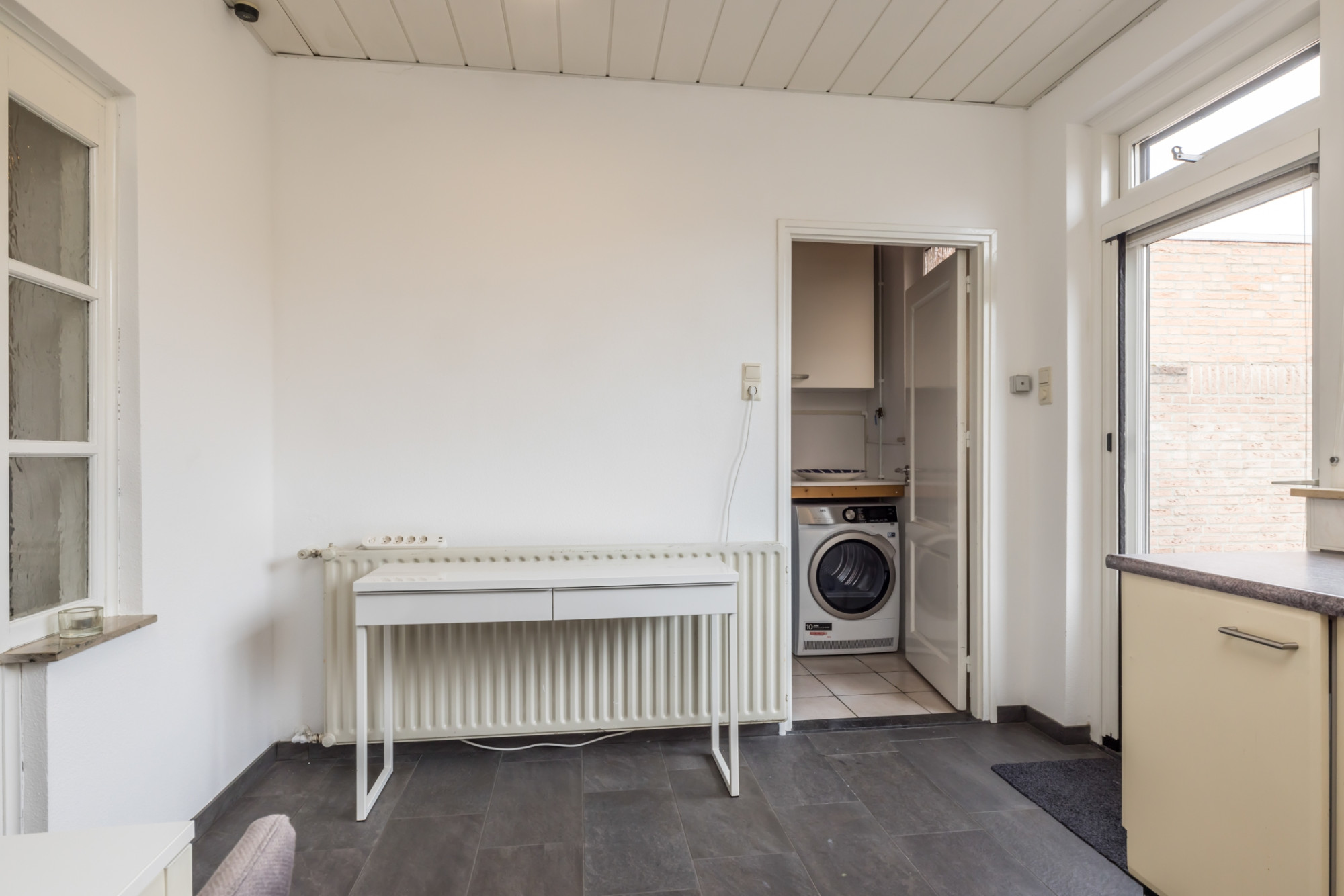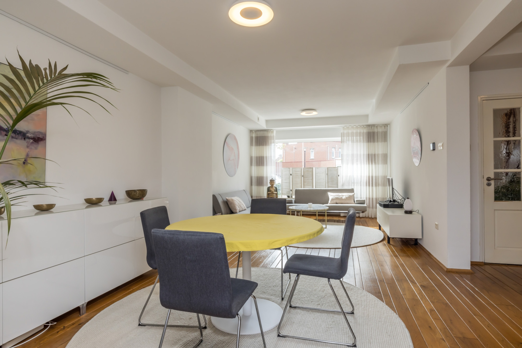Sfeervolle woonkamer met veel lichtinval en parketvloer. Uitgebouwde keuken met L-vormige opstelling en de volgende apparatuur: inductiekookplaat, afzuigkap, koelkast, vaatwasser en oven. Bijkeuken met voldoende bergruimte en aansluitpunten voor de wasapparatuur.